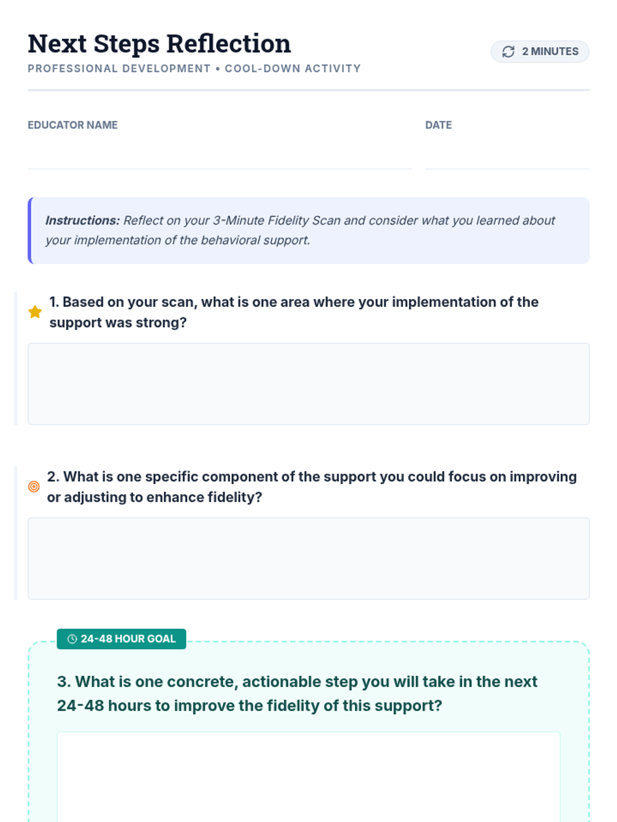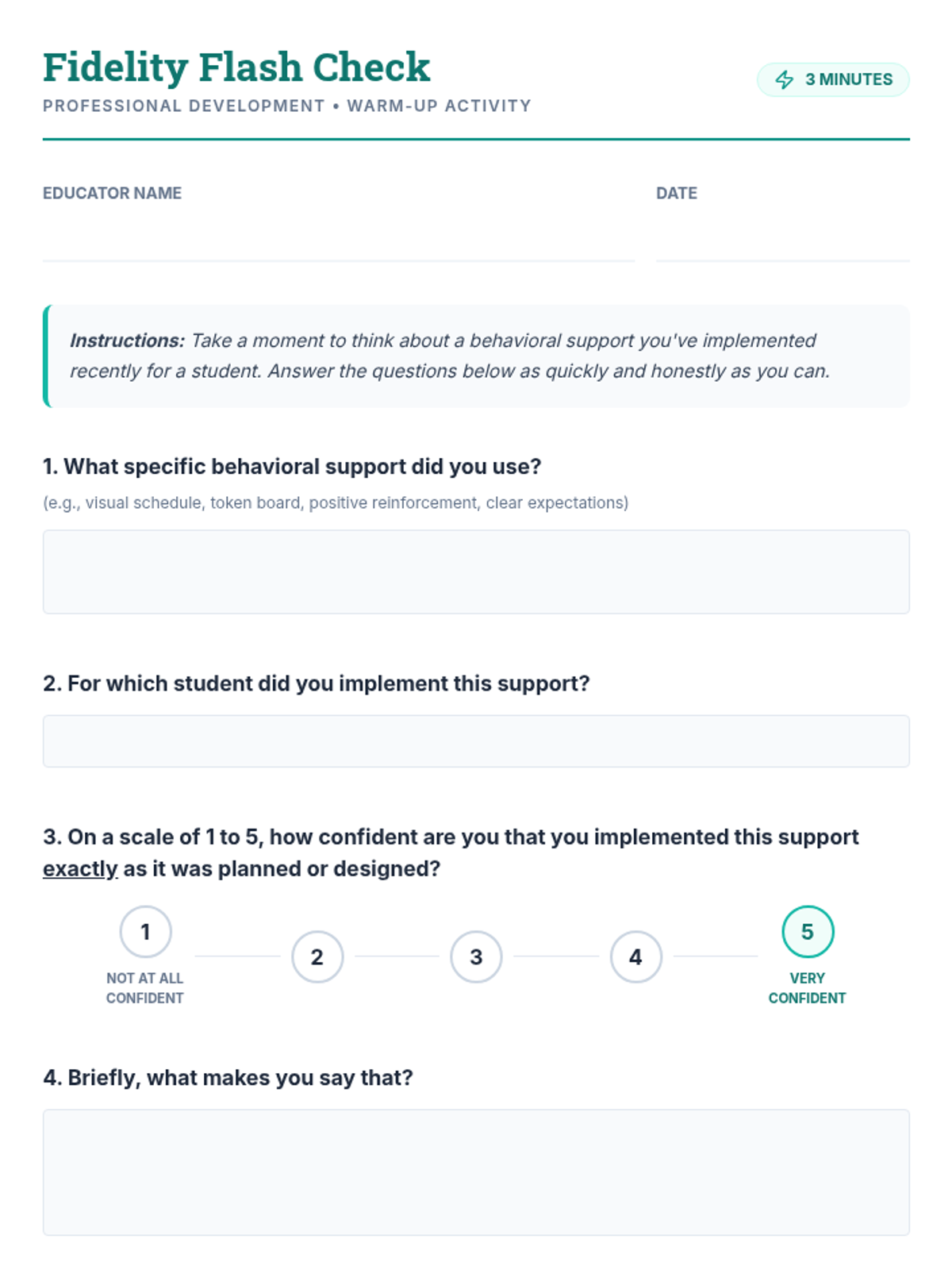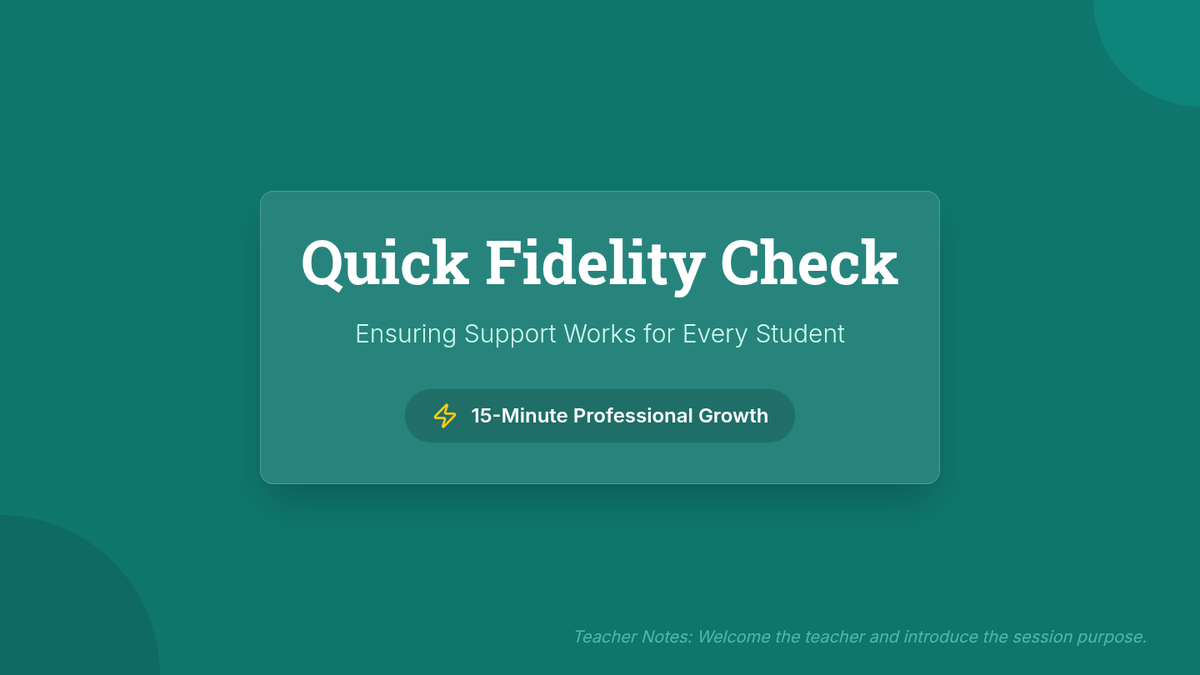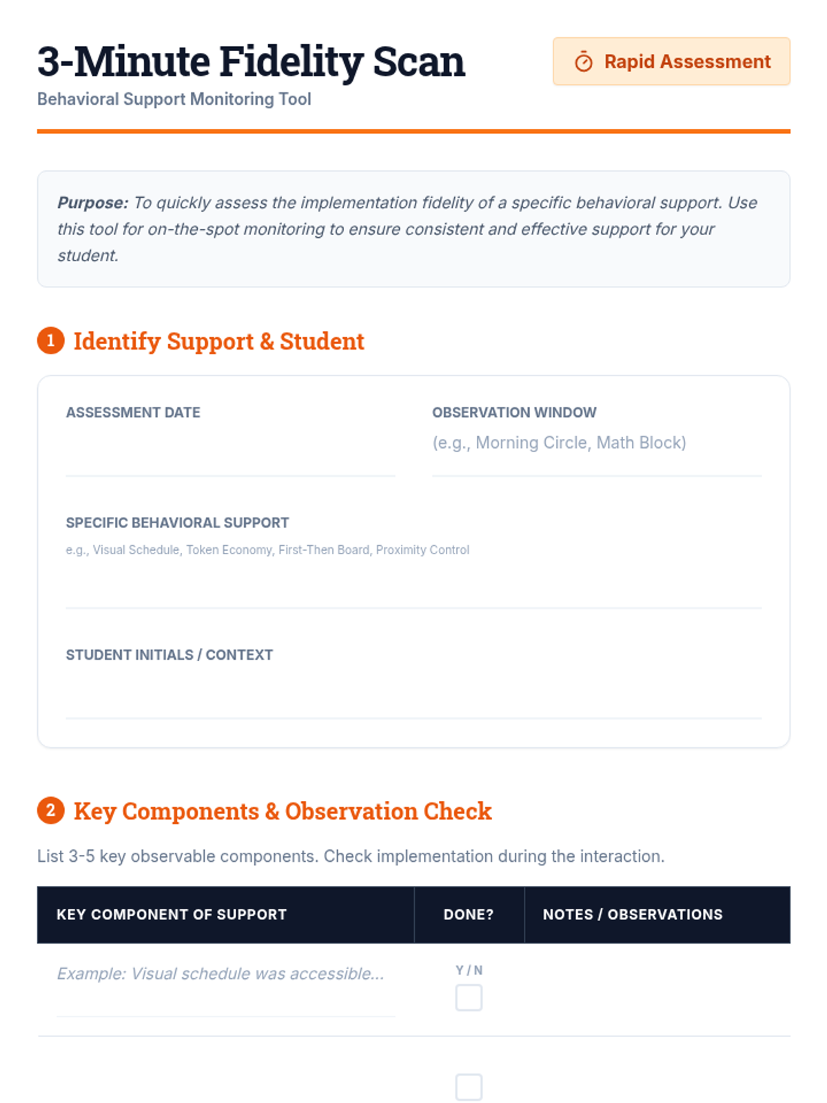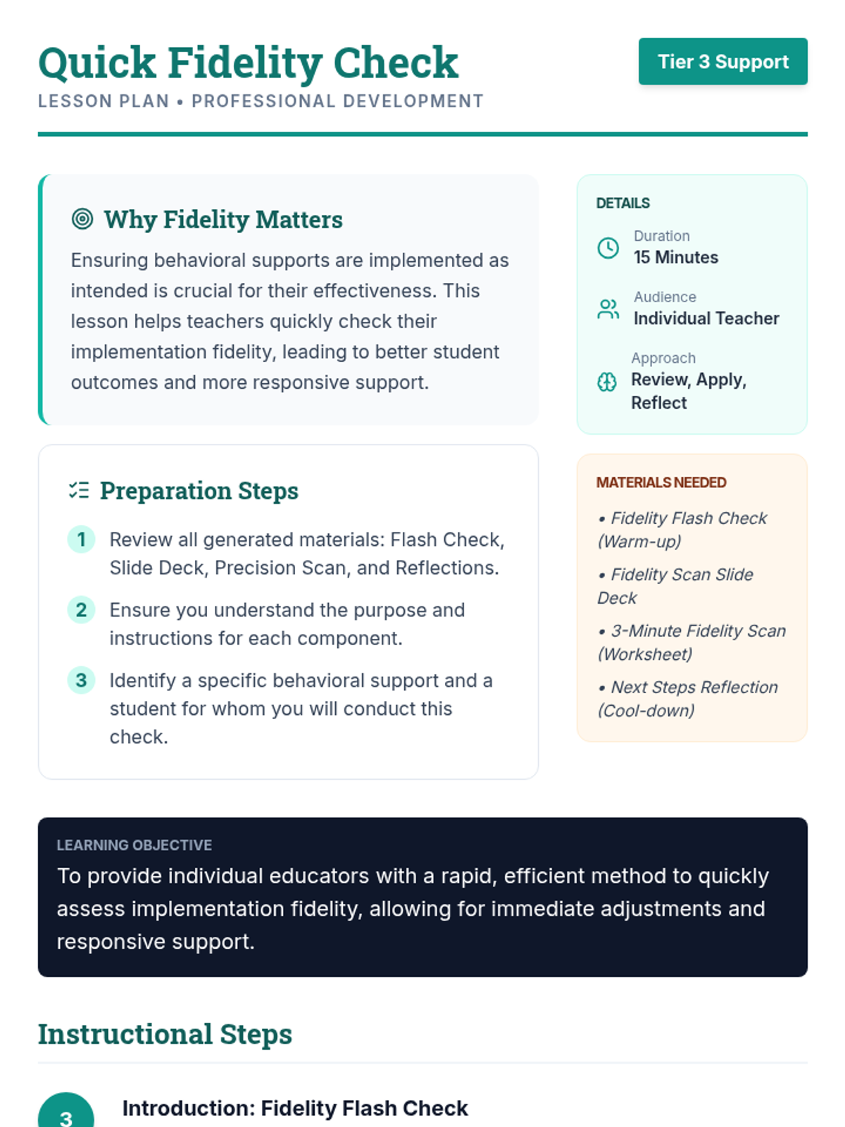 A rapid, 15-minute professional development session for individual educators to assess the implementation fidelity of behavioral supports. This lesson provides a practical tool for on-the-spot monitoring and immediate adjustment to ensure student success.