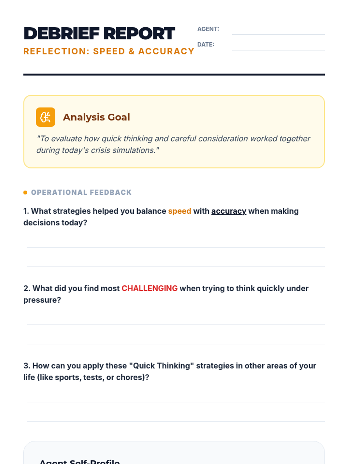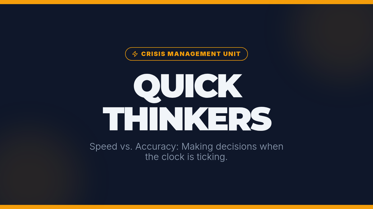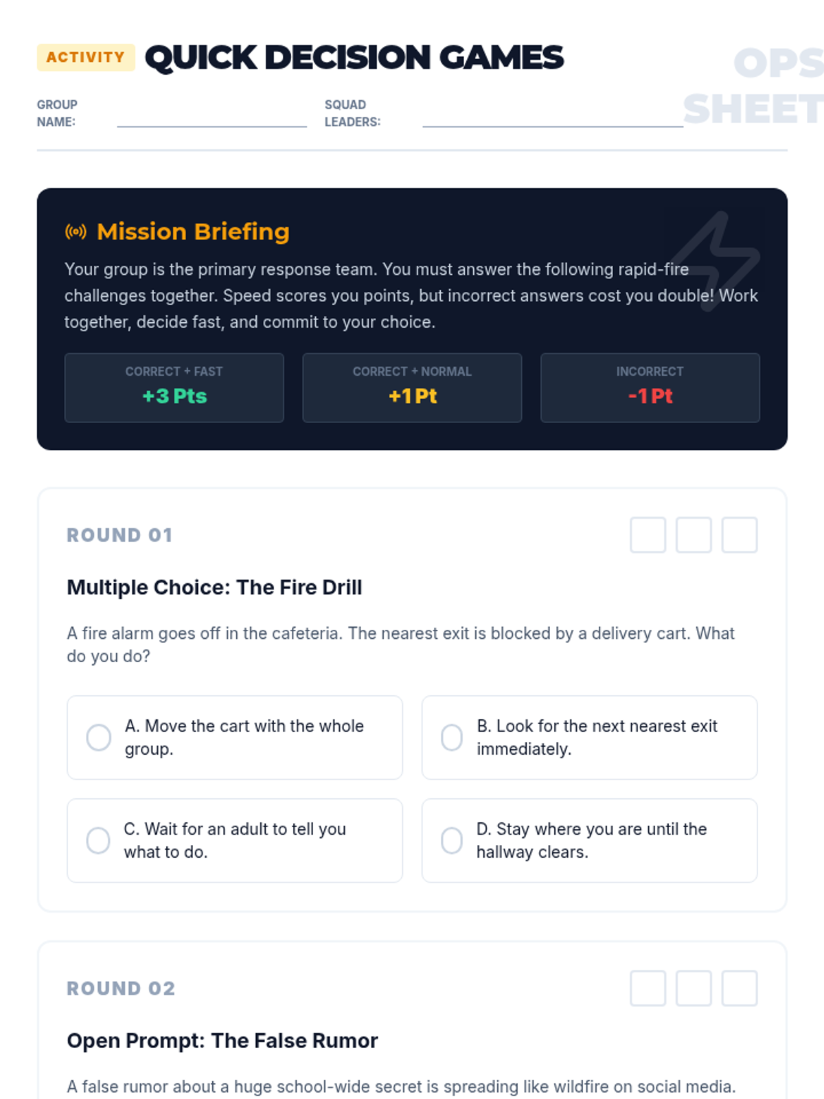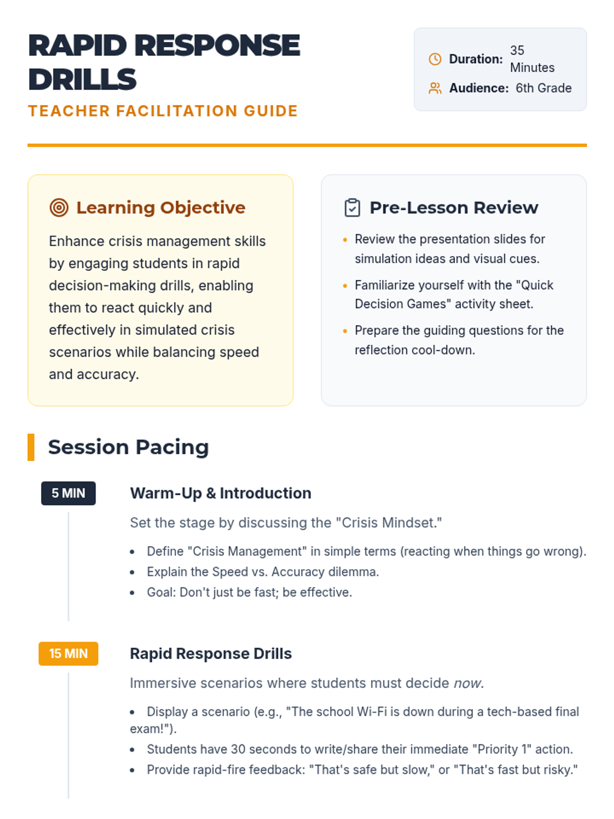A high-energy, fast-paced 35-minute lesson for 6th graders focused on developing rapid decision-making skills during simulated crisis scenarios. Students balance speed and accuracy through interactive drills and collaborative games.