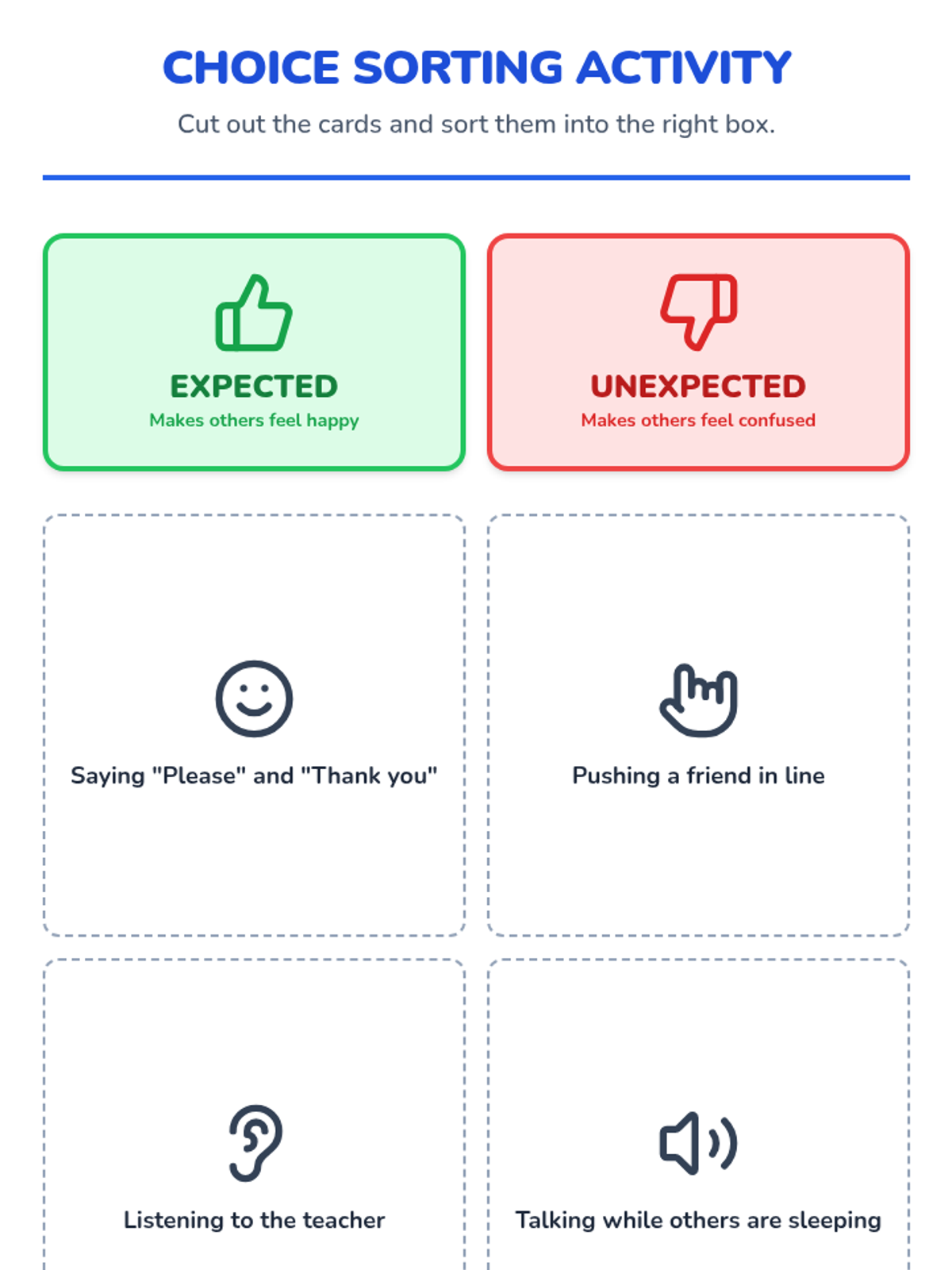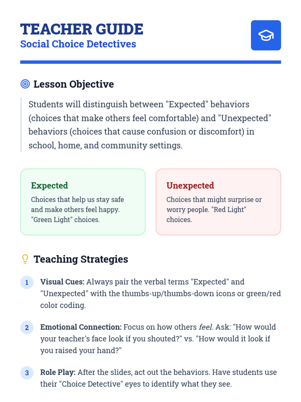 This lesson introduces the concept of expected and unexpected behaviors in three key settings: school, home, and the community. Designed for students with intellectual impairments, it uses simple visual cues and concrete examples to help students navigate social expectations.