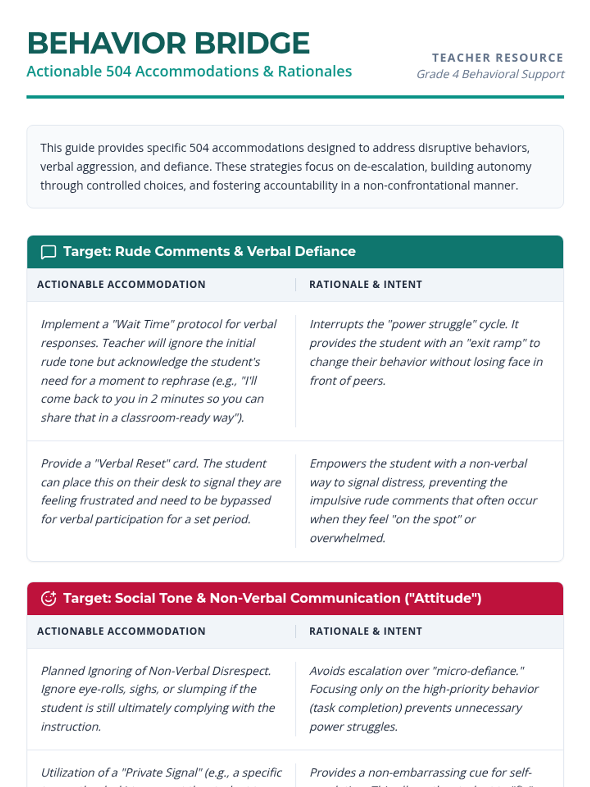 A comprehensive toolkit for teachers and 504 teams to support a 4th-grade student struggling with behavioral regulation, peer conflict, and defiance. Includes actionable accommodations with rationales, a student reflection tool, and a guide for navigating difficult parent communication.