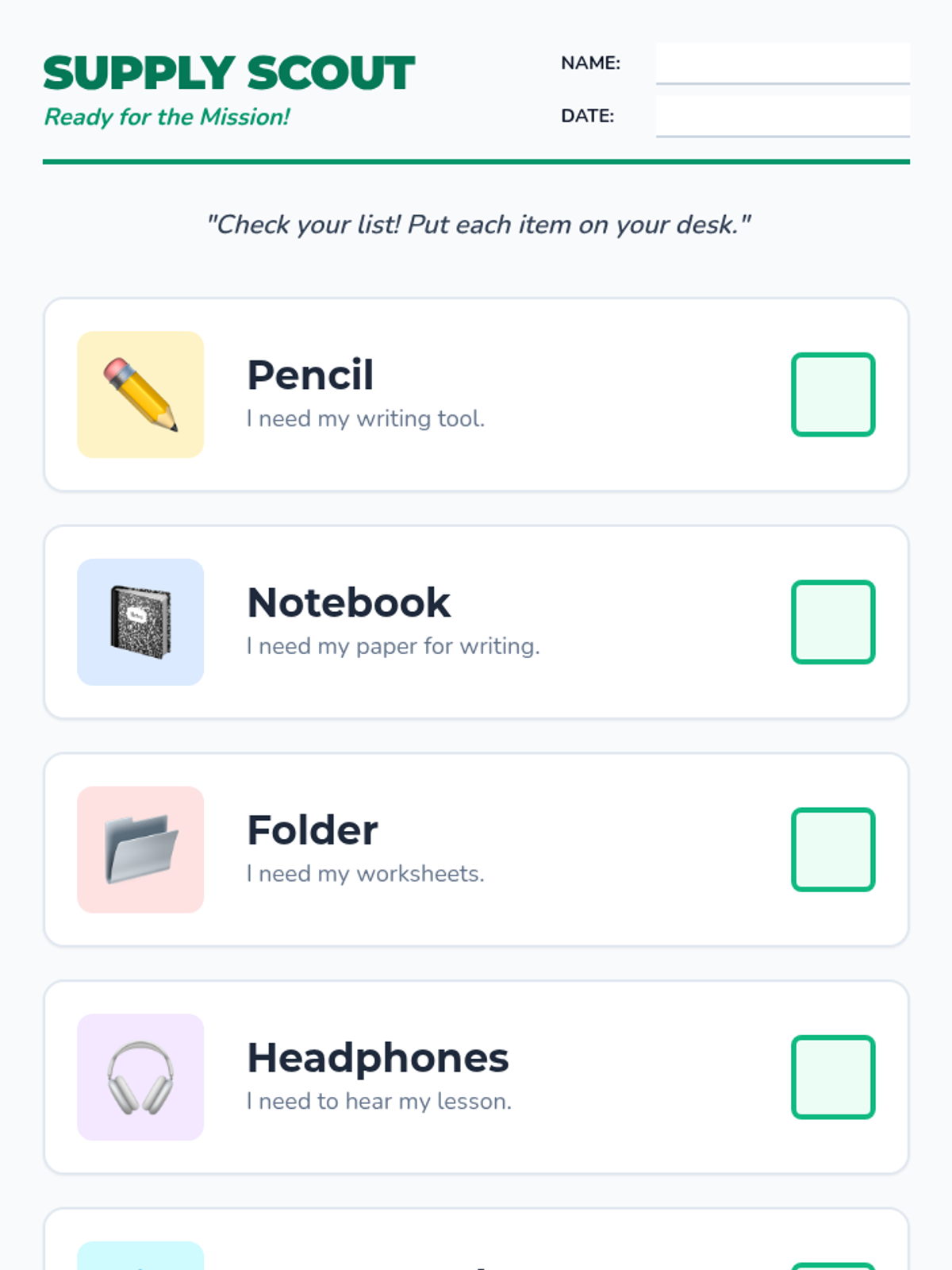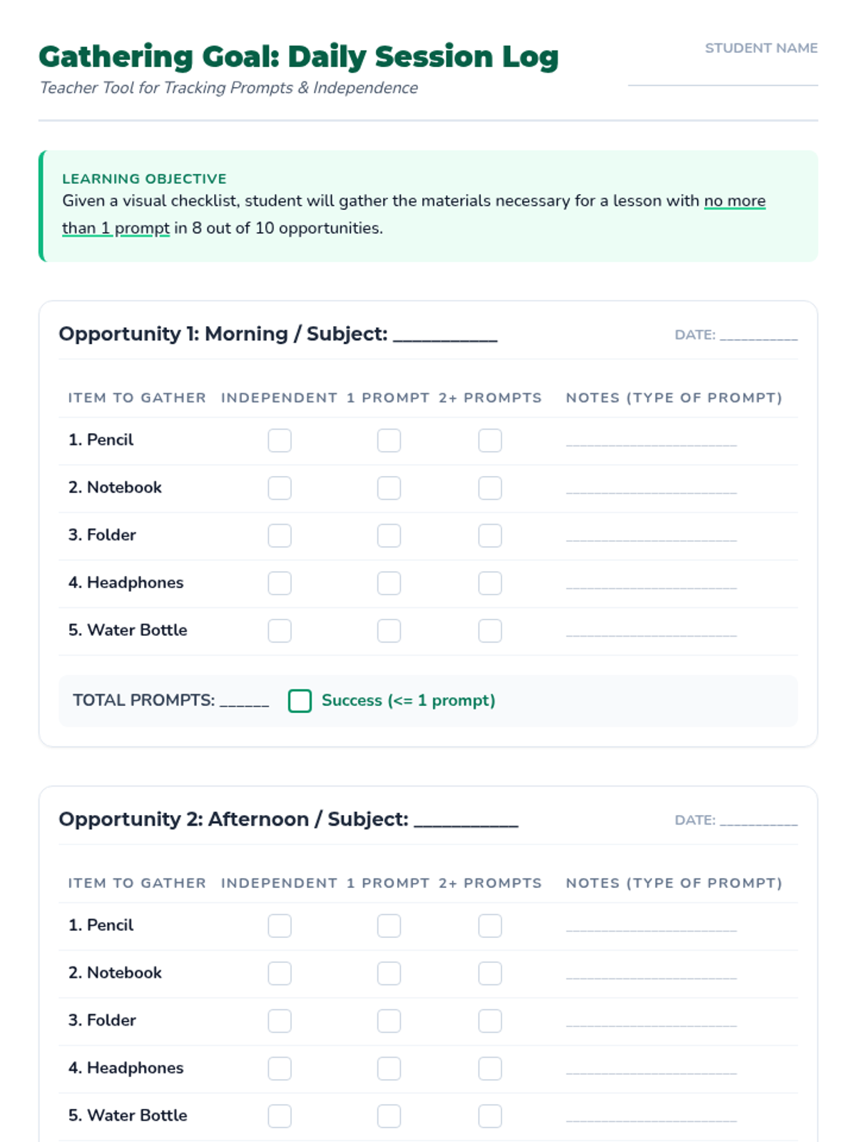 A set of data tracking and visual support materials for a 3rd-grade student working on gathering lesson materials independently using a checklist.