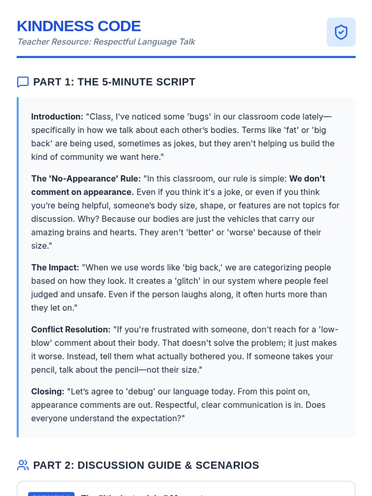 A quick-response lesson designed to address body-shaming and promote respectful communication in the classroom through a 10-minute script and discussion.