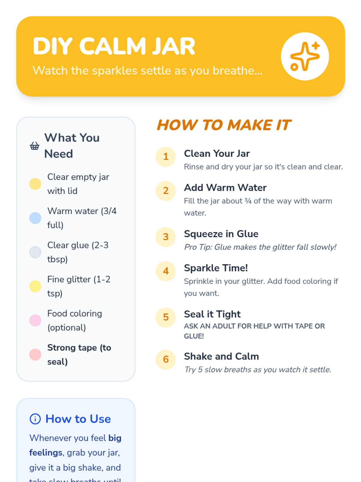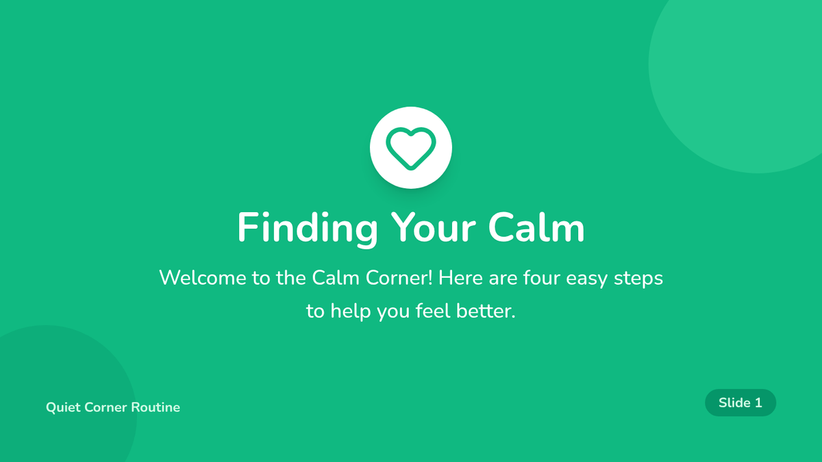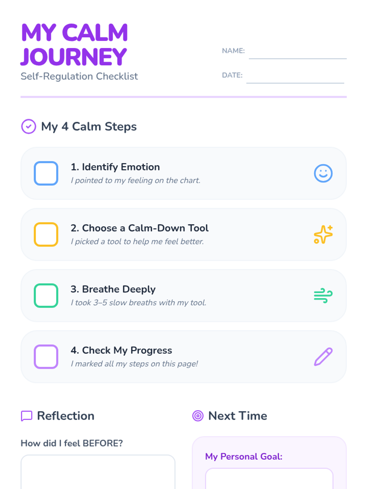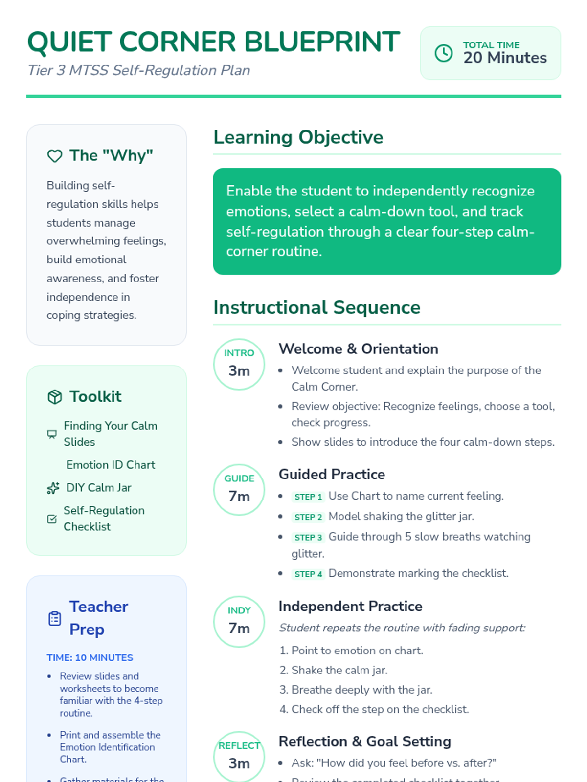 An individualized Tier 3 MTSS intervention designed for 2nd grade students to learn self-regulation through a structured calm-down corner routine, including visual aids and hands-on tools.