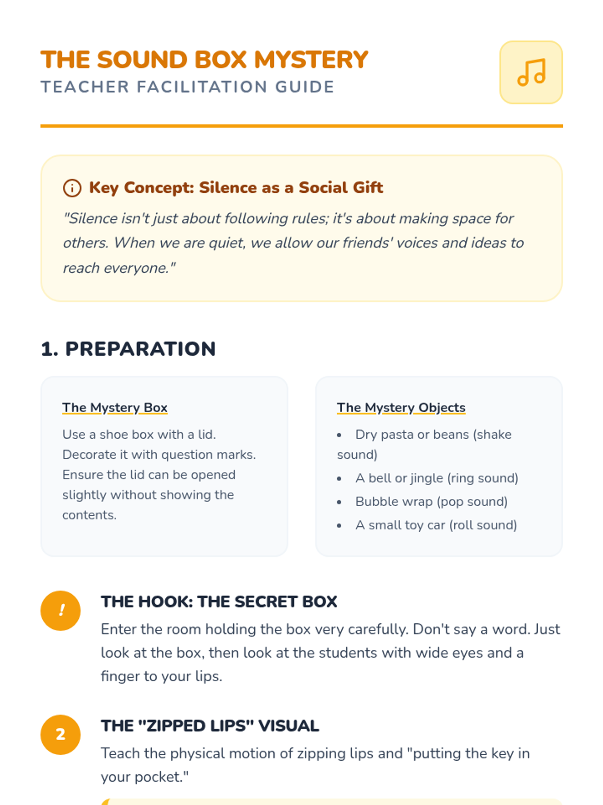 Focuses on impulse control and auditory discrimination by challenging students to maintain a 'quiet mouth' to hear subtle sounds. Students learn that silence is a gift we give to our friends so they can be heard.