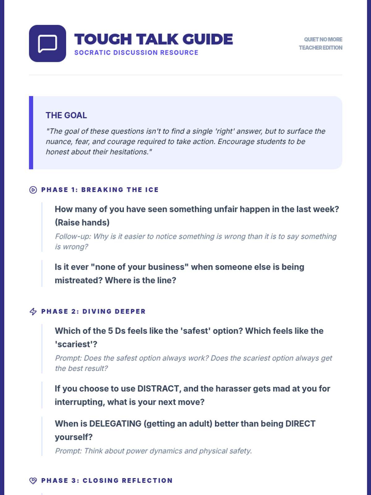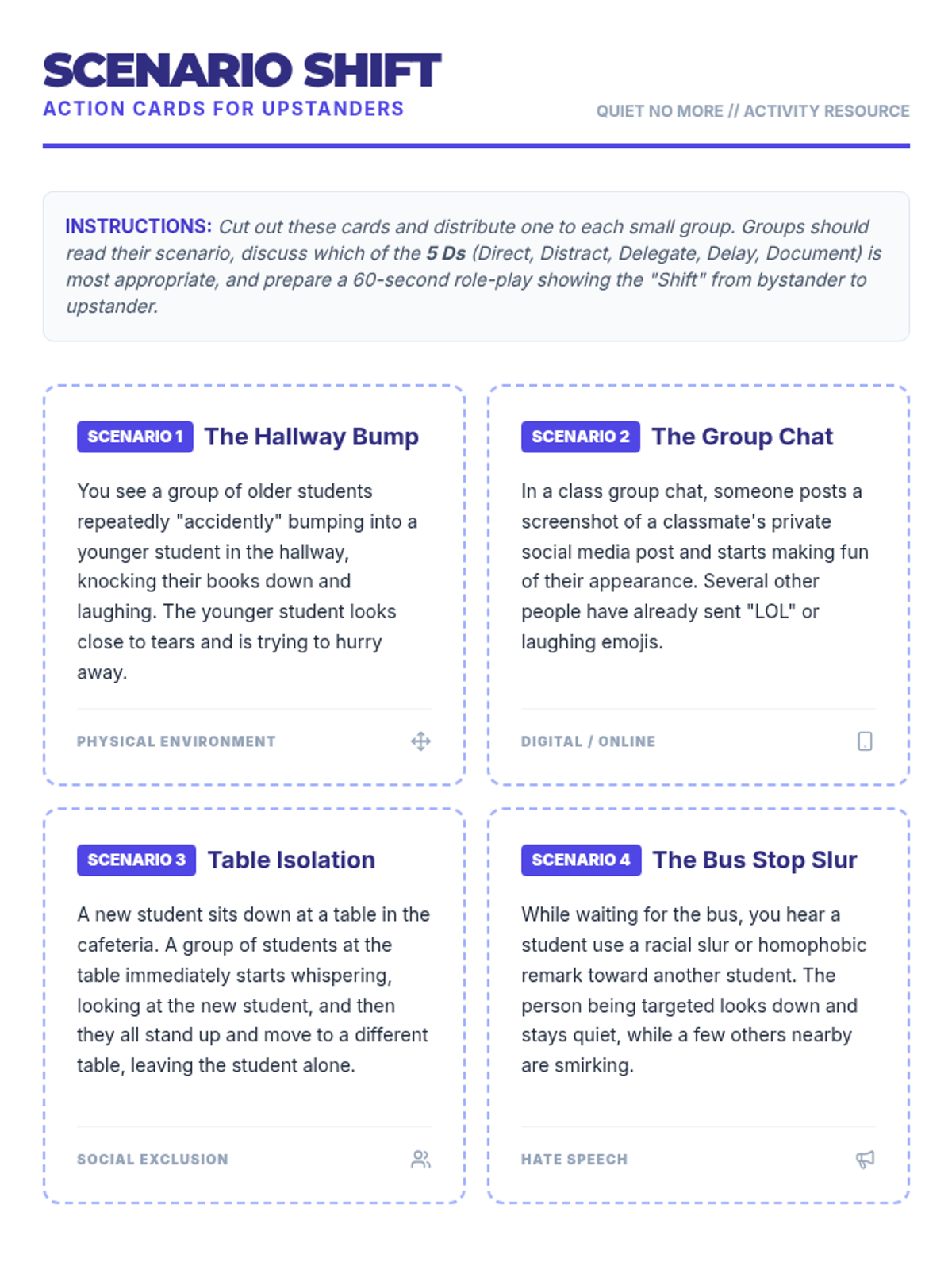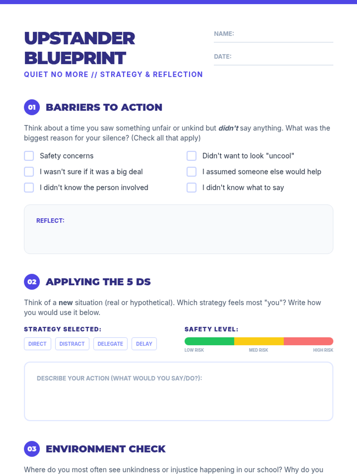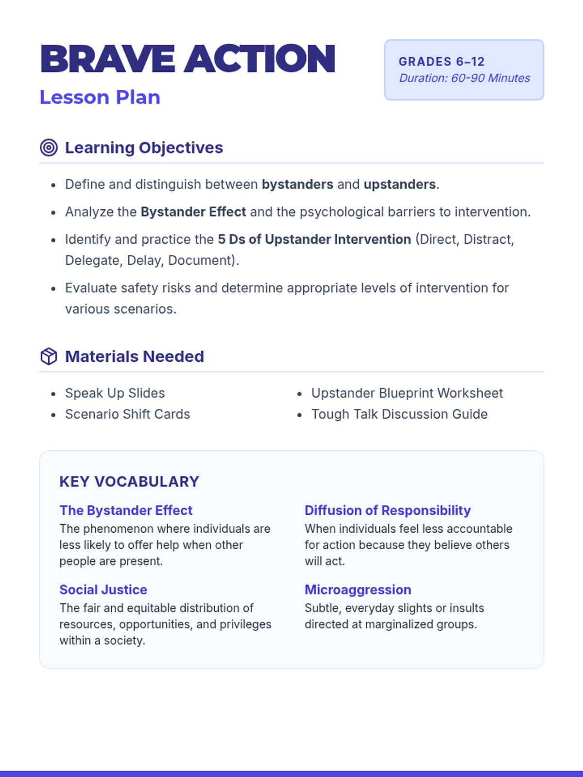 A comprehensive lesson designed to transform students from passive observers into active upstanders. Students will learn to identify injustice, understand the psychological barriers to intervention, and master safe strategies for taking action in their schools and communities.