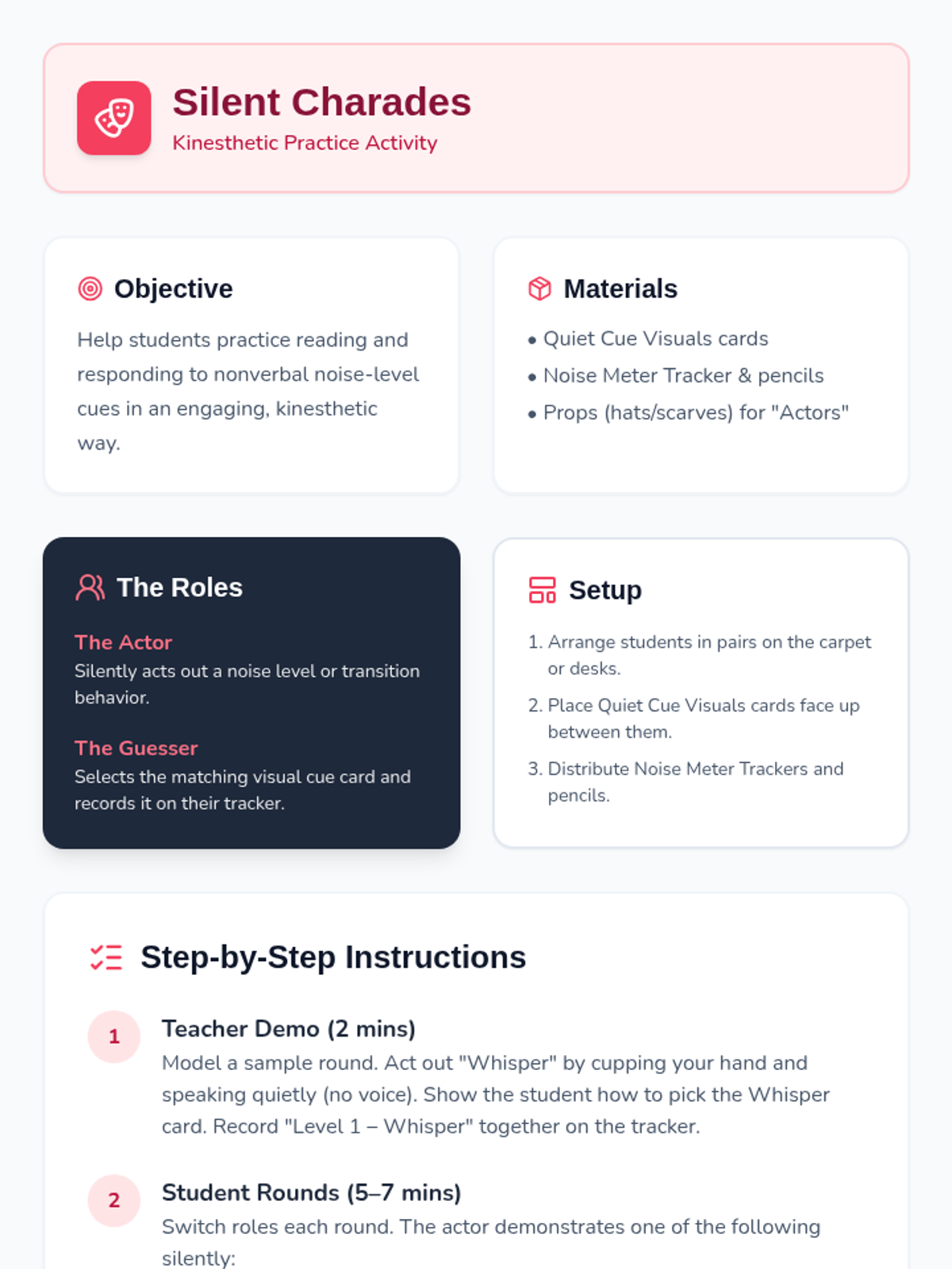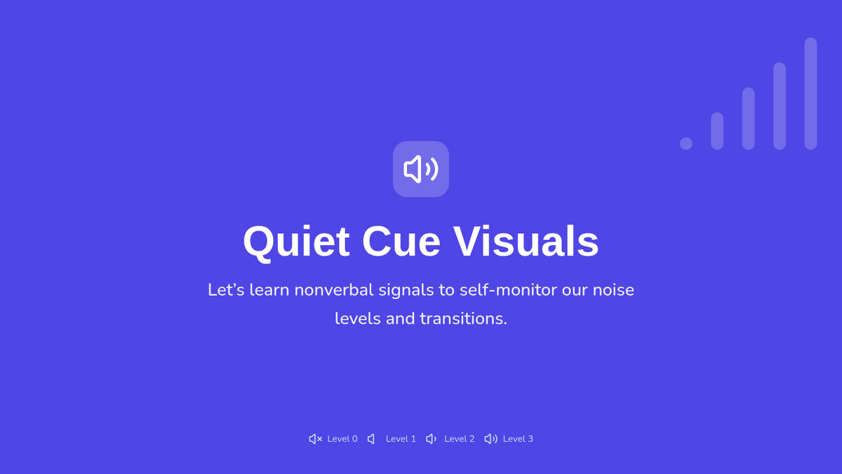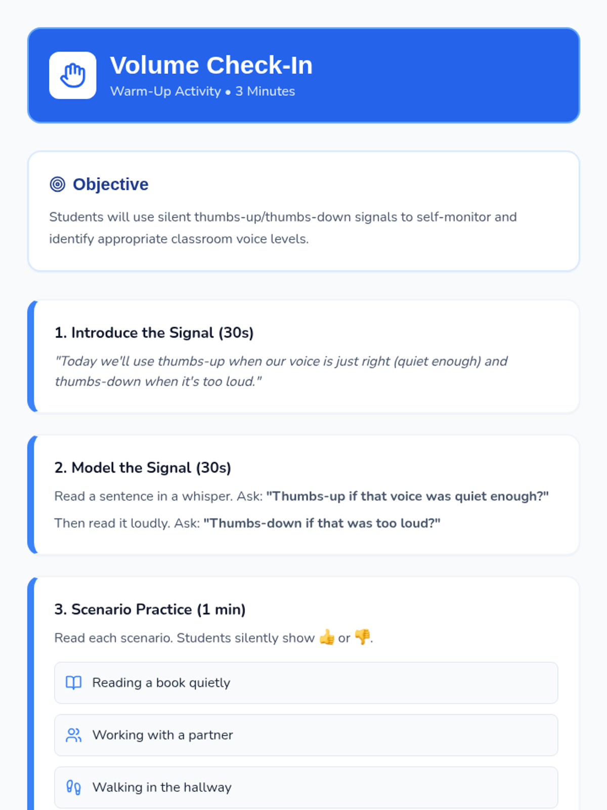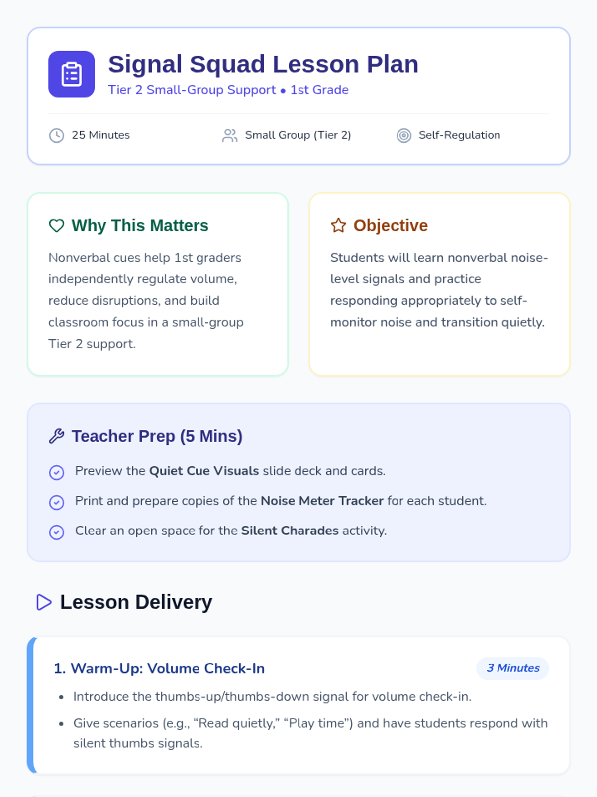 A Tier 2 small-group lesson for 1st graders to learn and practice nonverbal noise-level signals for better self-regulation and smoother transitions.
