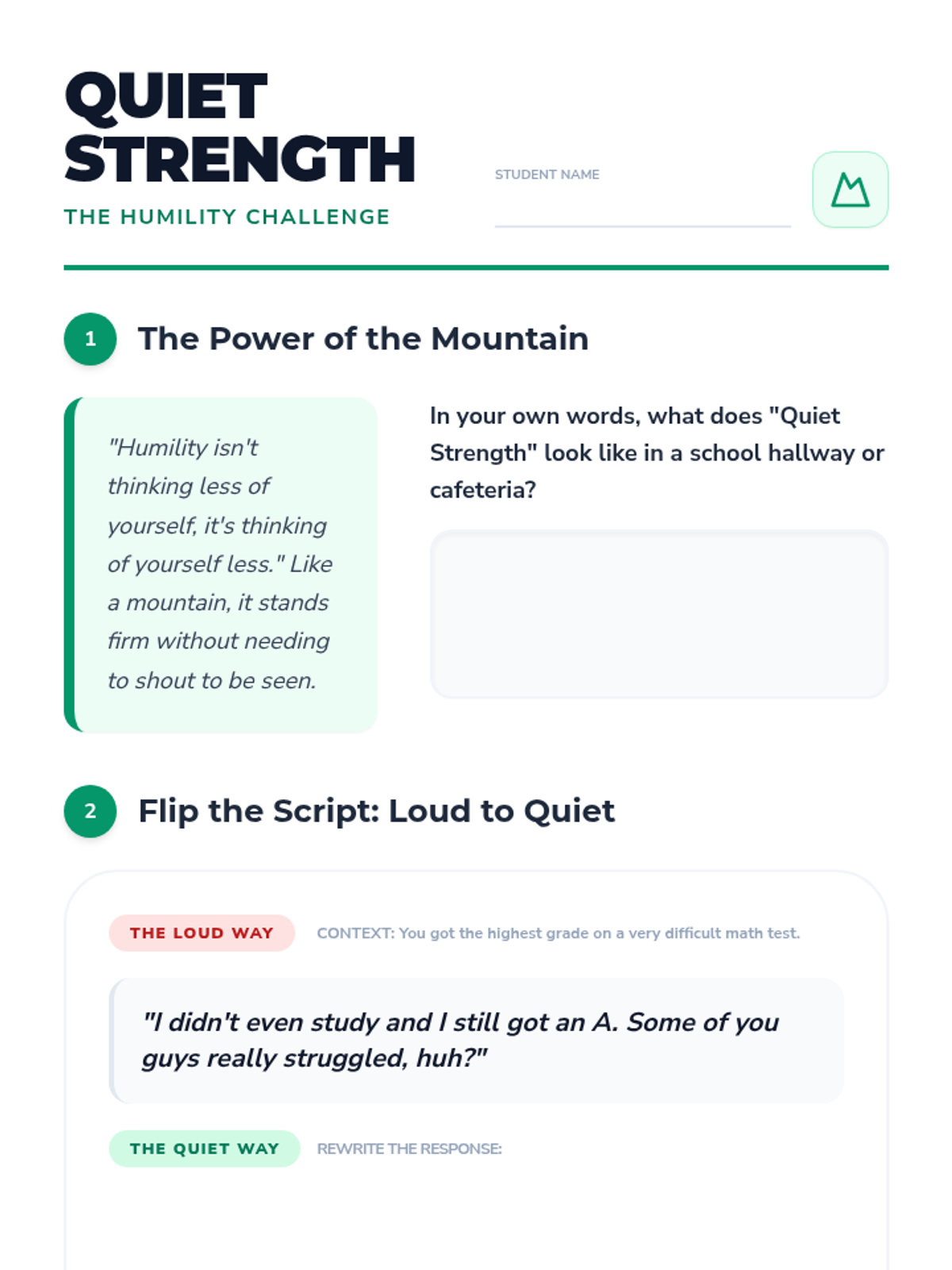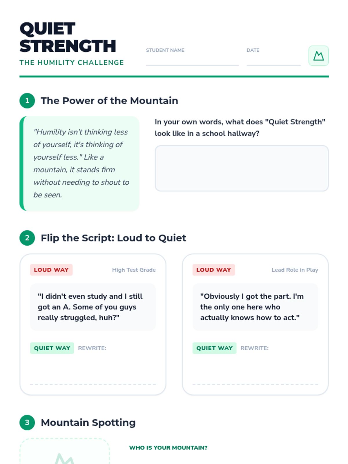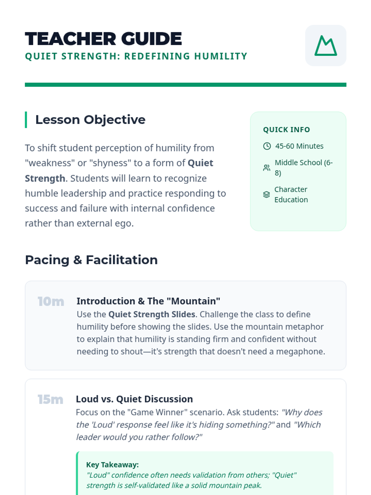 A lesson focused on redefining humility for middle schoolers as a form of 'quiet strength' rather than weakness. Students will explore scenarios, compare loud versus quiet reactions, and identify humble leaders in history and their own lives.