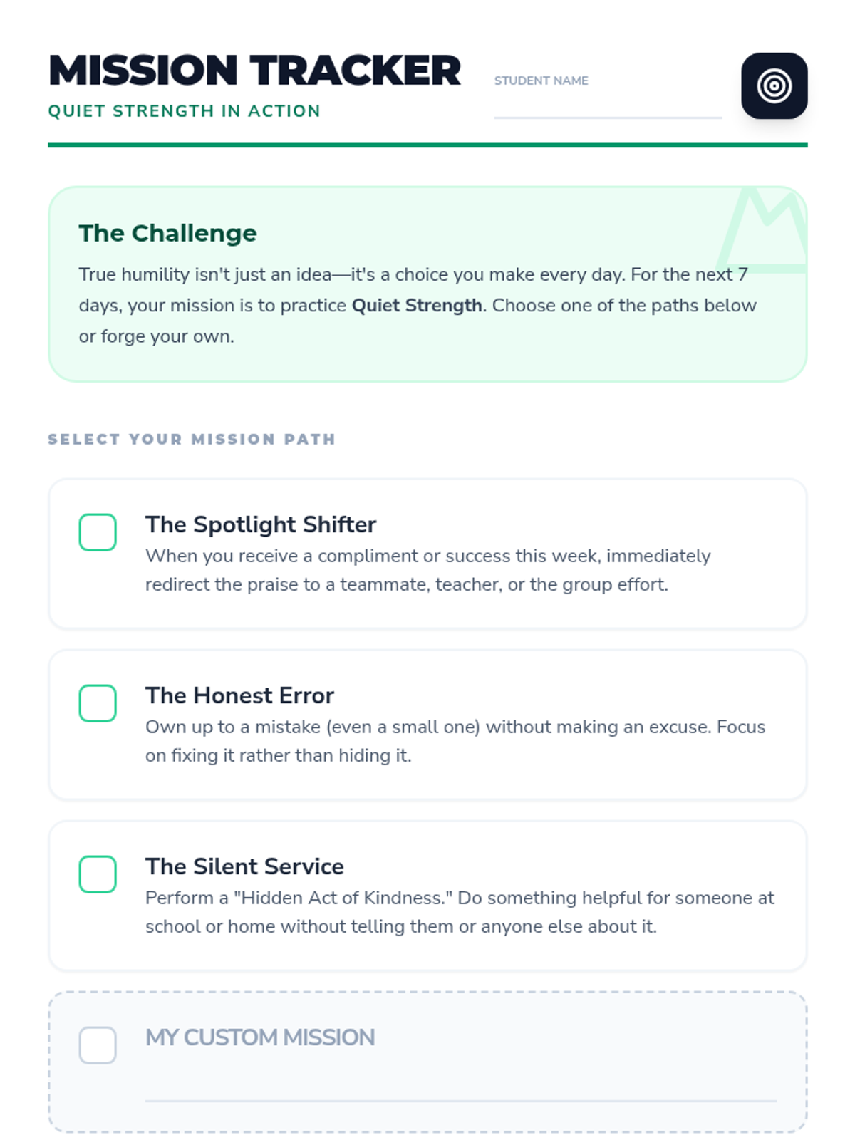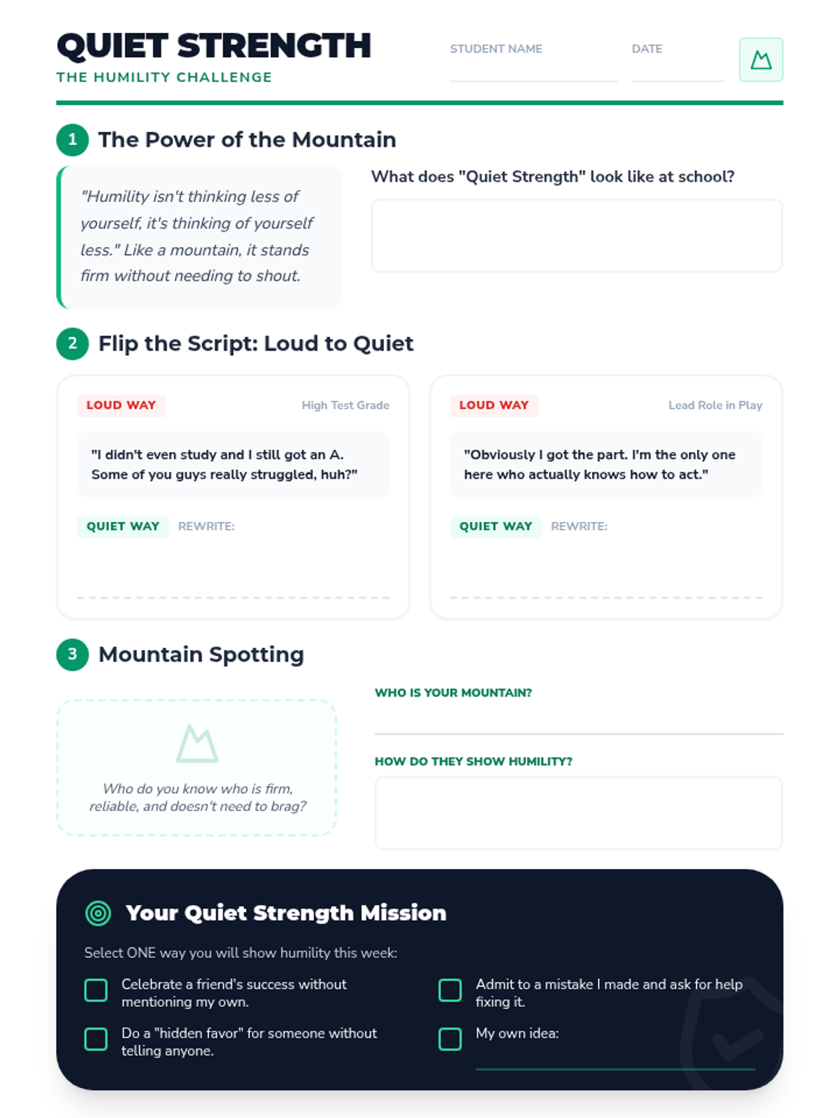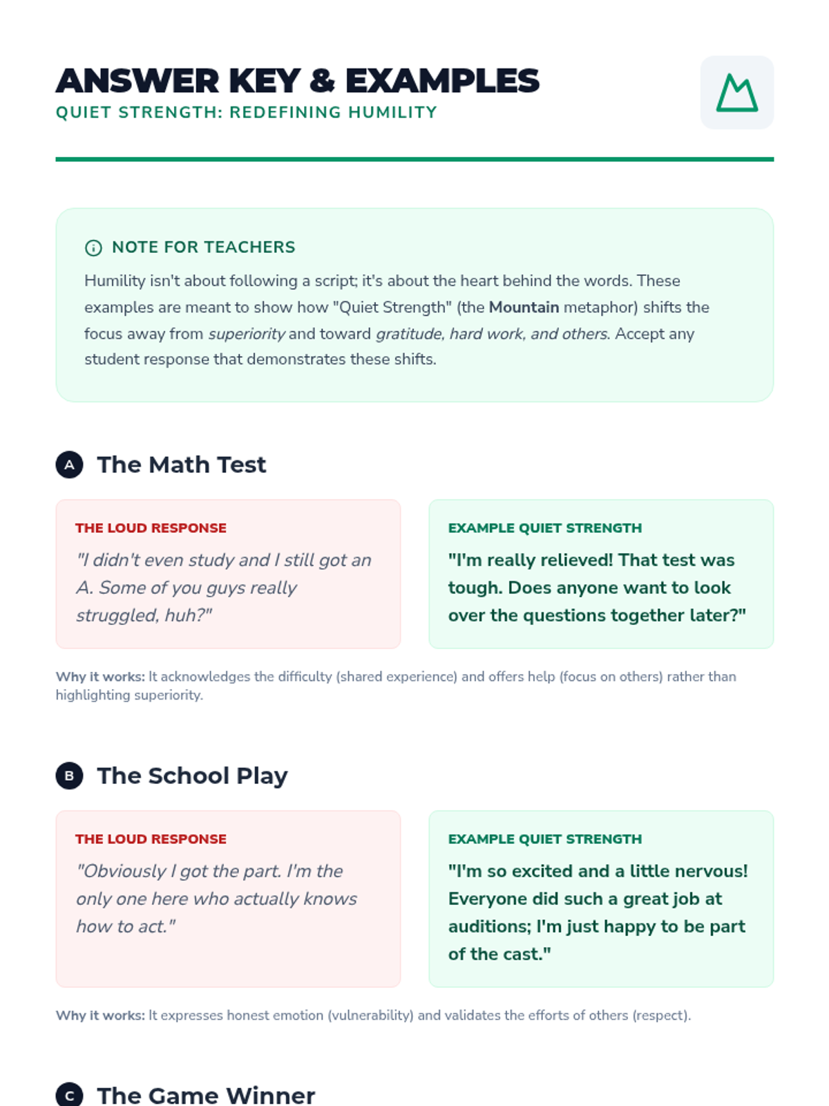 A lesson focused on redefining humility for middle schoolers as a form of 'quiet strength' rather than weakness. Students will explore scenarios, compare loud versus quiet reactions, and identify humble leaders in history and their own lives.