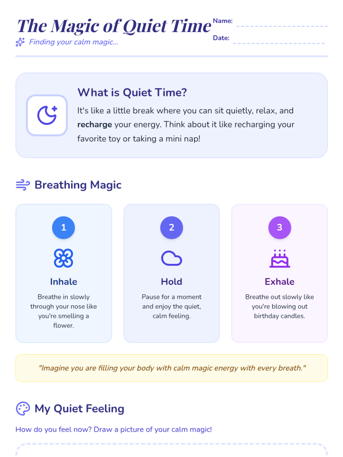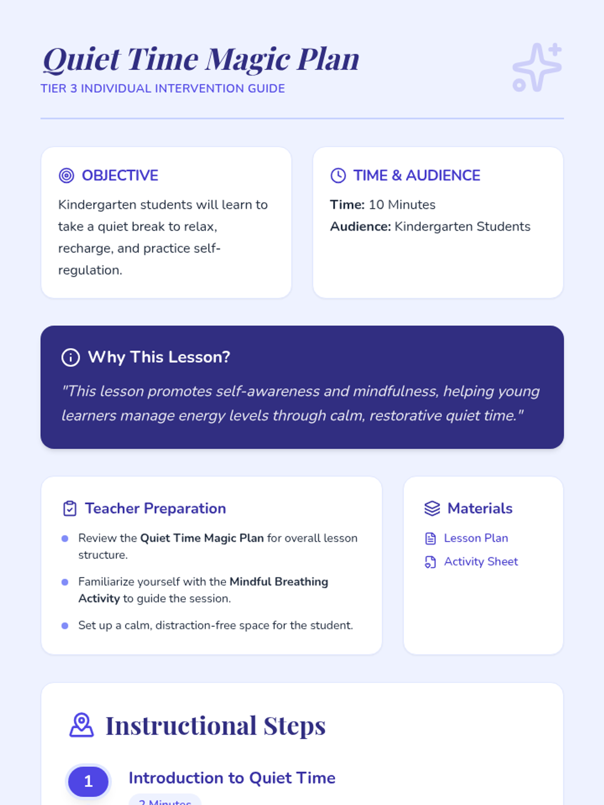A Tier 3 individual intervention designed for kindergartners to learn self-regulation and mindfulness through restorative quiet time and guided breathing.