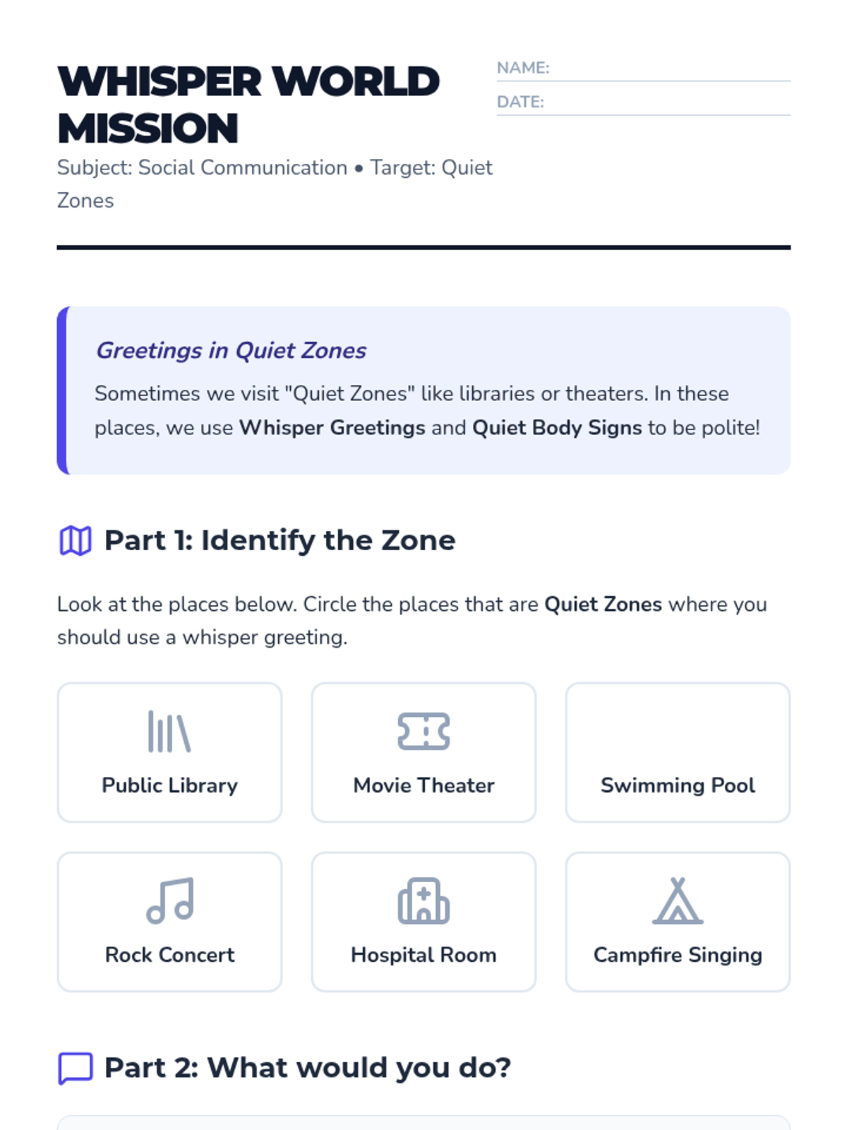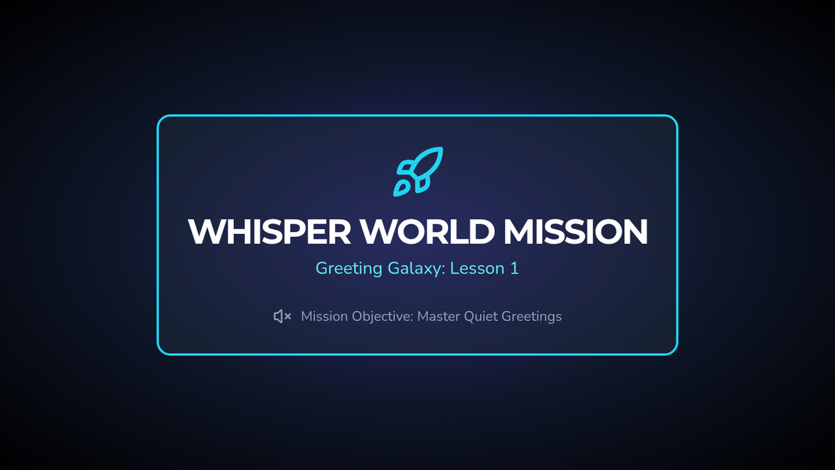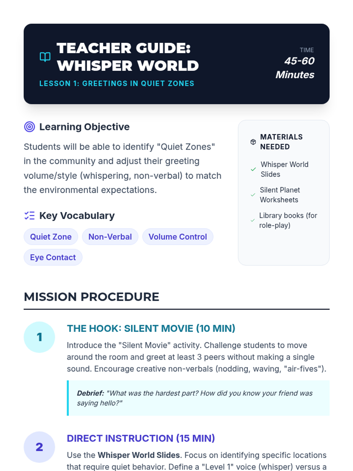 Students explore 'The Silent Planet' where they learn to use whisper greetings and non-verbal cues in quiet environments like libraries and theaters.