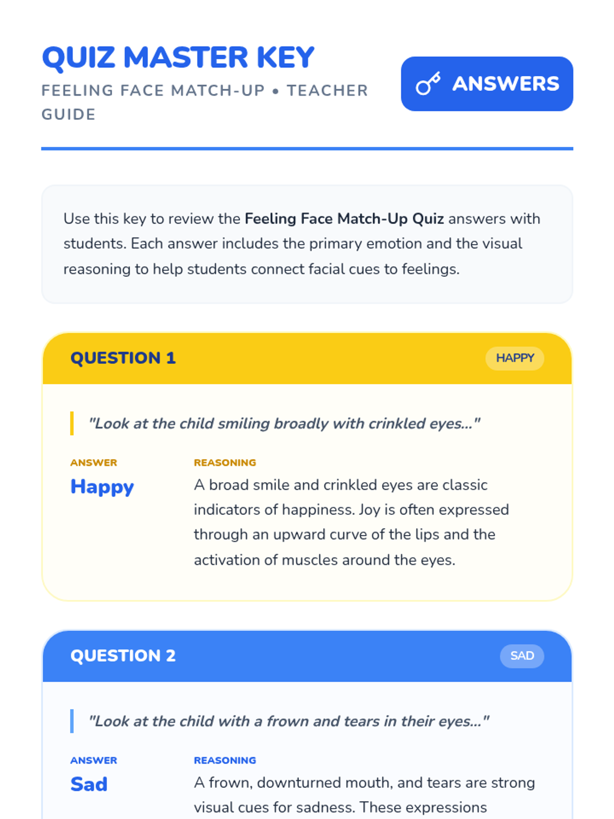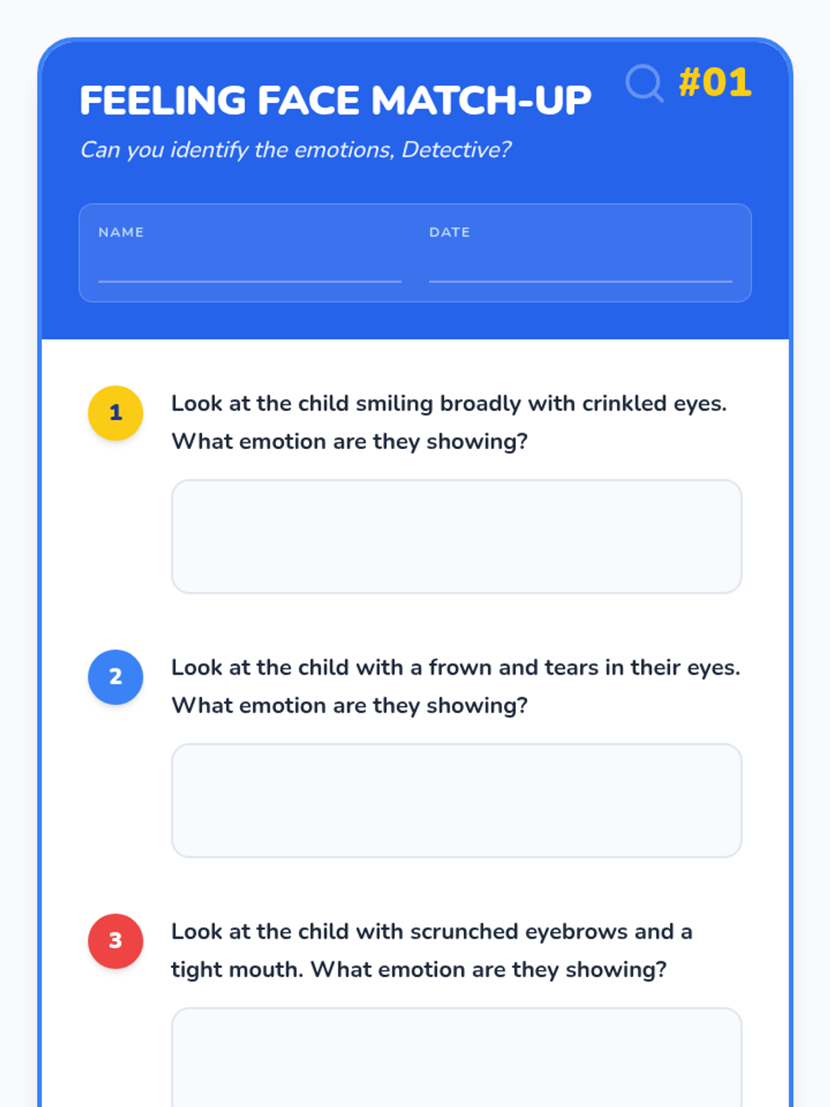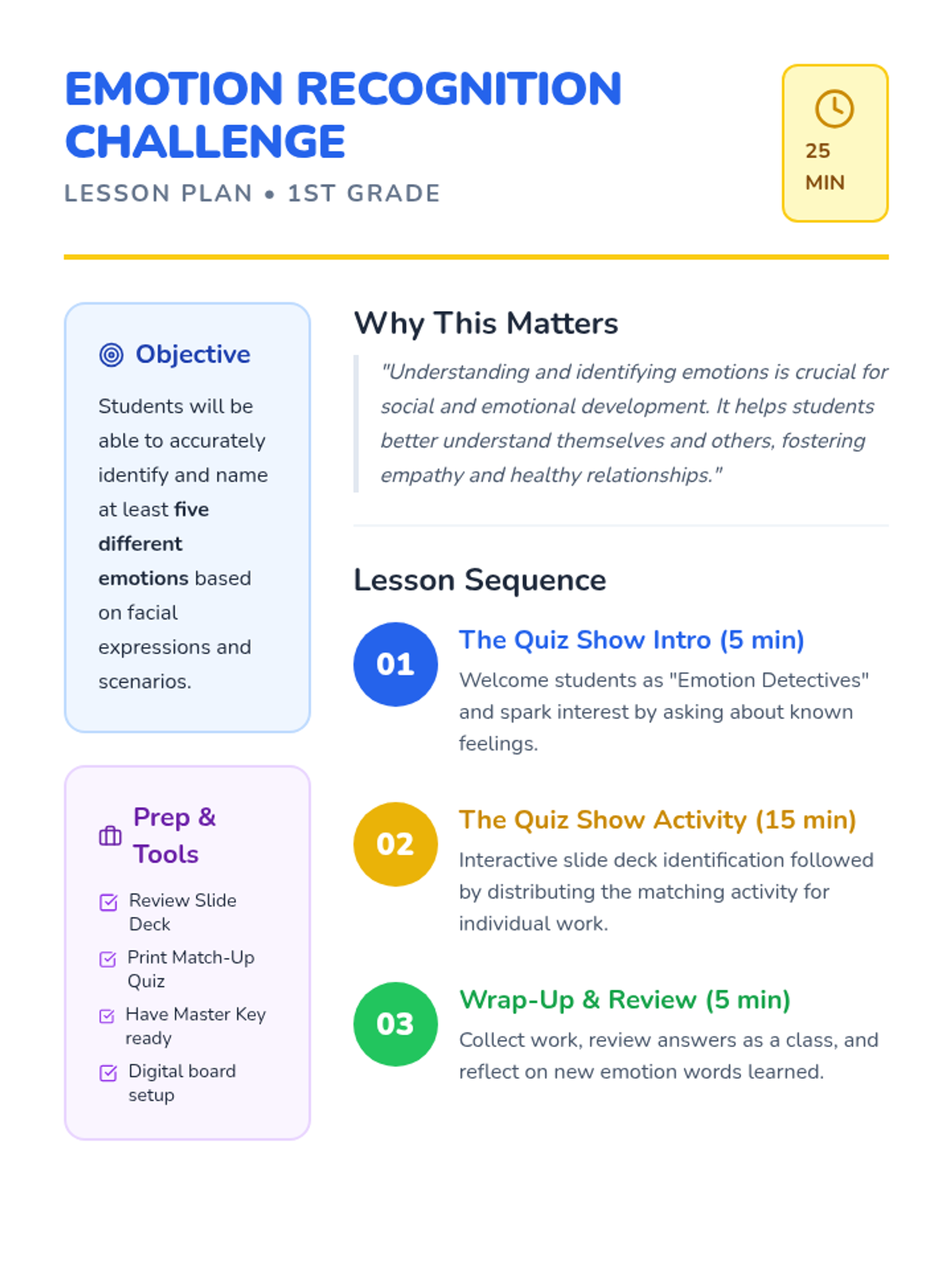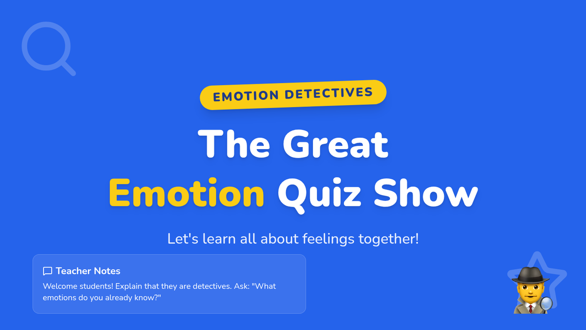A fun, interactive 1st-grade lesson where students become 'Emotion Detectives' to identify and name feelings through a quiz show and matching activity.