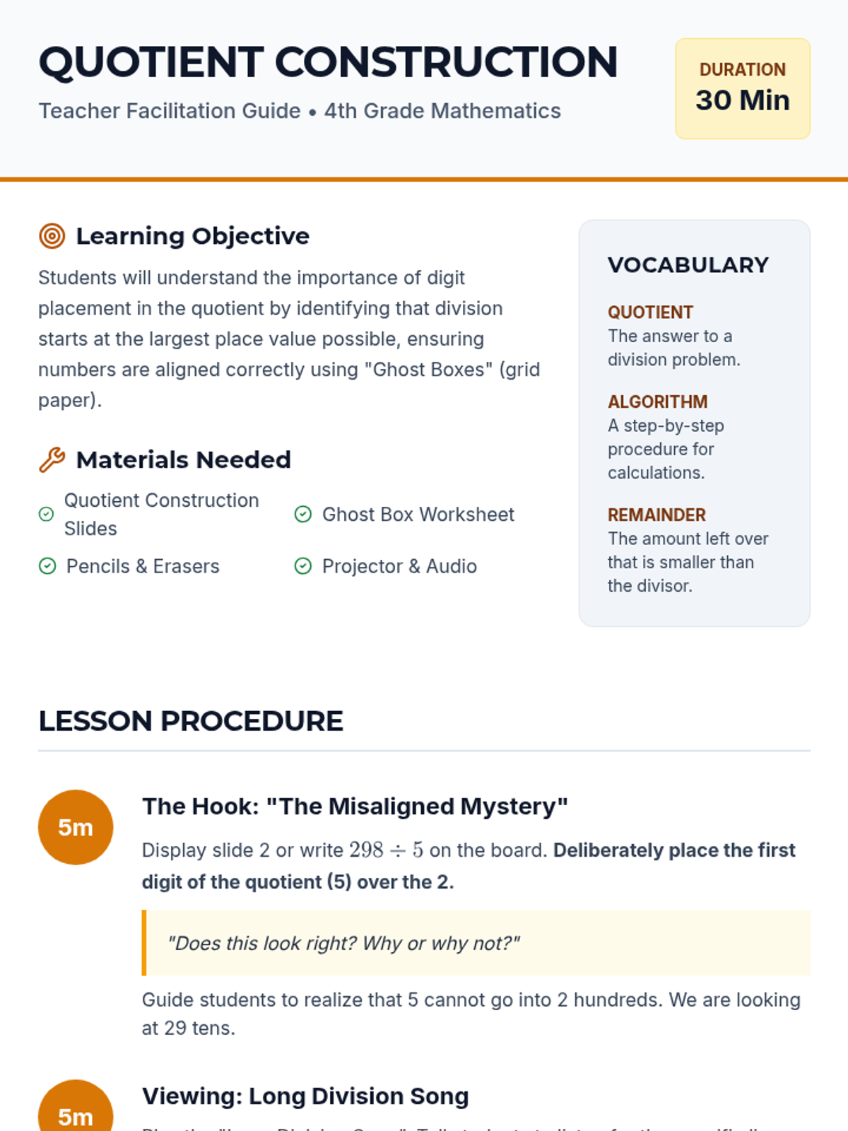 A 4th-grade math lesson focused on the precision of digit placement in long division using the 'Ghost Box' method and a catchy musical guide. Students learn to align quotients correctly by understanding place value within the long division algorithm.