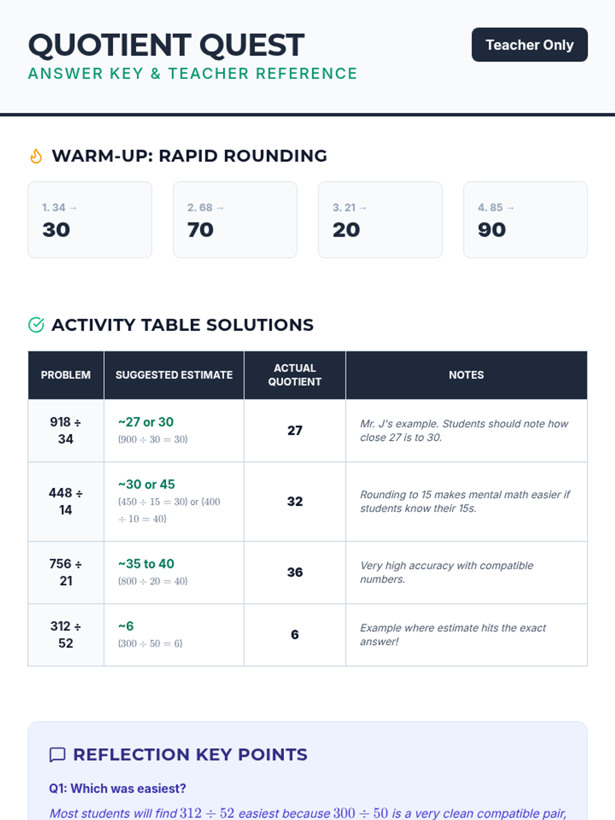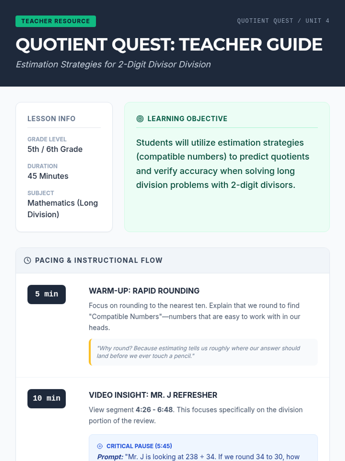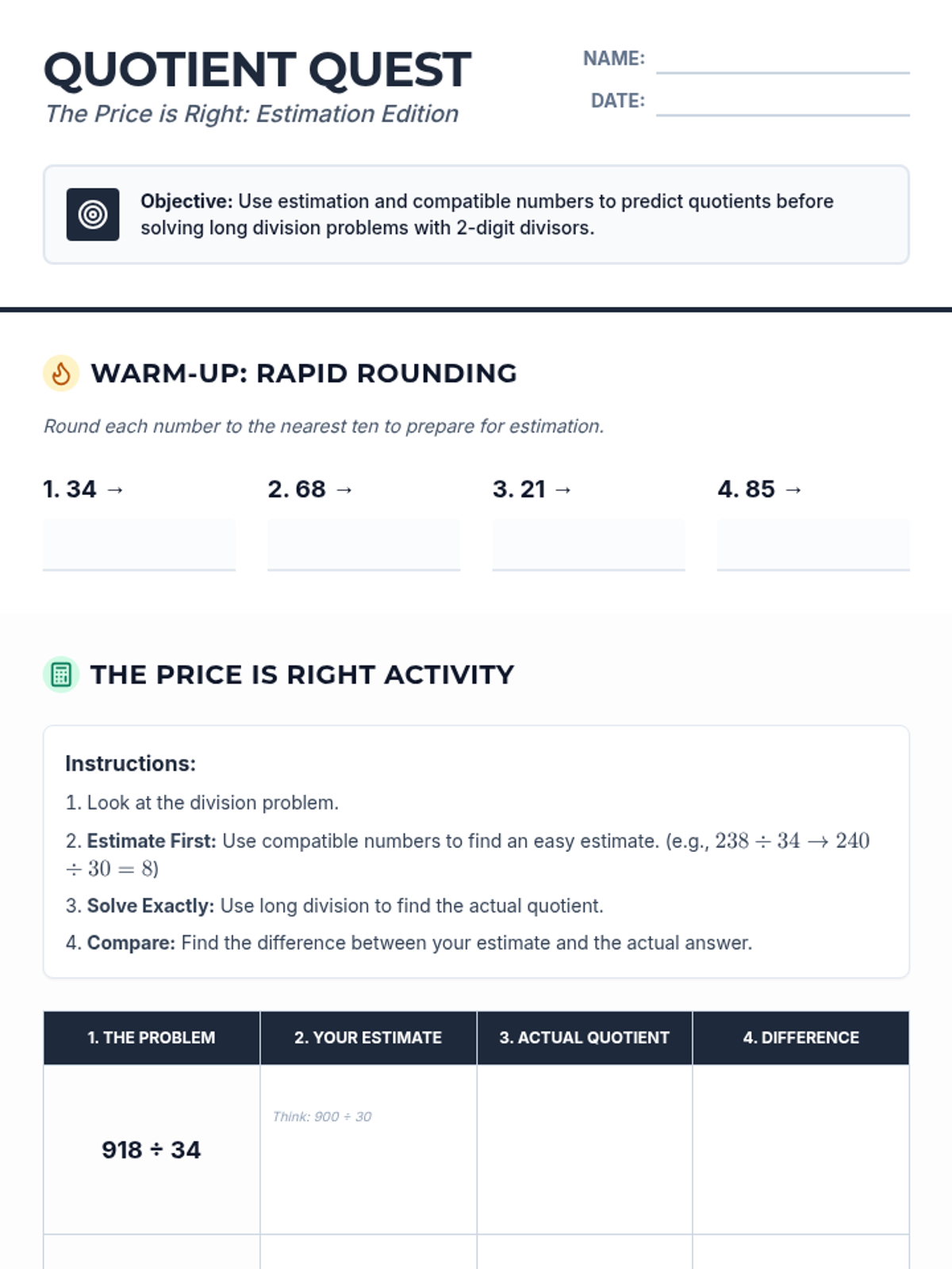 A lesson focused on using estimation and compatible numbers to master long division with 2-digit divisors, featuring a 'Price is Right' style estimation challenge.