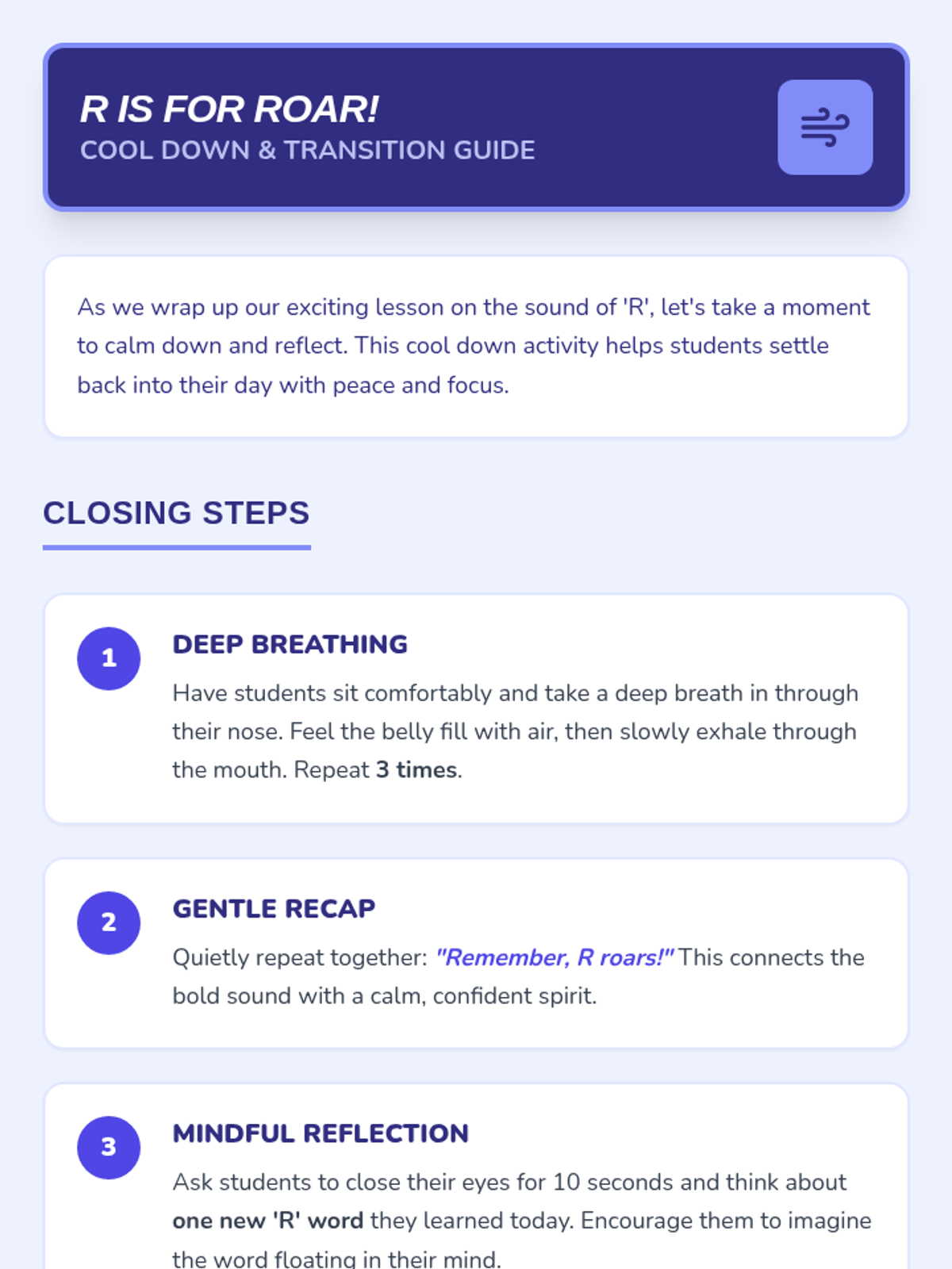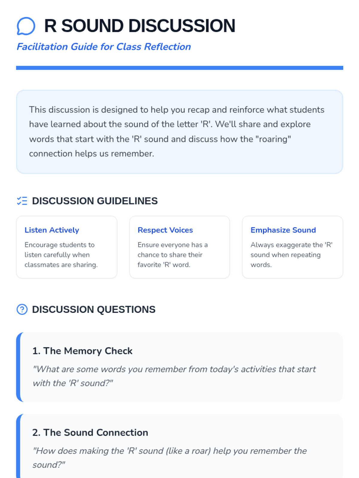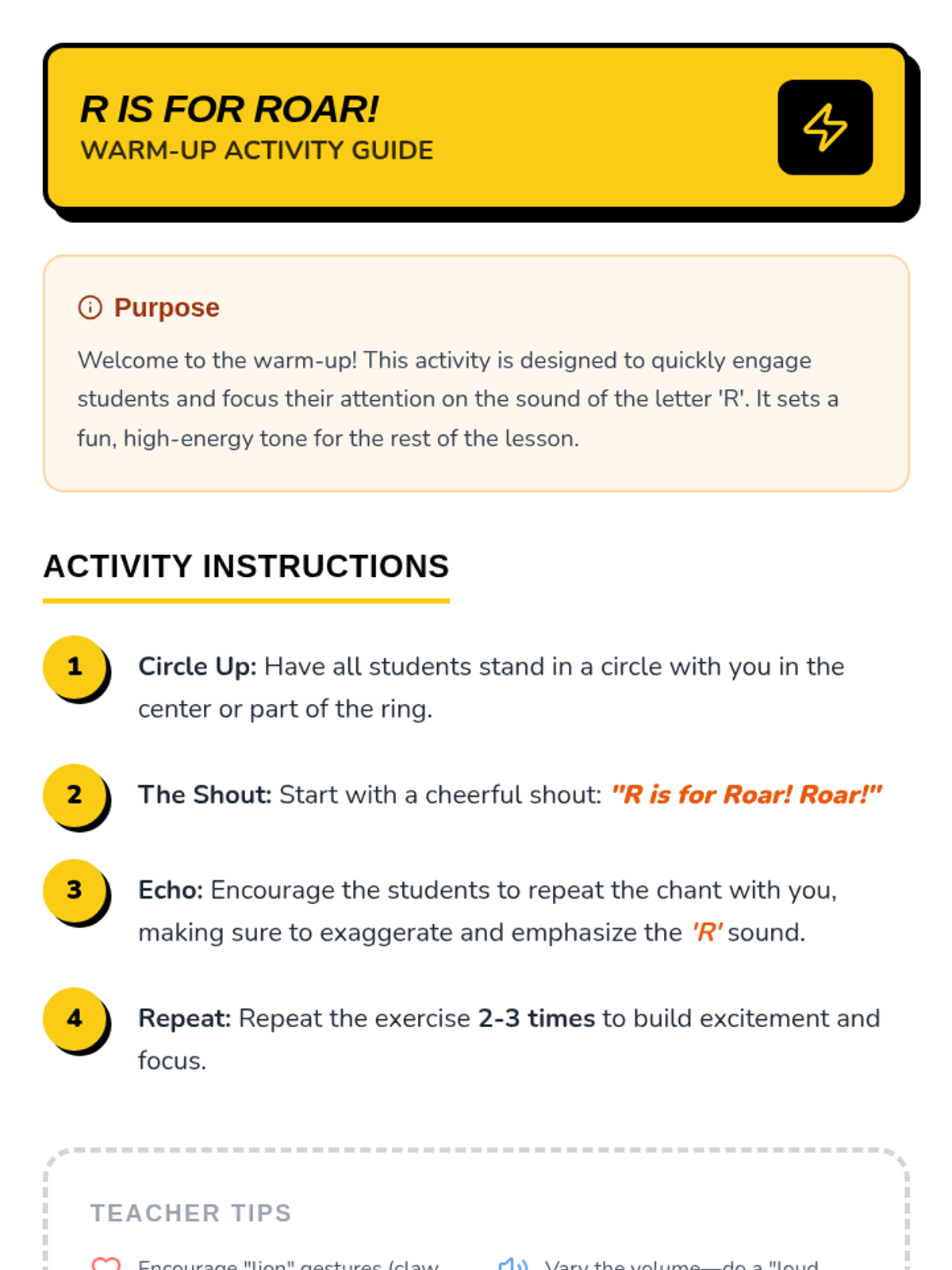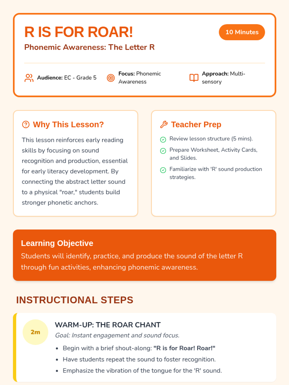 A high-energy, 10-minute phonemic awareness lesson focusing on the 'R' sound through roars, games, and interactive practice for early learners.