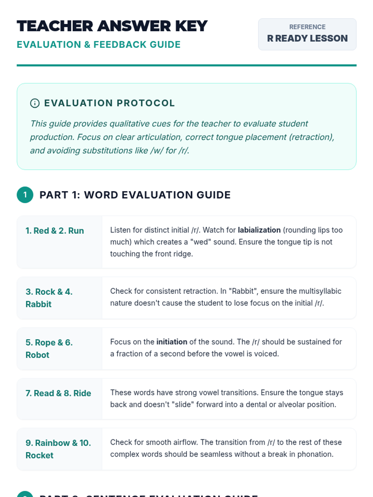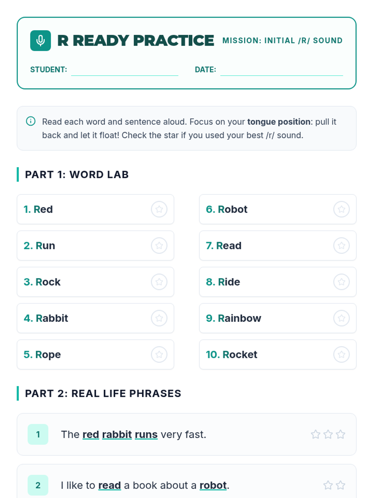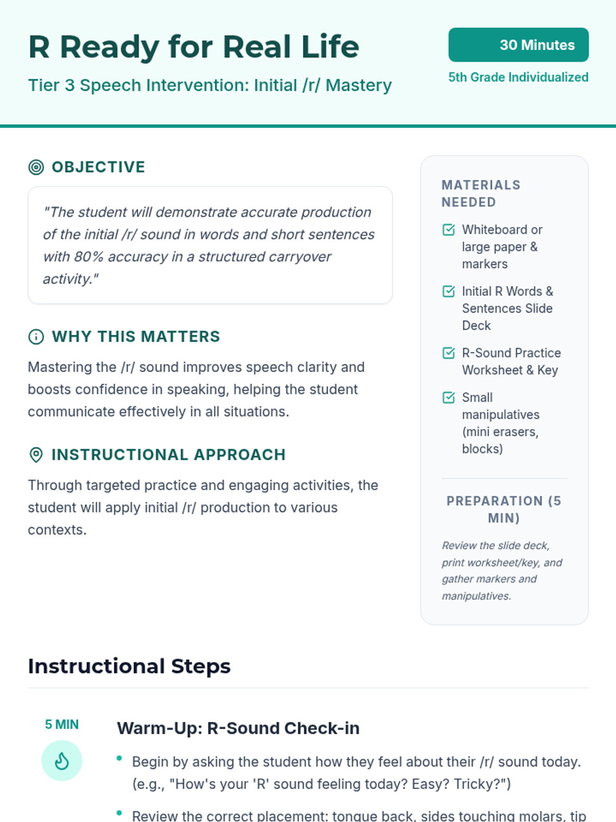 A targeted 30-minute speech therapy lesson for 5th graders to master the initial /r/ sound in words and sentences through modeling and structured practice.