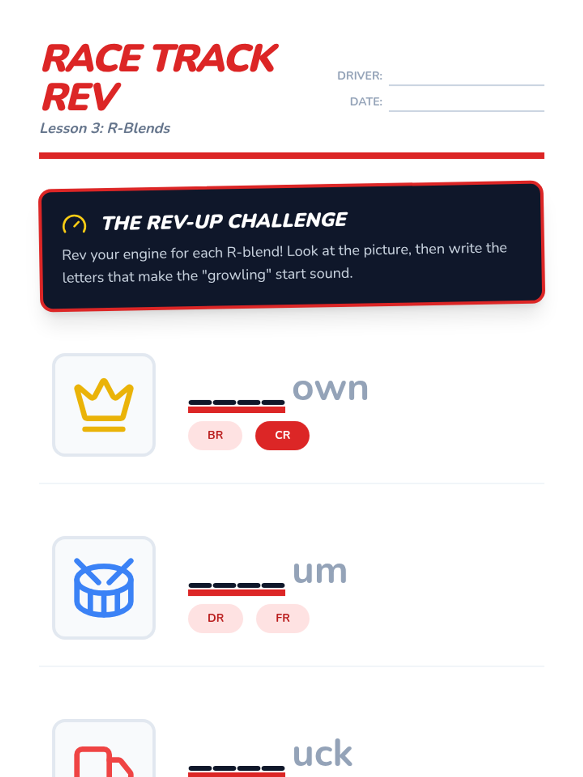 Students tackle the difficult R-blends (br, cr, dr, fr, gr, pr, tr) by associating them with growling or revving sounds. Students practice identifying these blends at the beginning of object names.