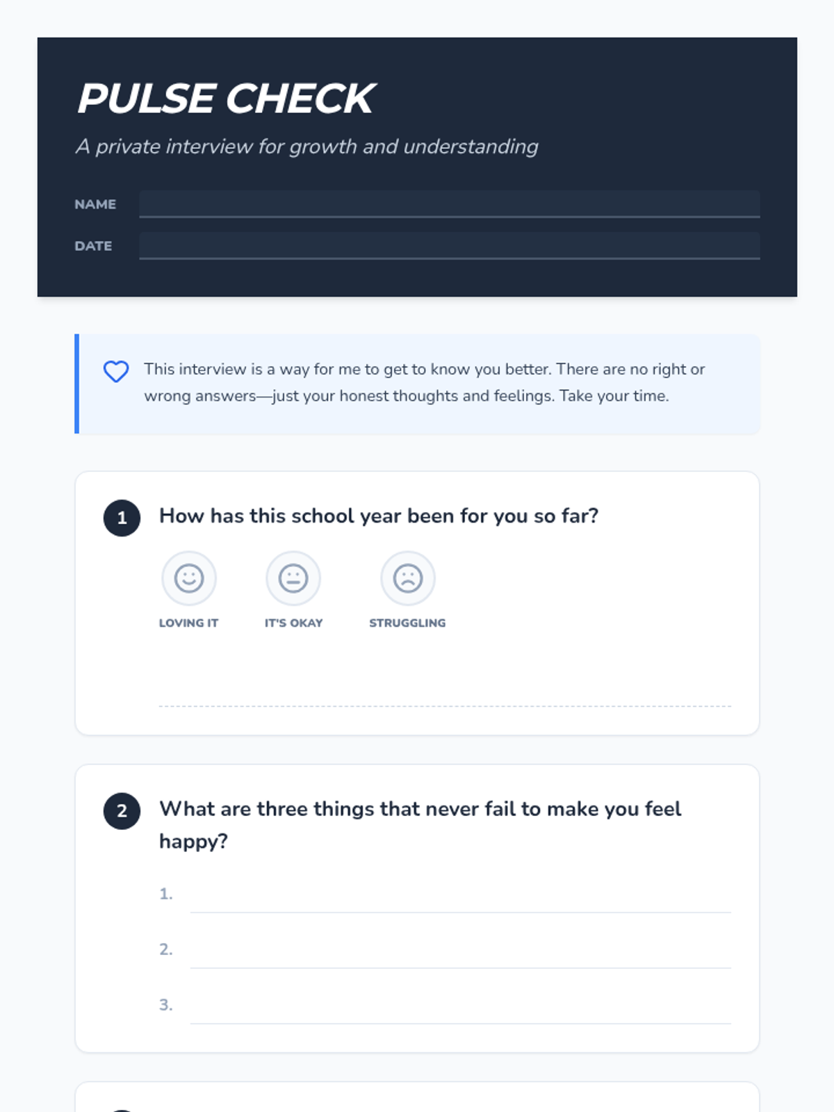 A set of resources designed to help educators understand their students' social-emotional well-being, goals, and school experiences through direct interviewing and reflection.