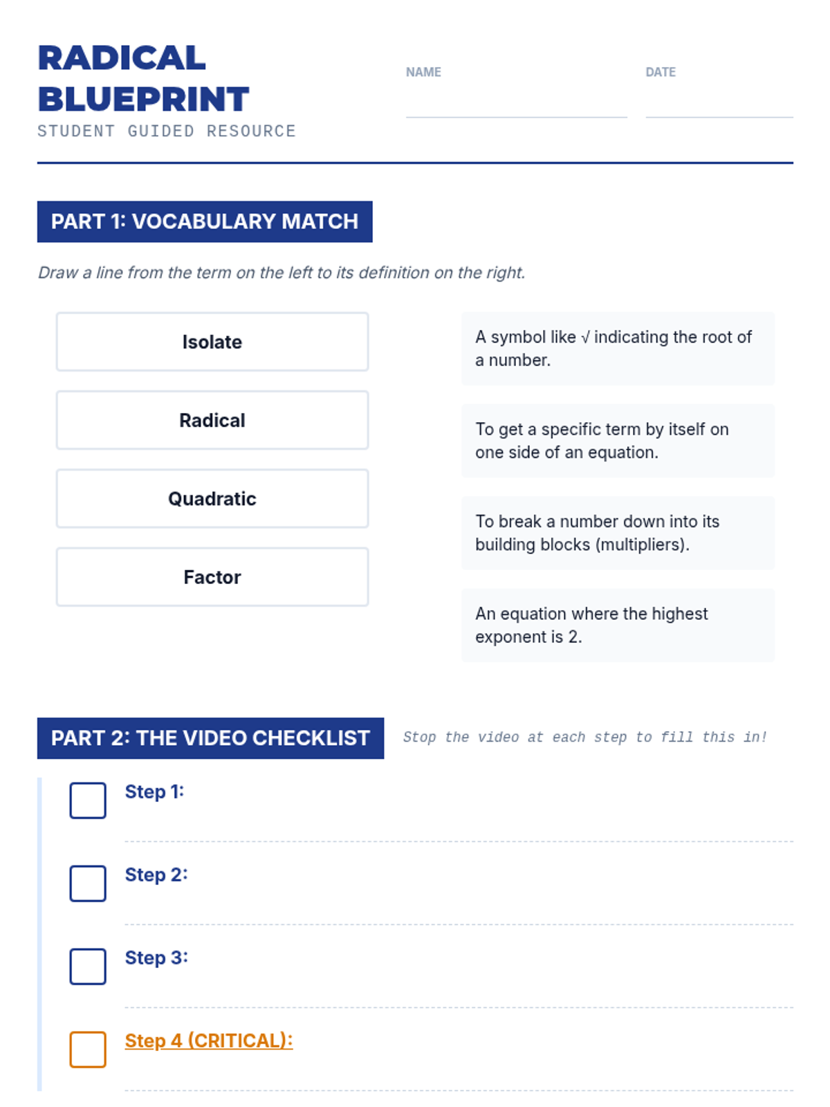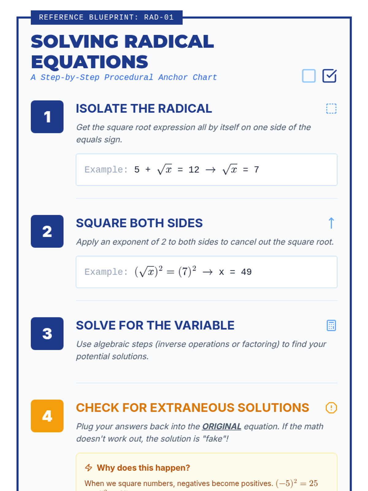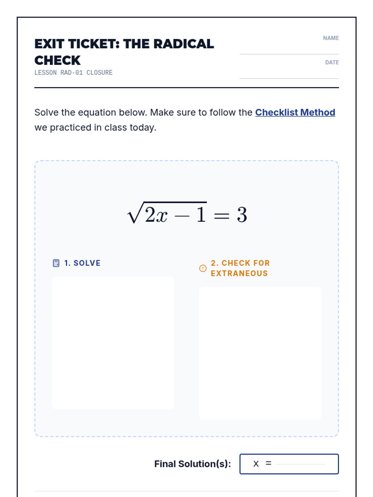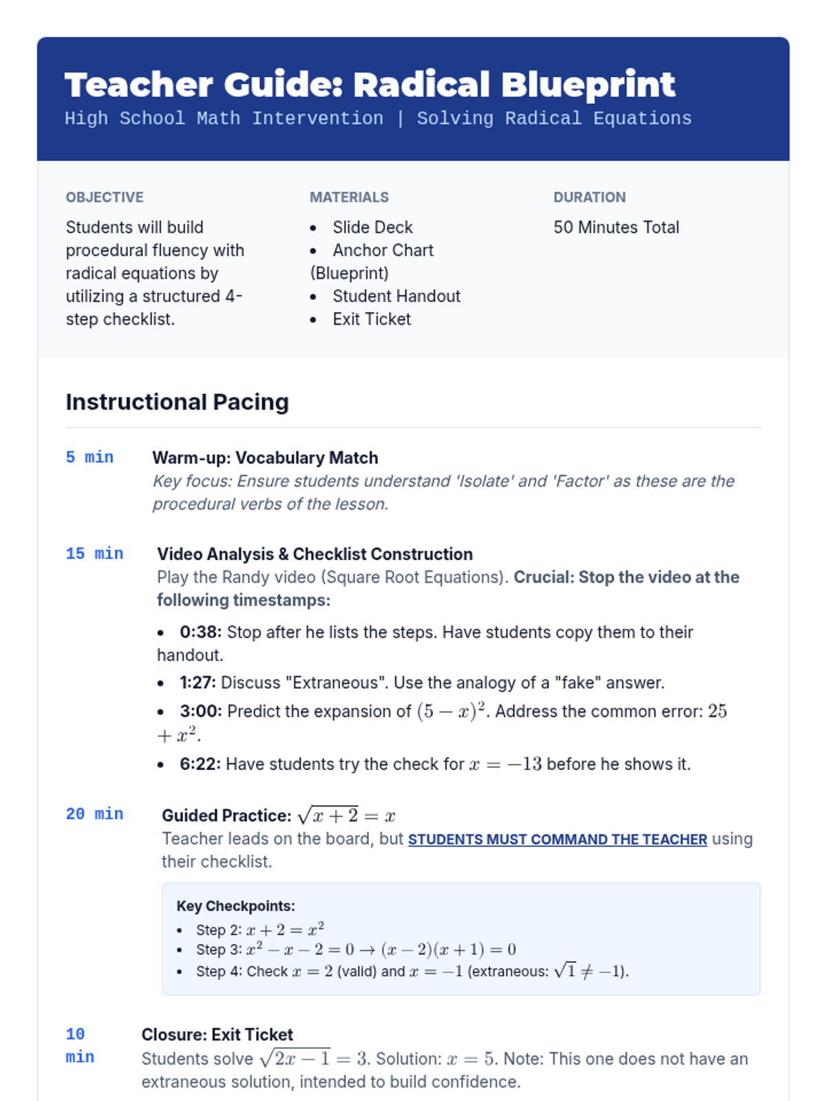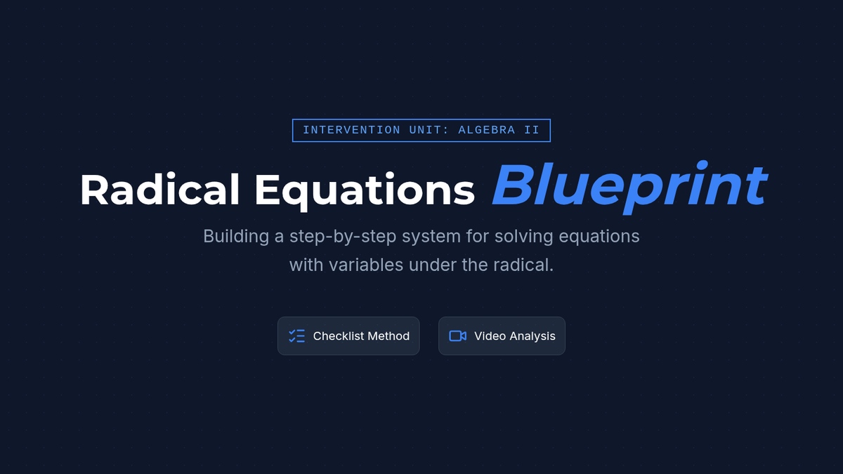 A math intervention lesson focused on solving radical equations using a step-by-step checklist to build procedural fluency and confidence. Students watch a video tutorial, build their own reference tool, and apply it to guided practice problems.