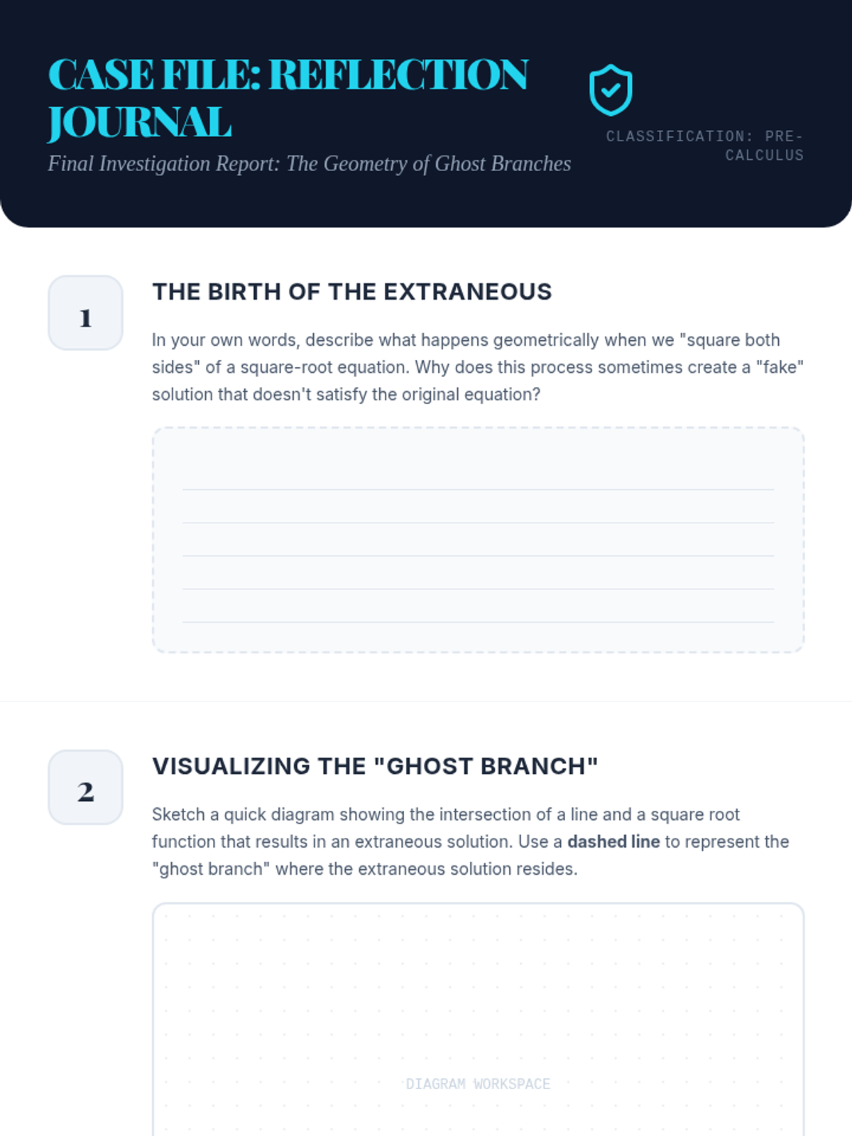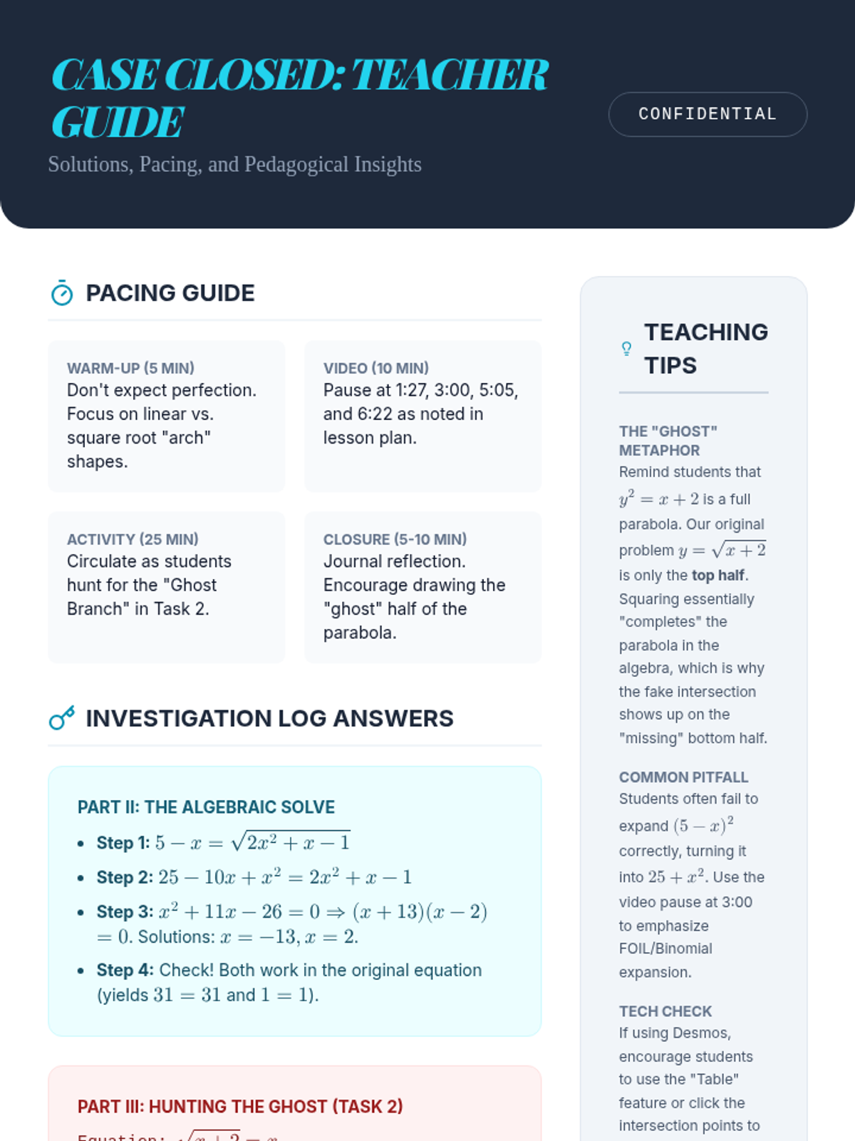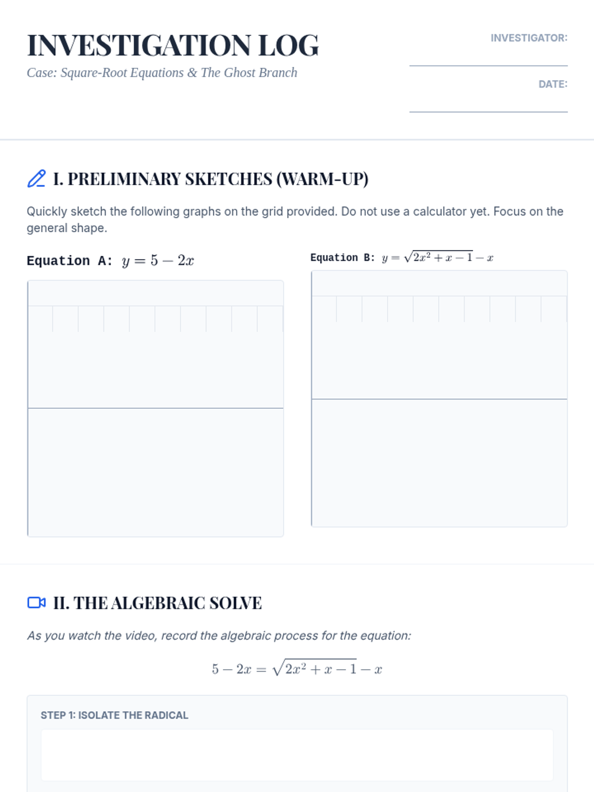 Students will investigate square-root equations algebraically and graphically, specifically focusing on the geometric origin of extraneous solutions as 'ghost' intersections.