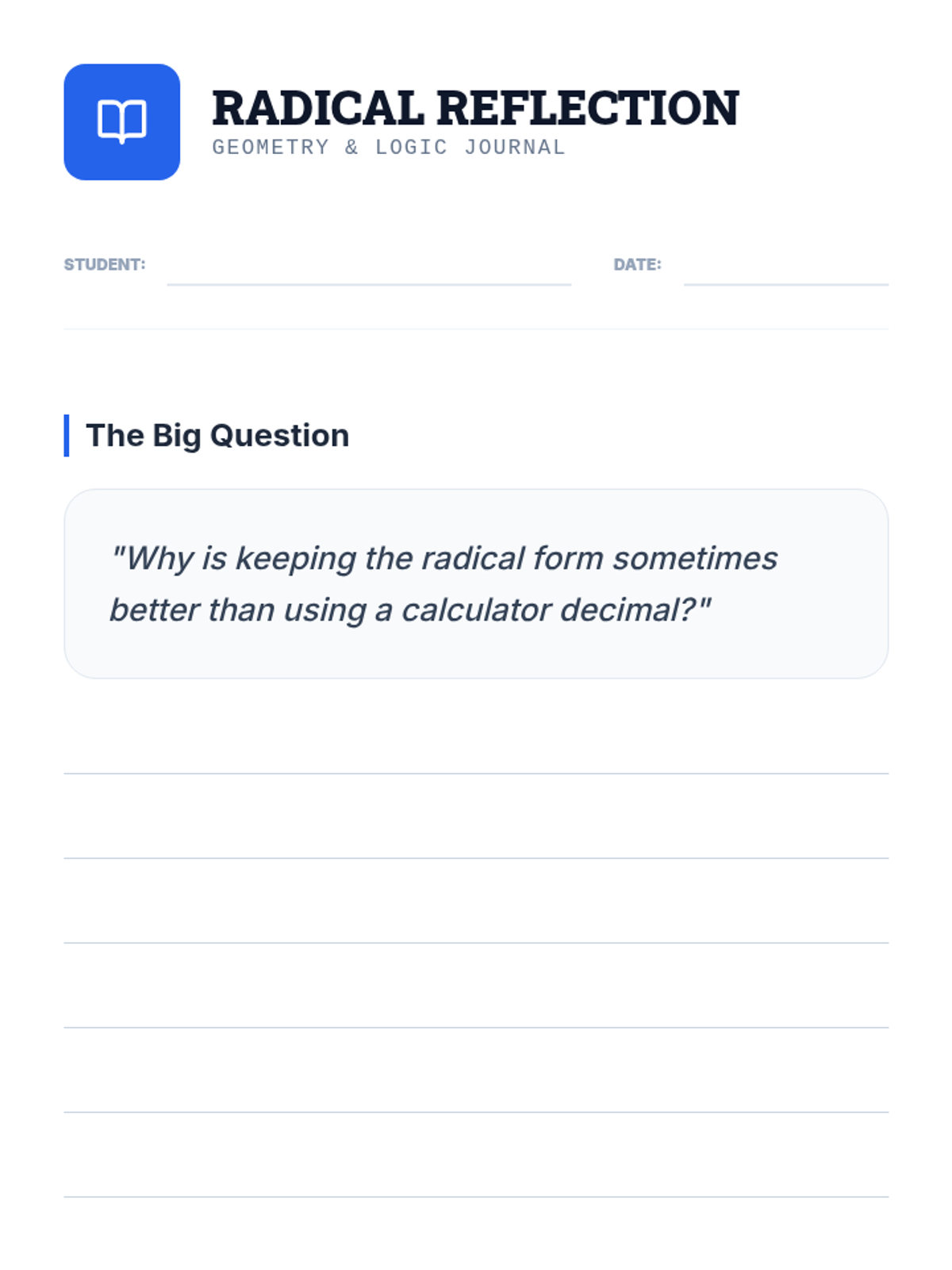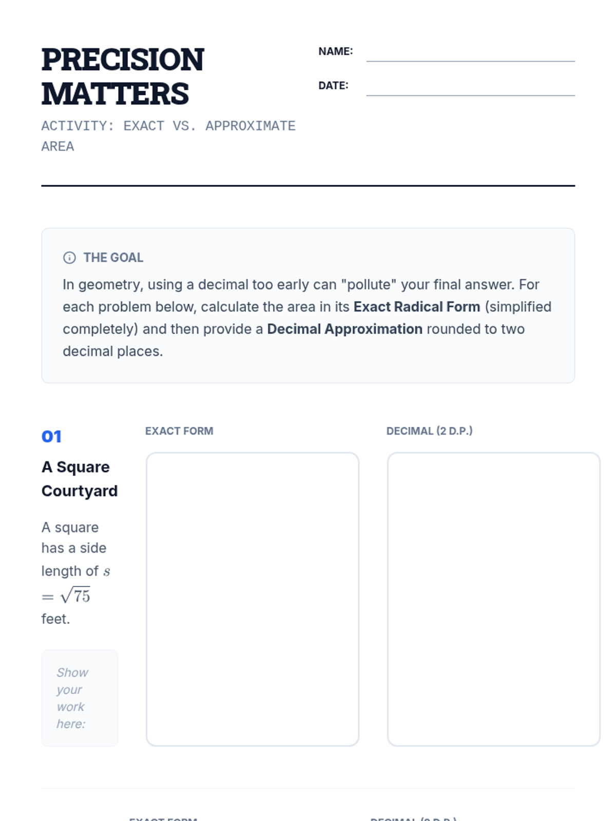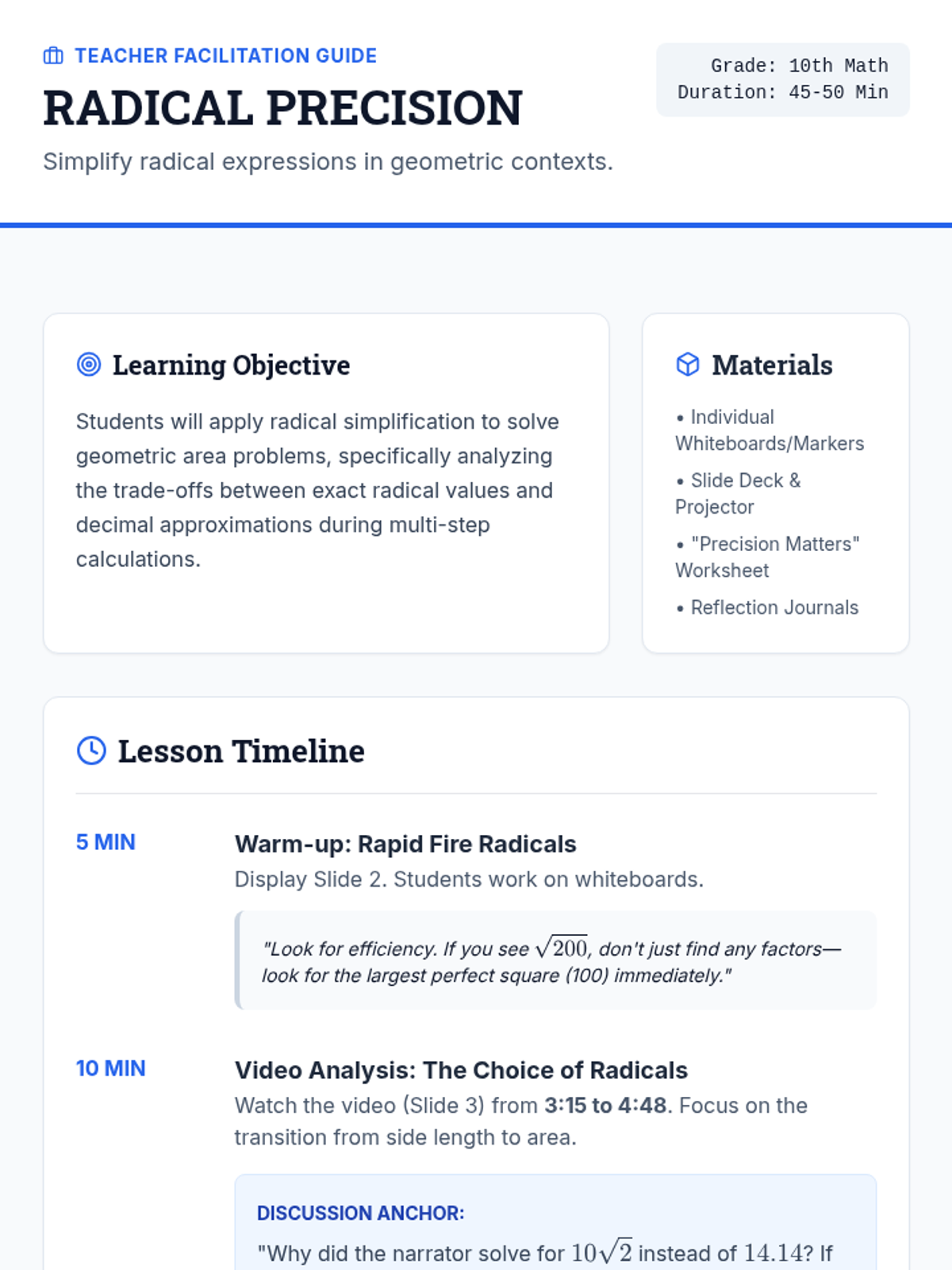 A 10th-grade math lesson focusing on simplifying radicals in geometric contexts, emphasizing the importance of exact values over decimal approximations for precision in multi-step problems.