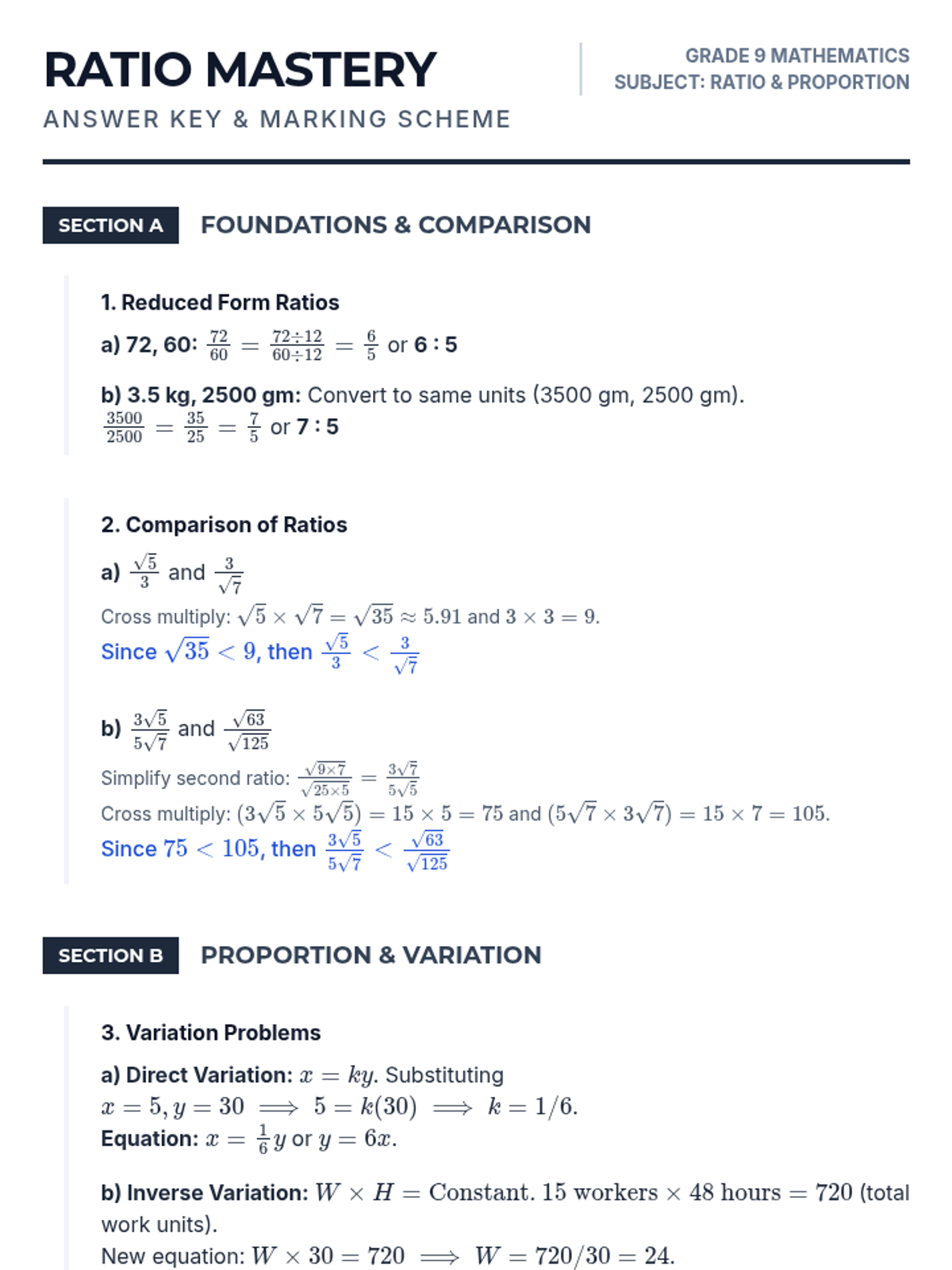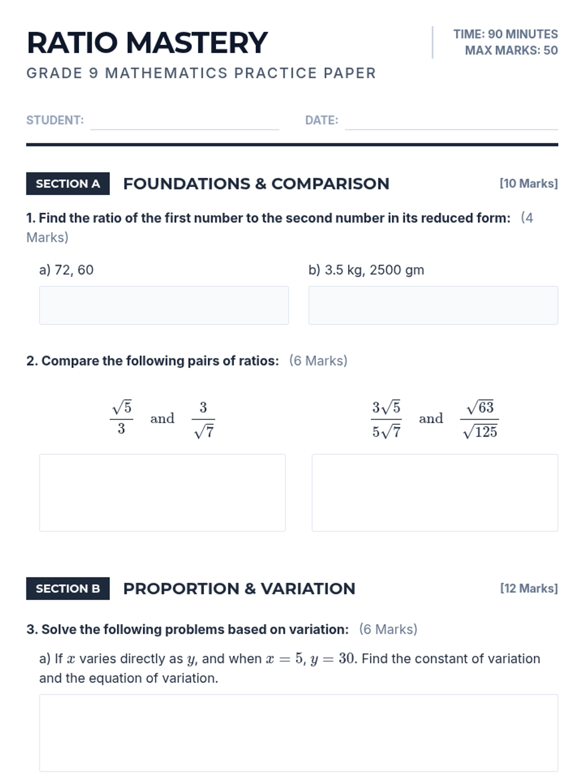 A comprehensive 1.5-hour practice session covering ratio reduction, proportion types, properties of equal ratios, and continued proportion for Grade 9 students.