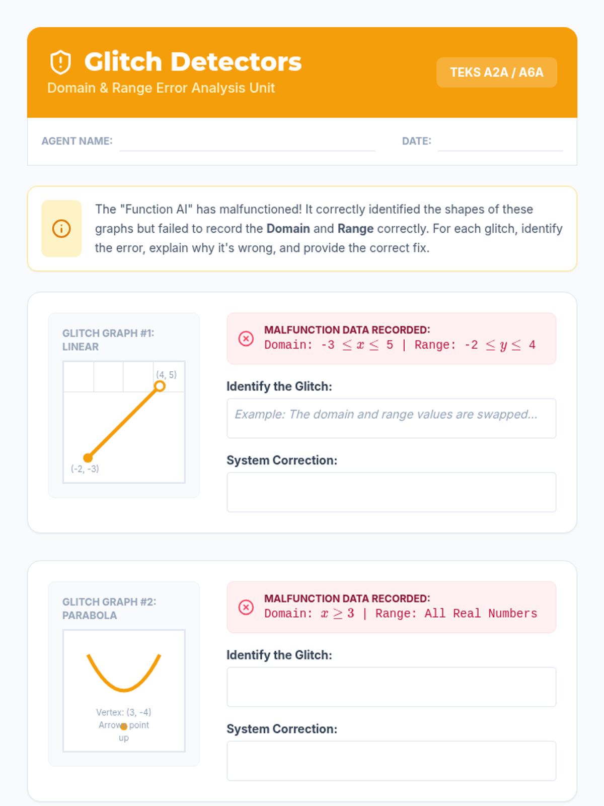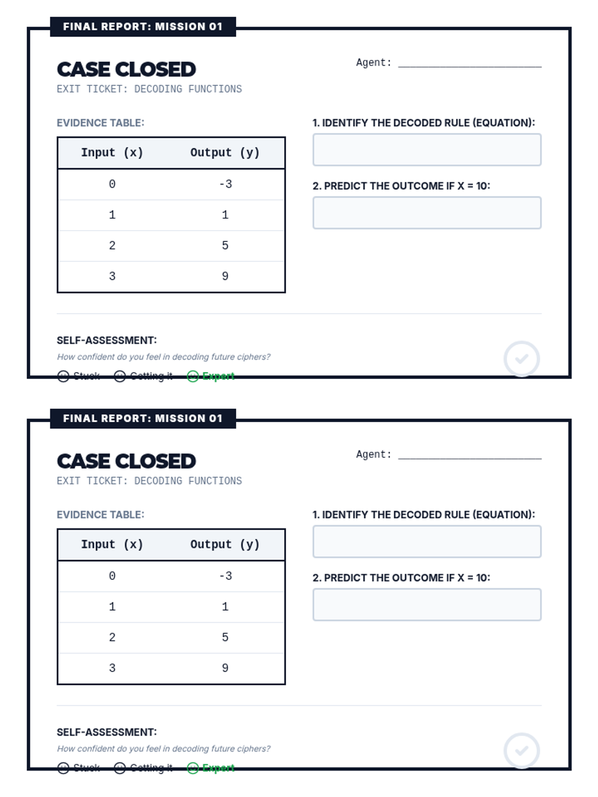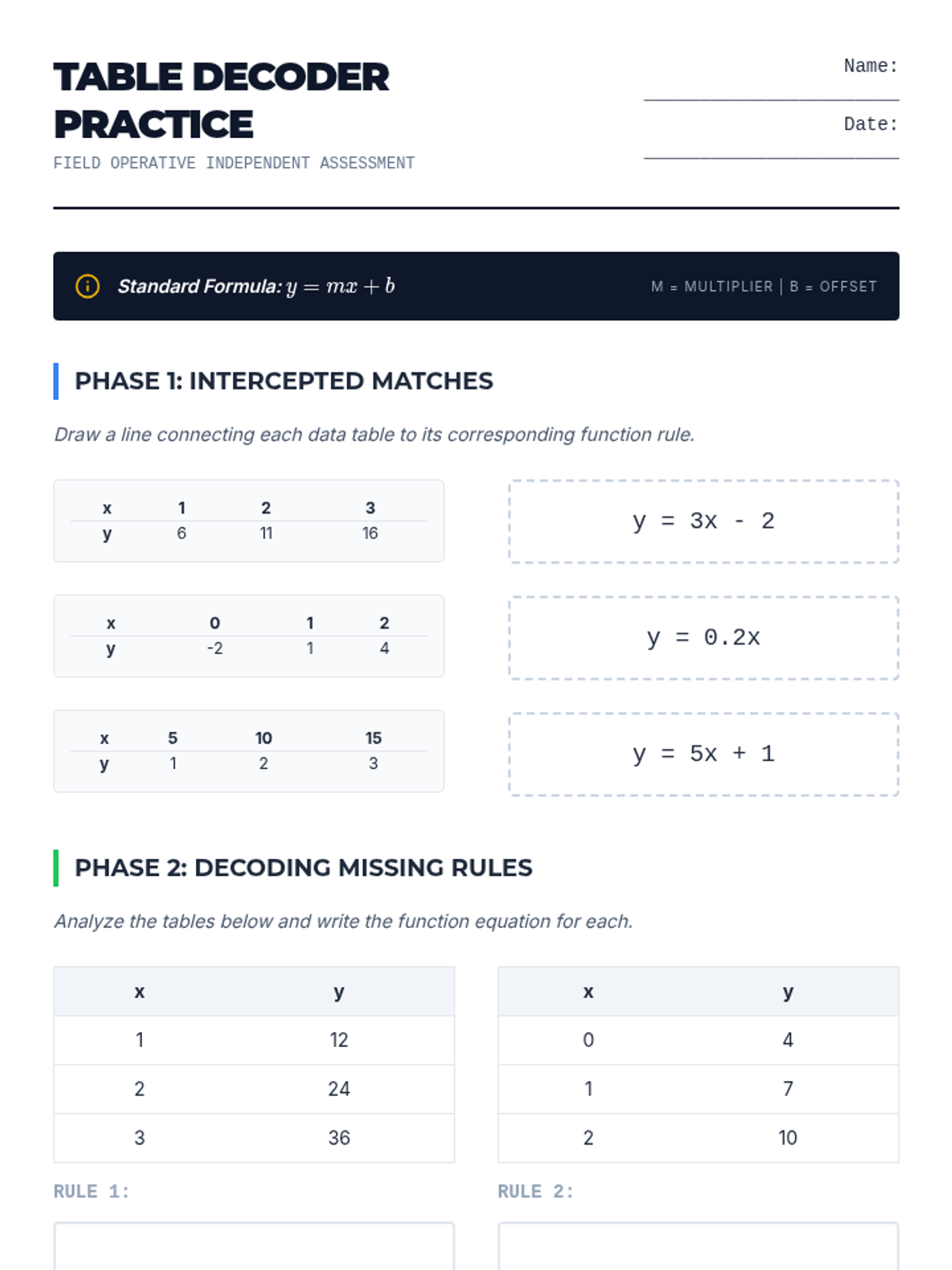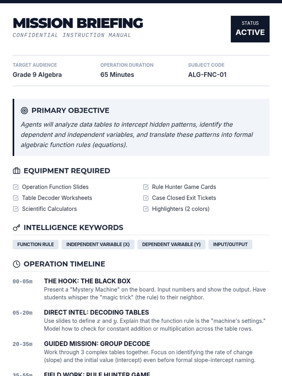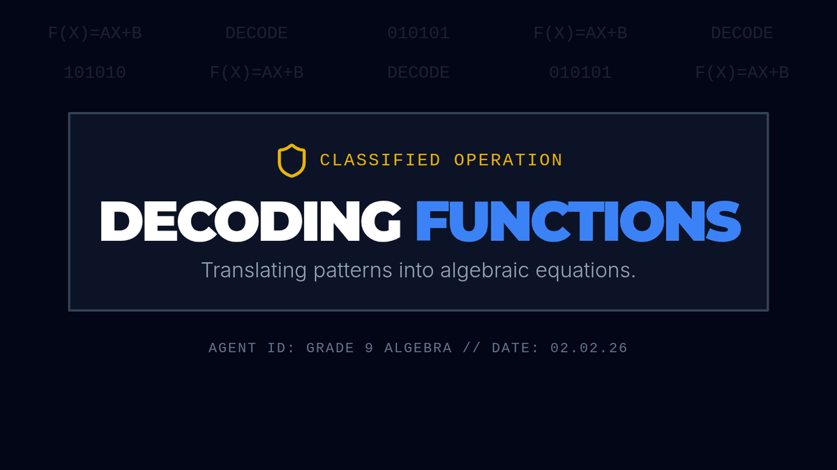 A 9th-grade algebra lesson where students act as 'secret agents' to decode patterns in tables and translate them into algebraic function rules. Students will transition from intuitive pattern recognition to formal equation writing.