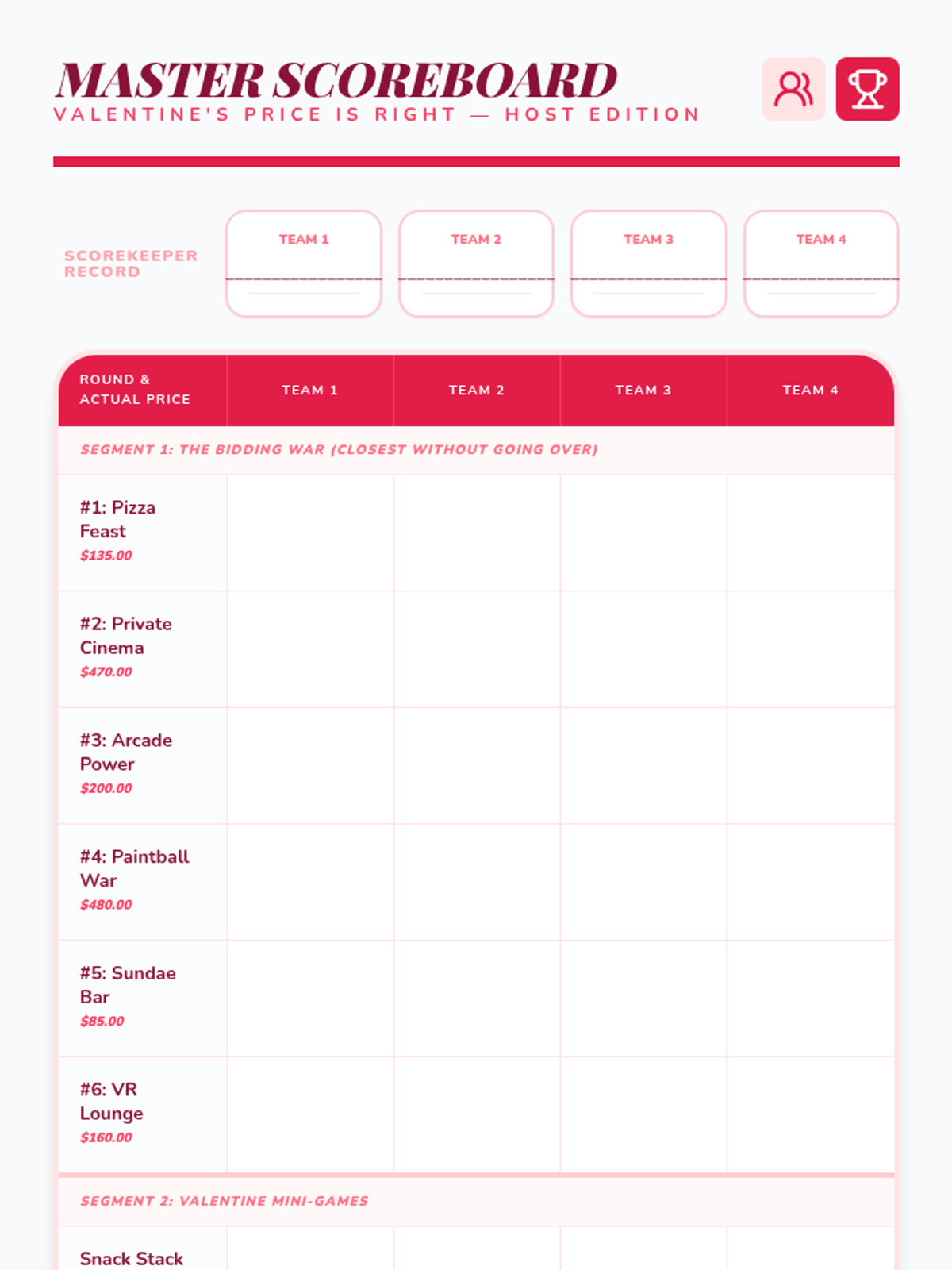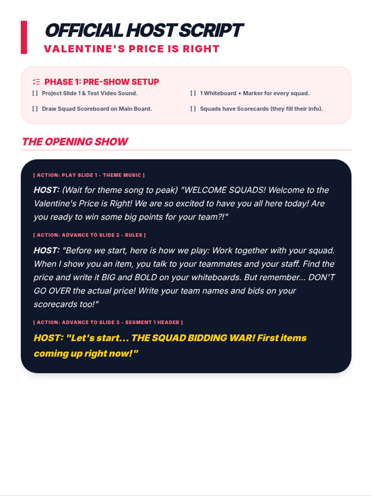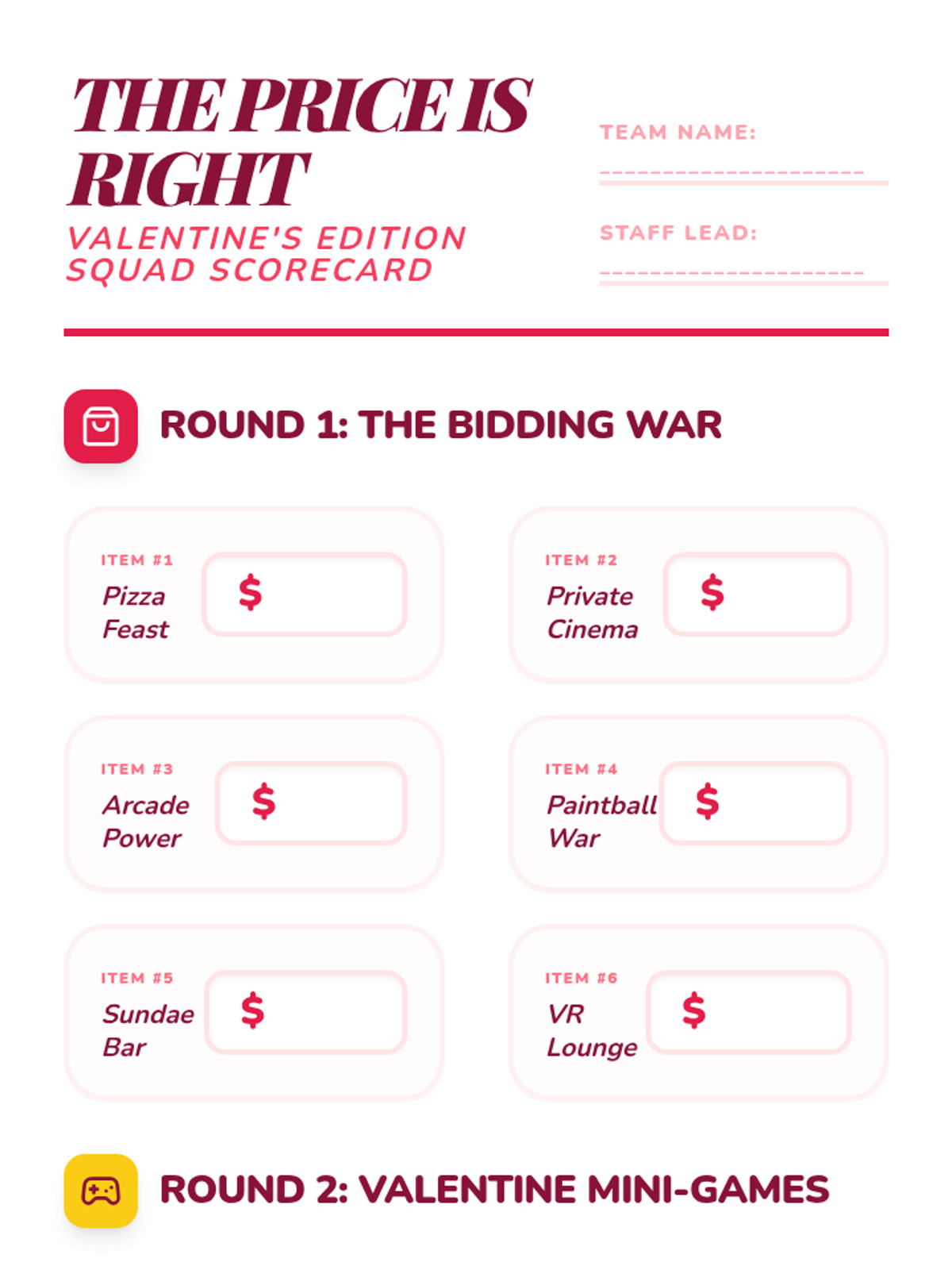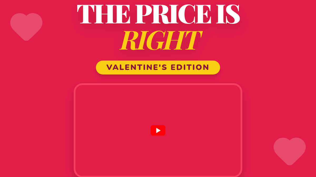 A high-energy, Valentine's-themed 'Price is Right' game designed to last up to 120 minutes, covering item pricing, logic, and estimation.