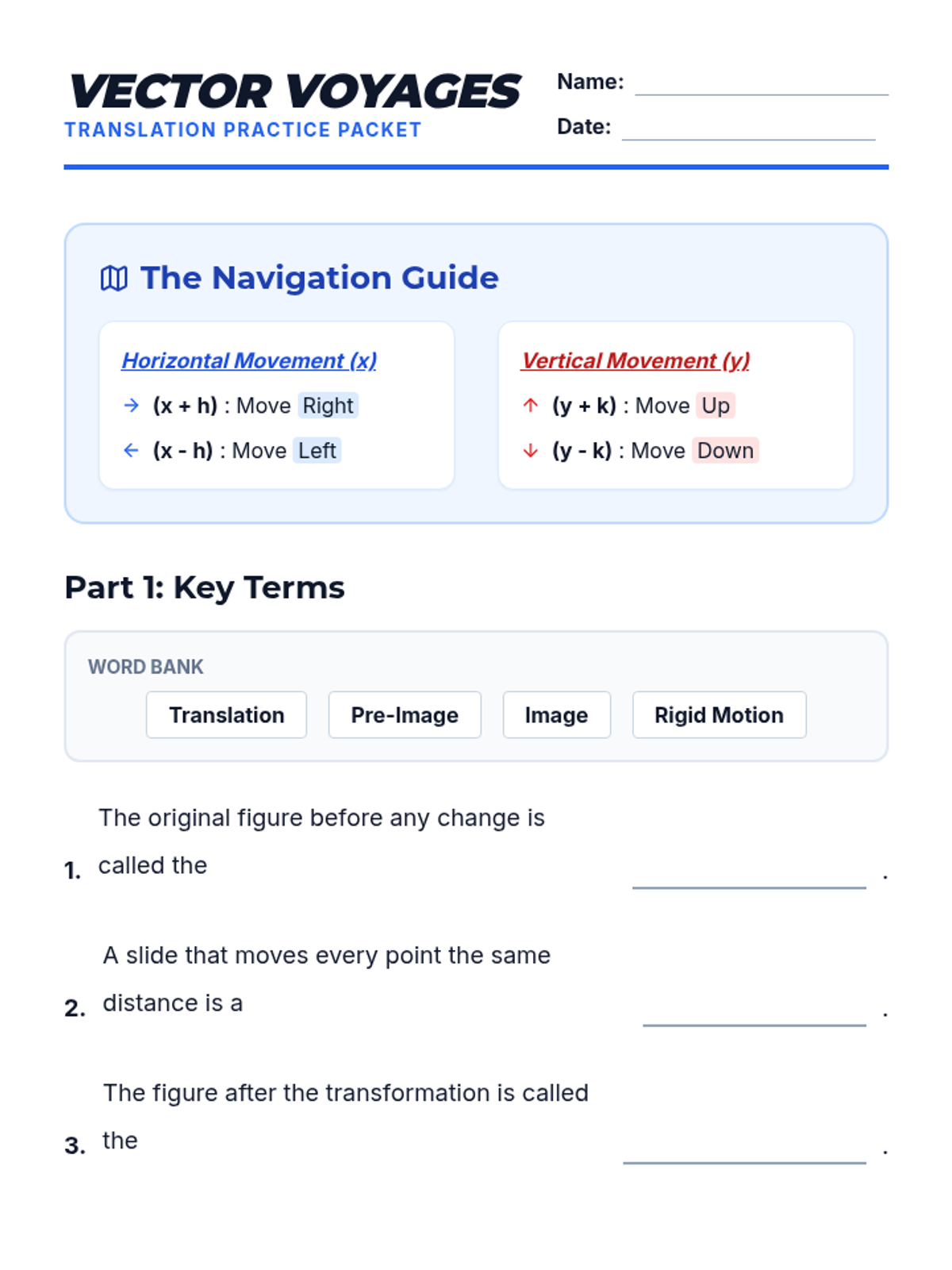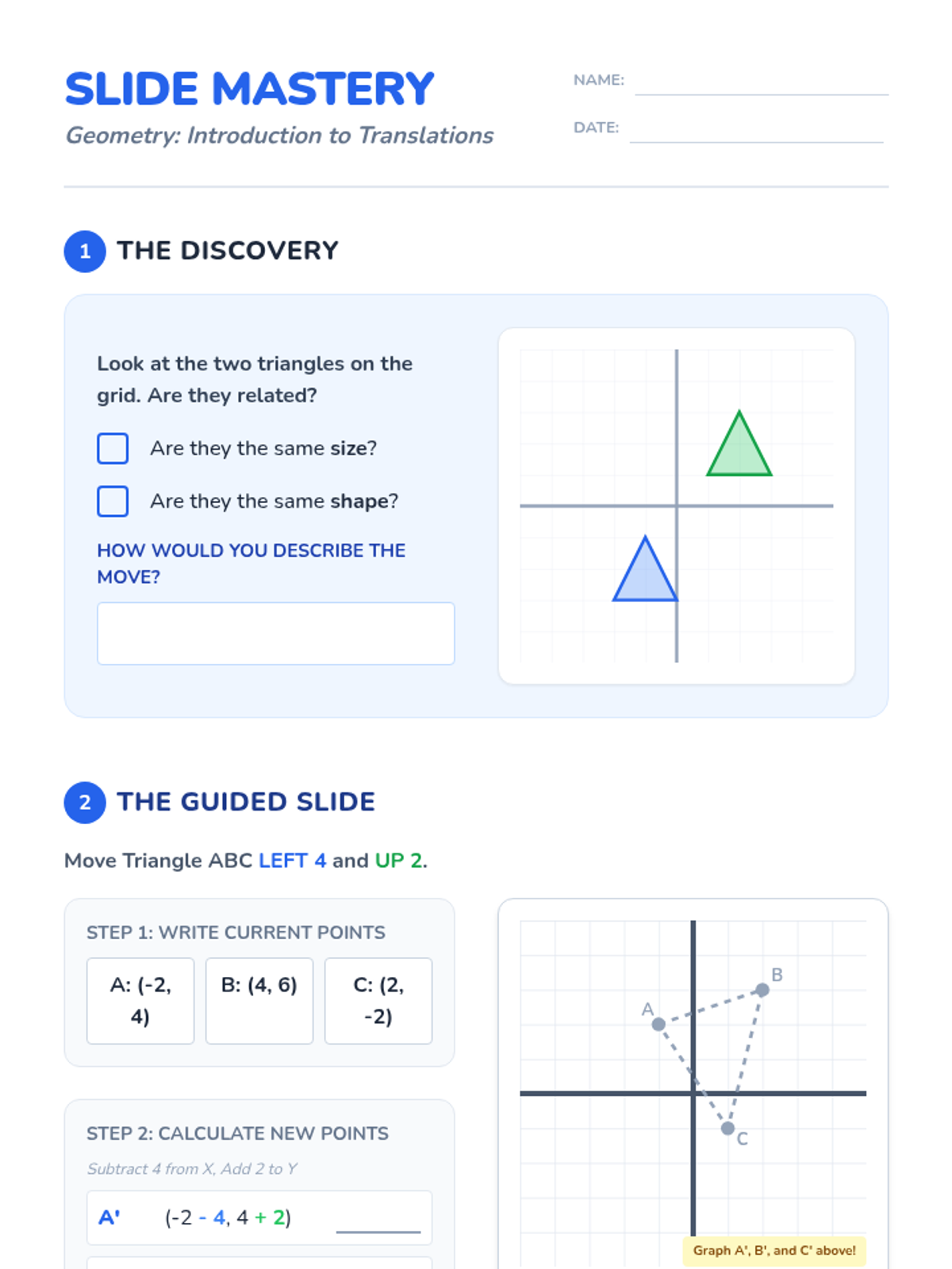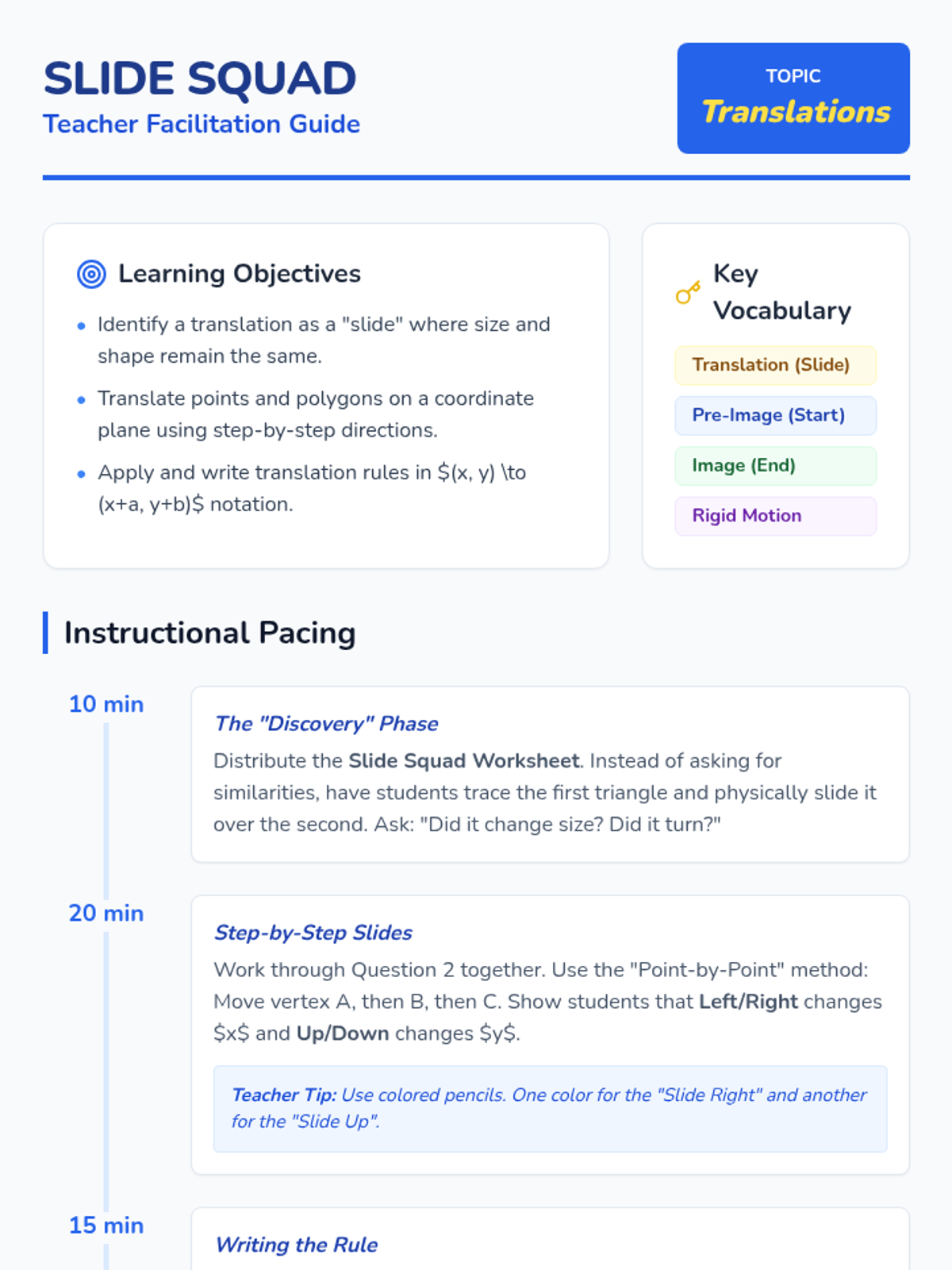 A scaffolded lesson on geometric translations that simplifies complex vocabulary, breaks down coordinate rules into manageable steps, and provides clear visual anchors for students.