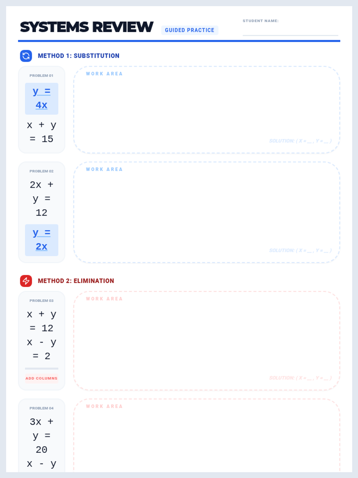 A targeted, high-scaffold review of solving systems of equations using substitution and elimination, specifically designed for Tier 3 8th-grade students with step-by-step graphic organizers and a self-checking sum mechanic.