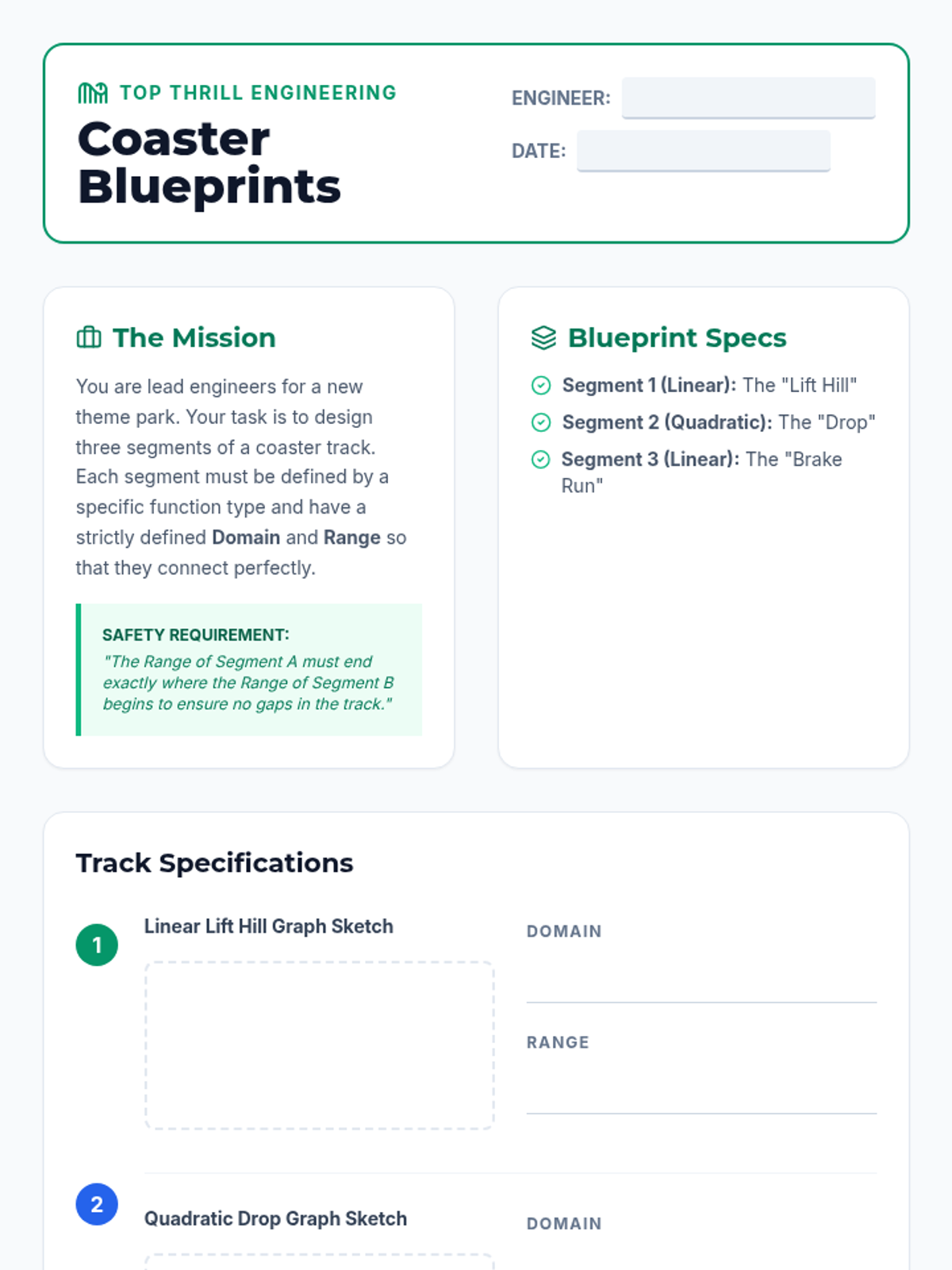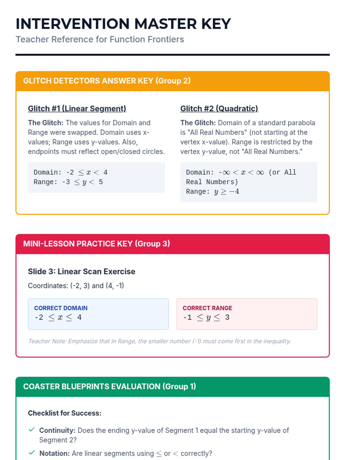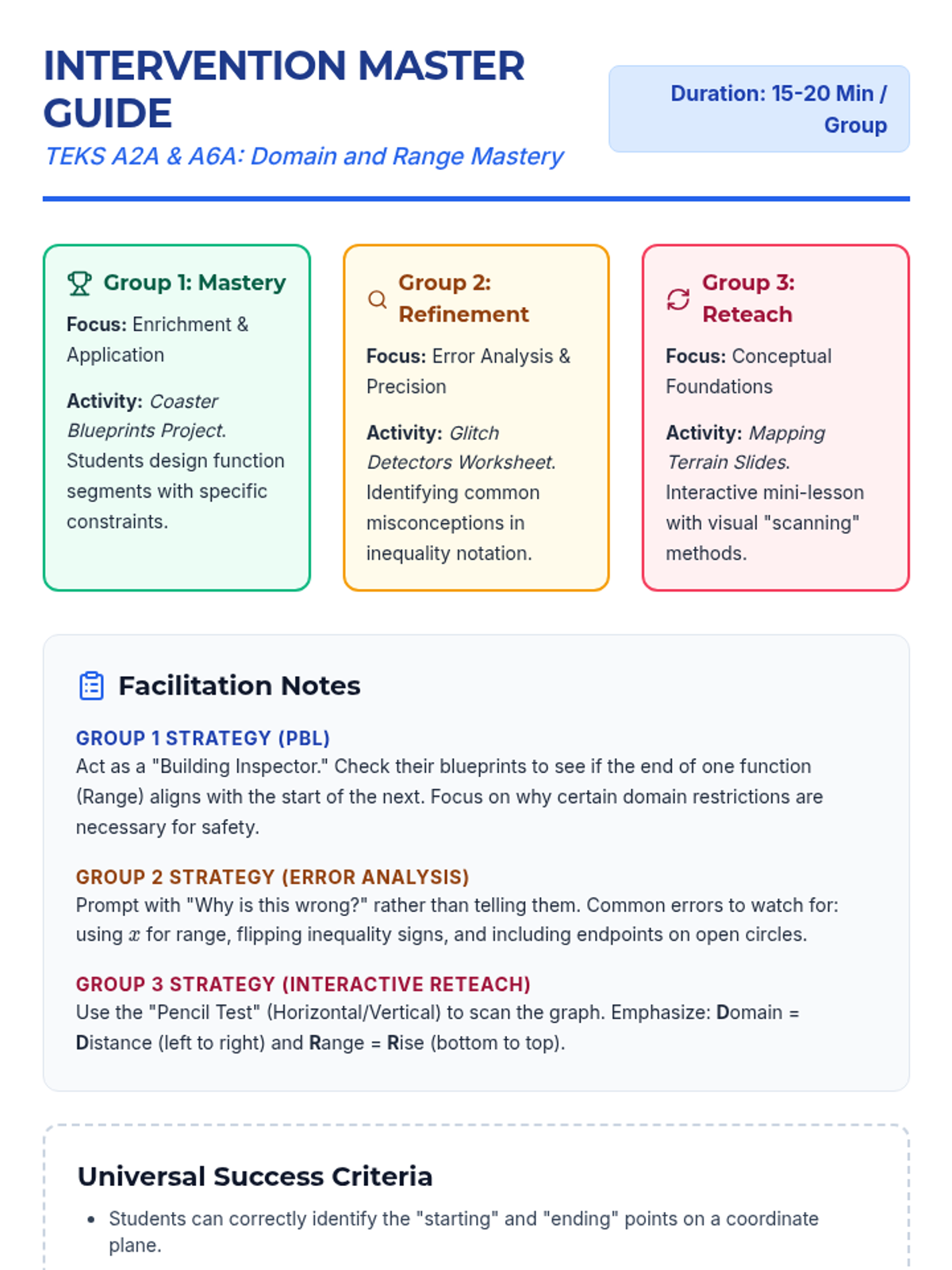 A targeted intervention session providing differentiated pathways for students based on their mastery of domain and range: enrichment projects, error analysis, and foundational reteaching.