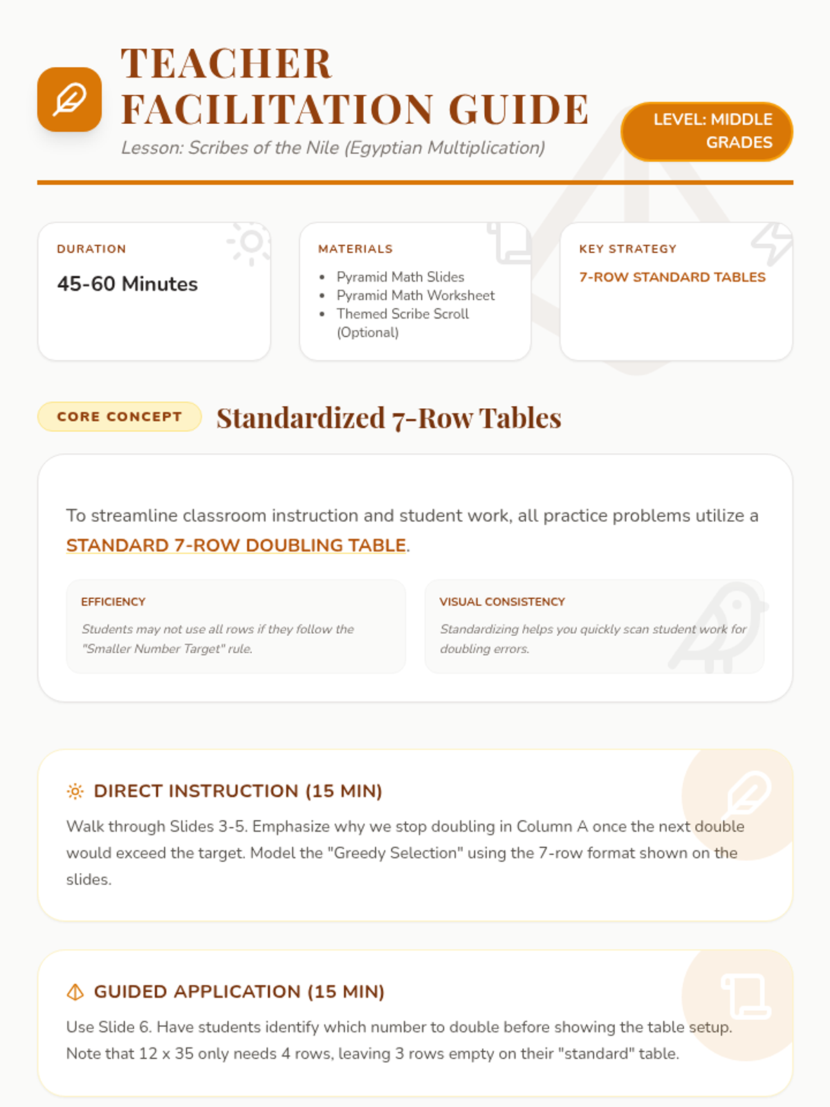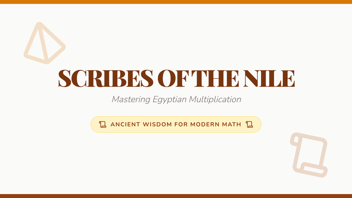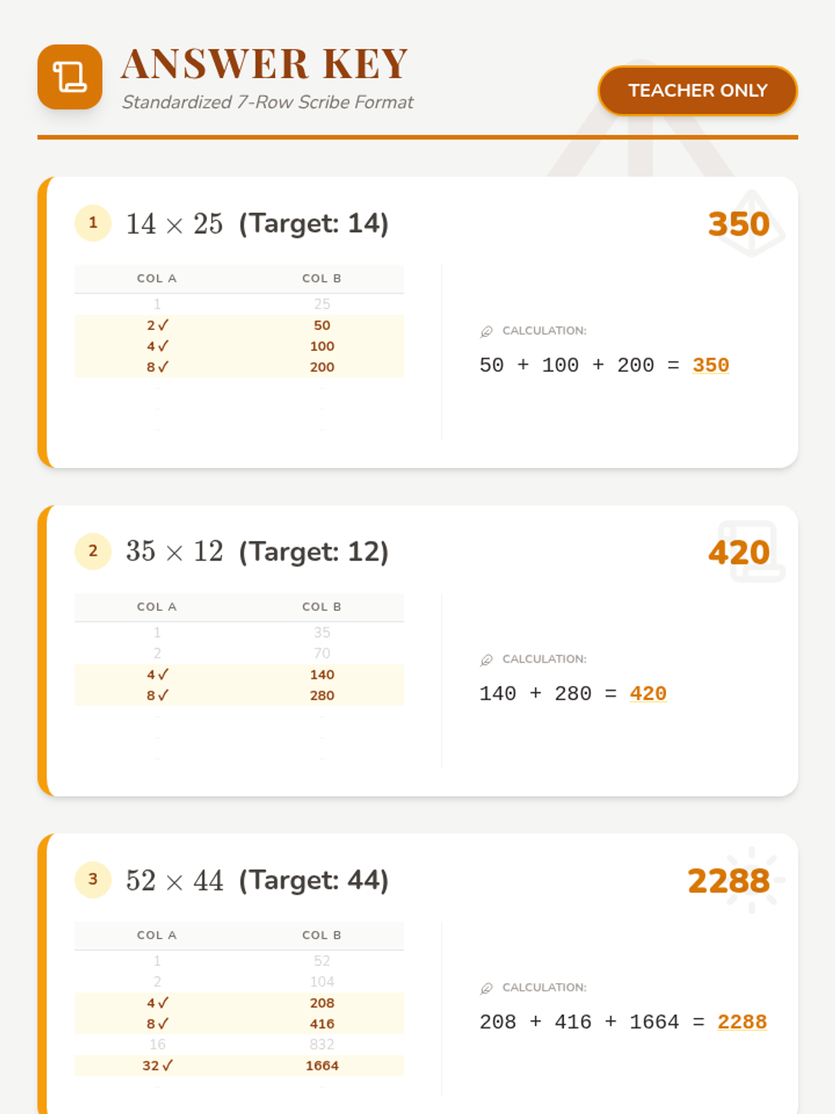 A comprehensive guide to the ancient Egyptian method of multiplication using doubling and addition, featuring step-by-step instructions and practice problems with double and triple-digit numbers.