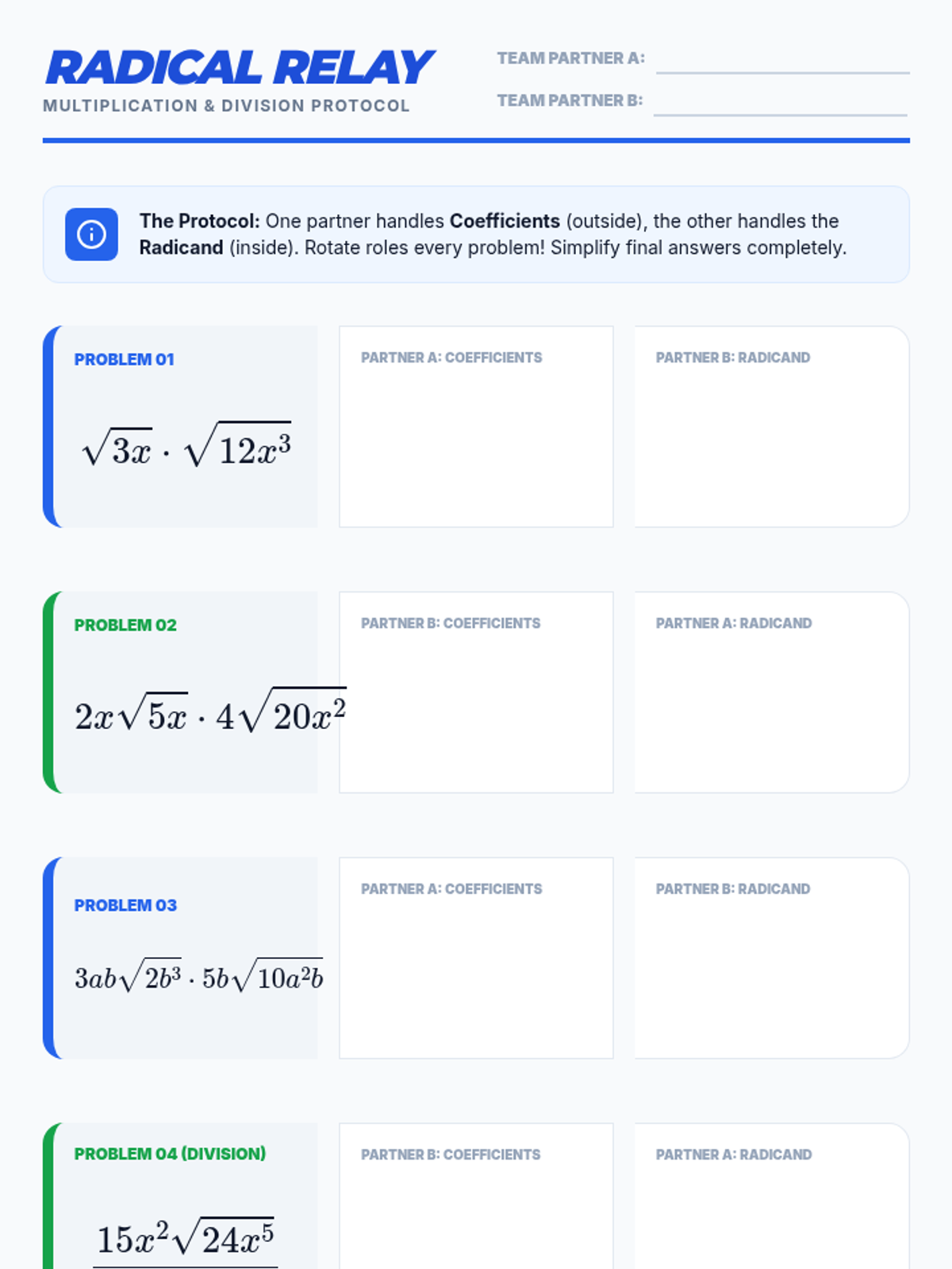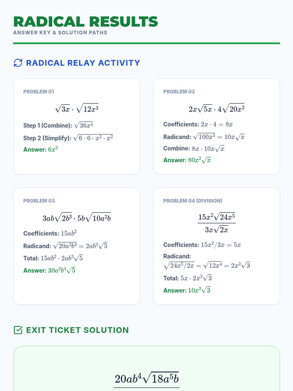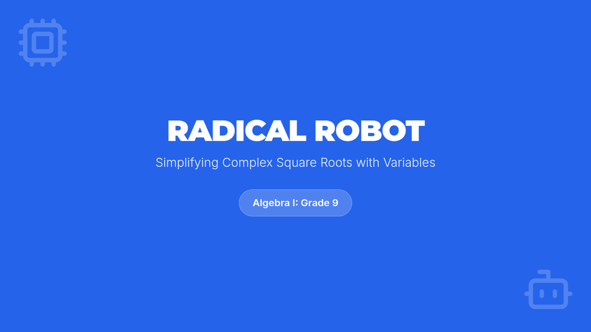 A 9th Grade Algebra I lesson focused on simplifying complex radical expressions involving variables through multiplication and division. The lesson features a 'Radical Relay' collaborative activity and a step-by-step video guide.