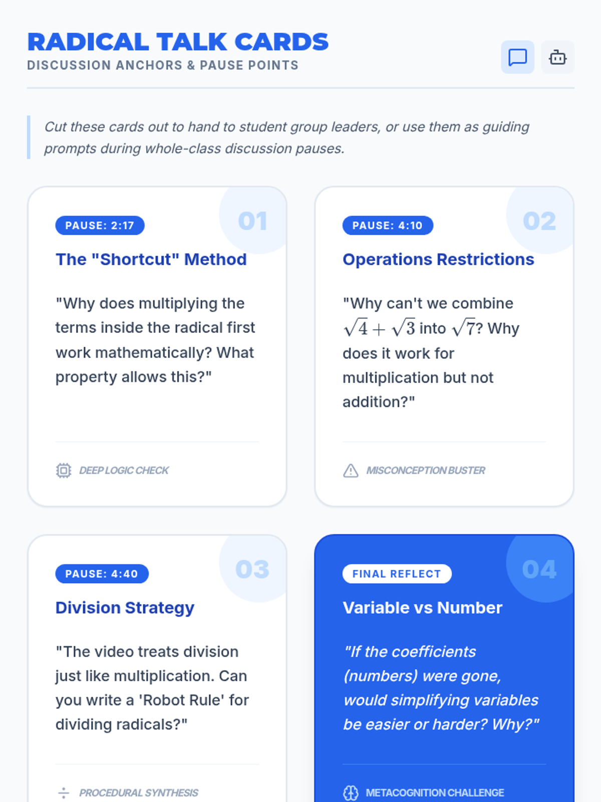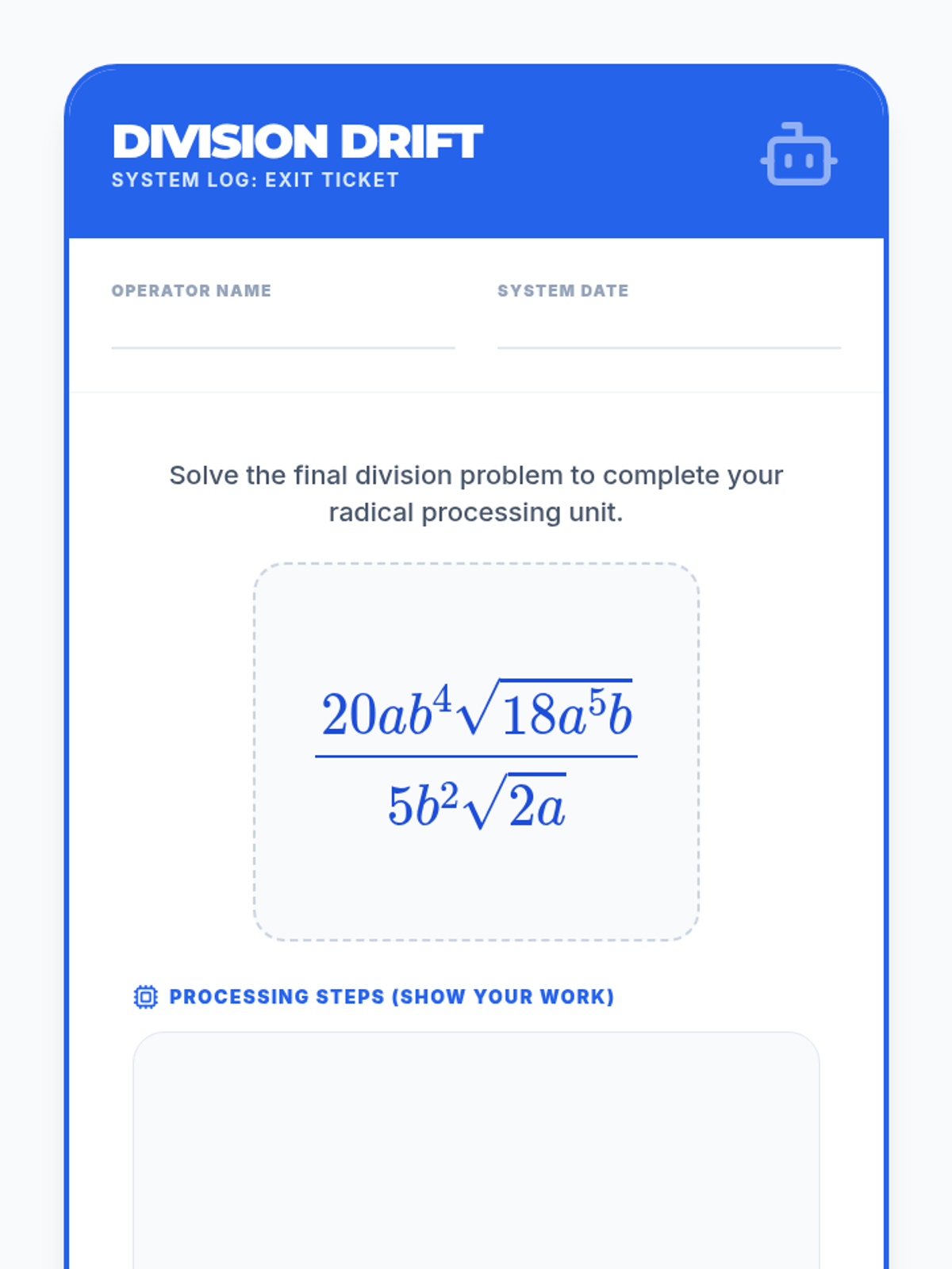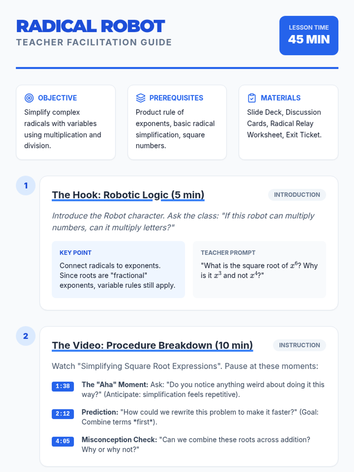 A 9th Grade Algebra I lesson focused on simplifying complex radical expressions involving variables through multiplication and division. The lesson features a 'Radical Relay' collaborative activity and a step-by-step video guide.