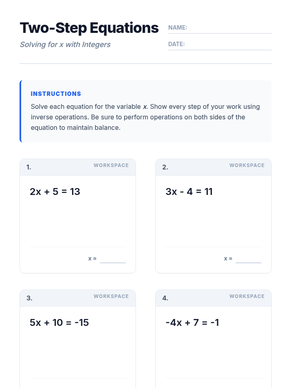 A comprehensive lesson on solving two-step equations involving integers. Students learn to use inverse operations to isolate variables through guided practice and independent problem-solving.