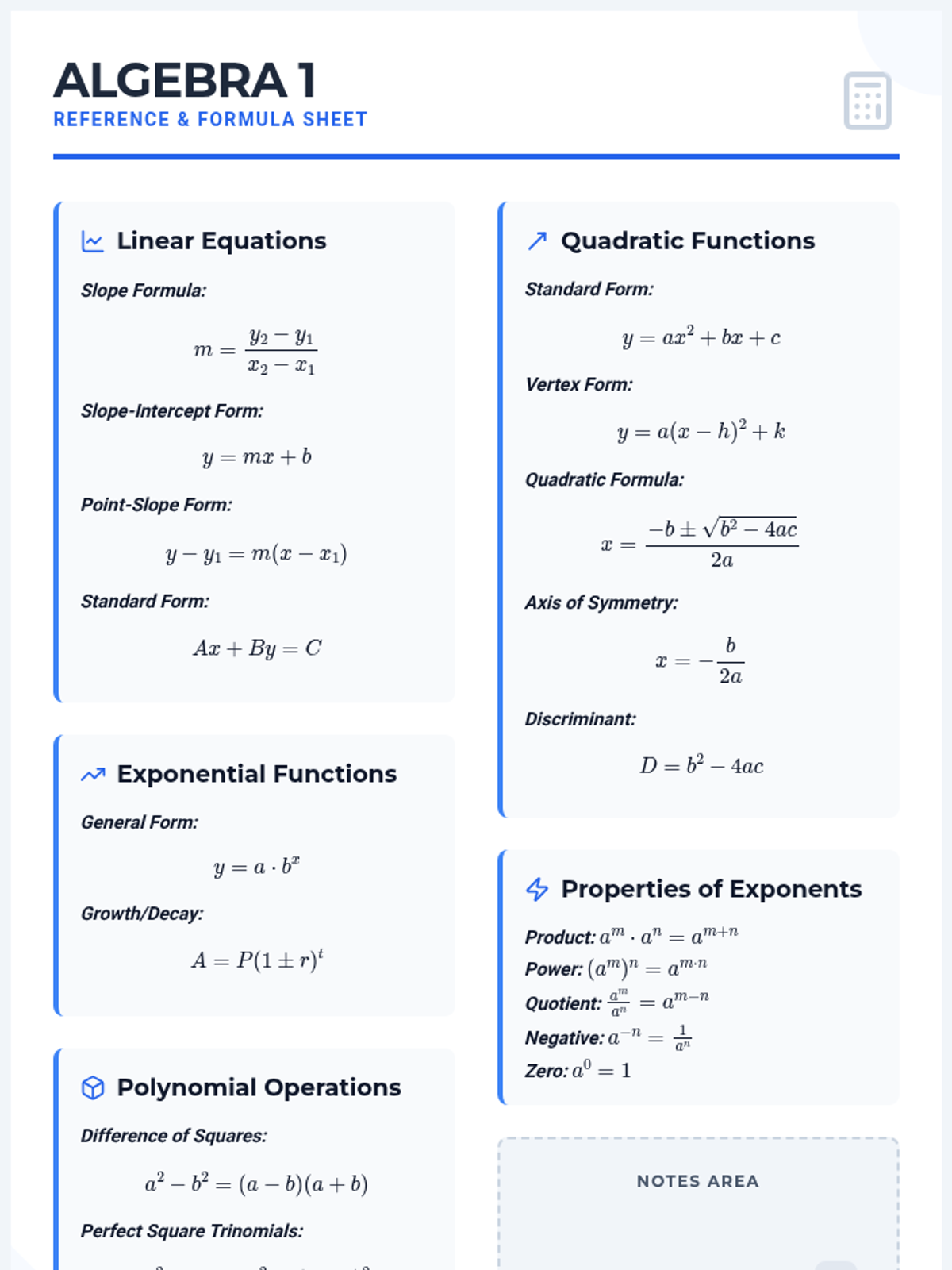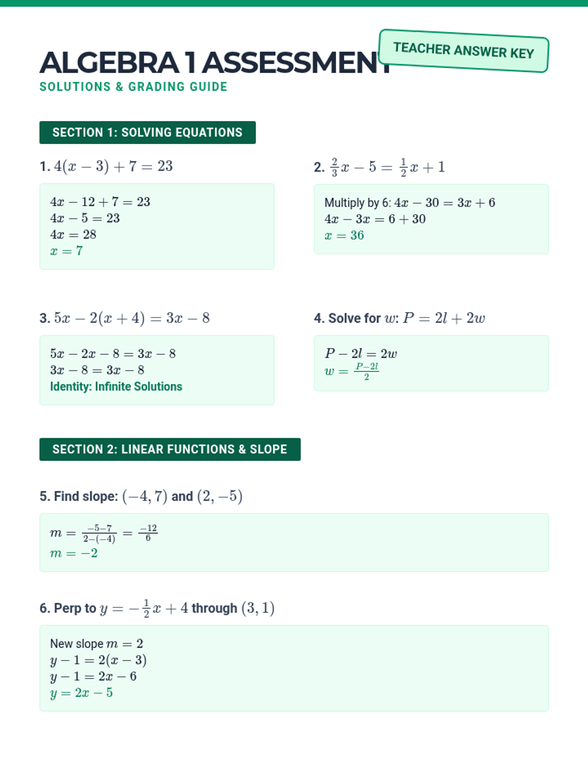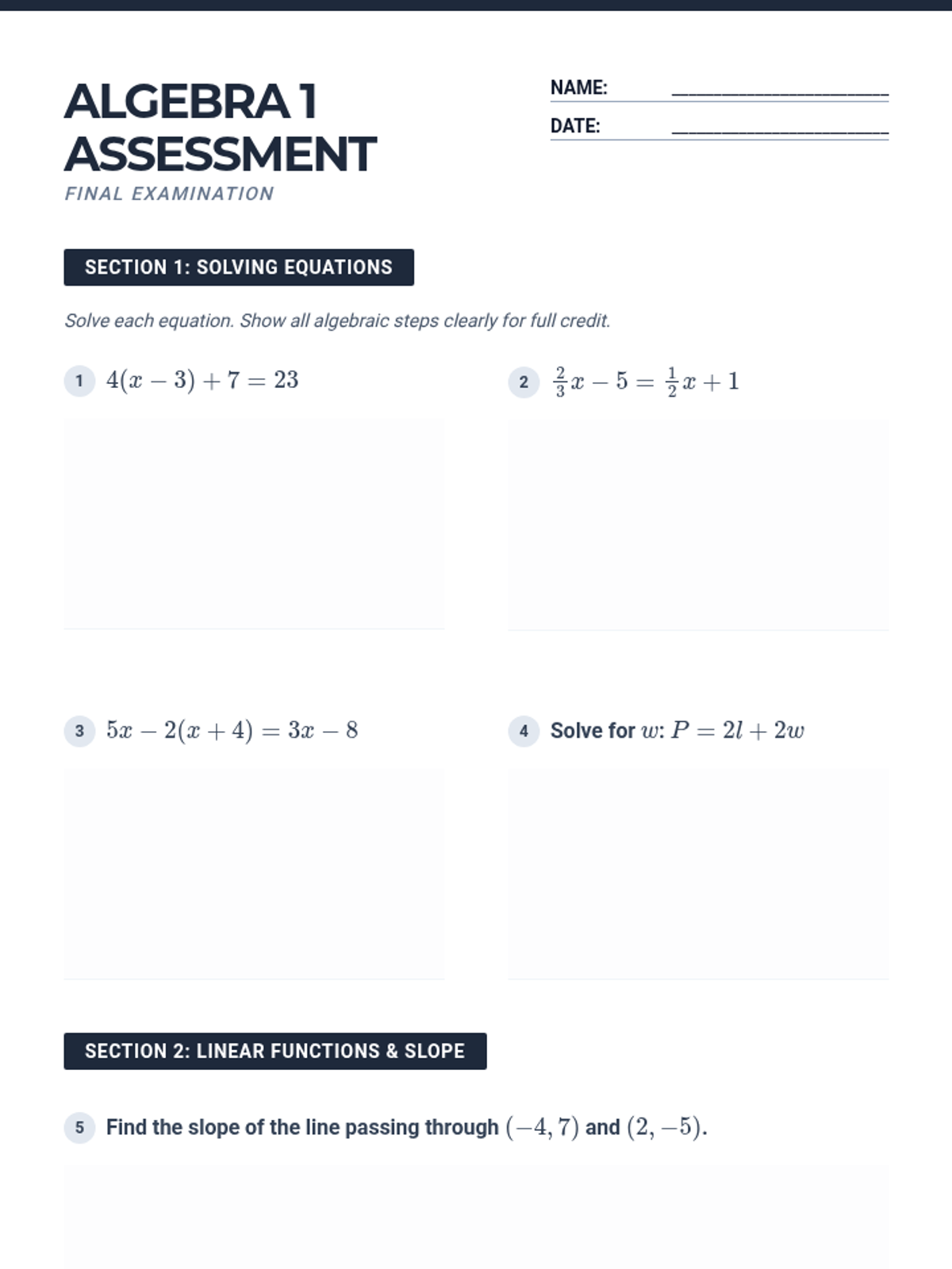 A comprehensive final assessment for Algebra 1 covering linear equations, systems, exponents, polynomials, and quadratic functions. Includes free response and graphing sections to evaluate deep understanding.