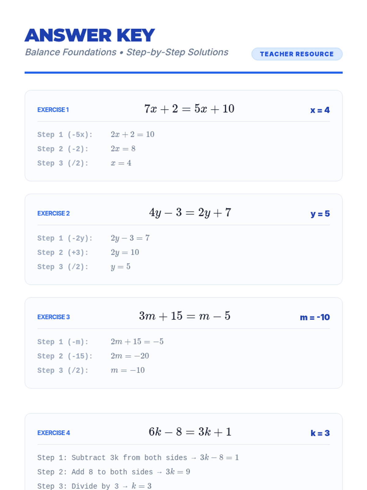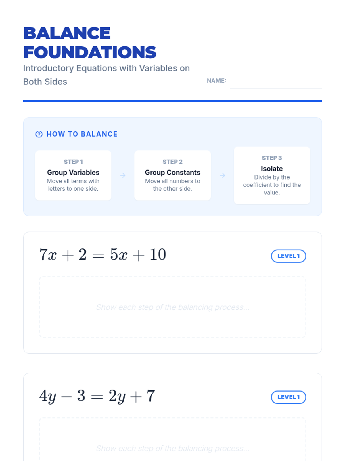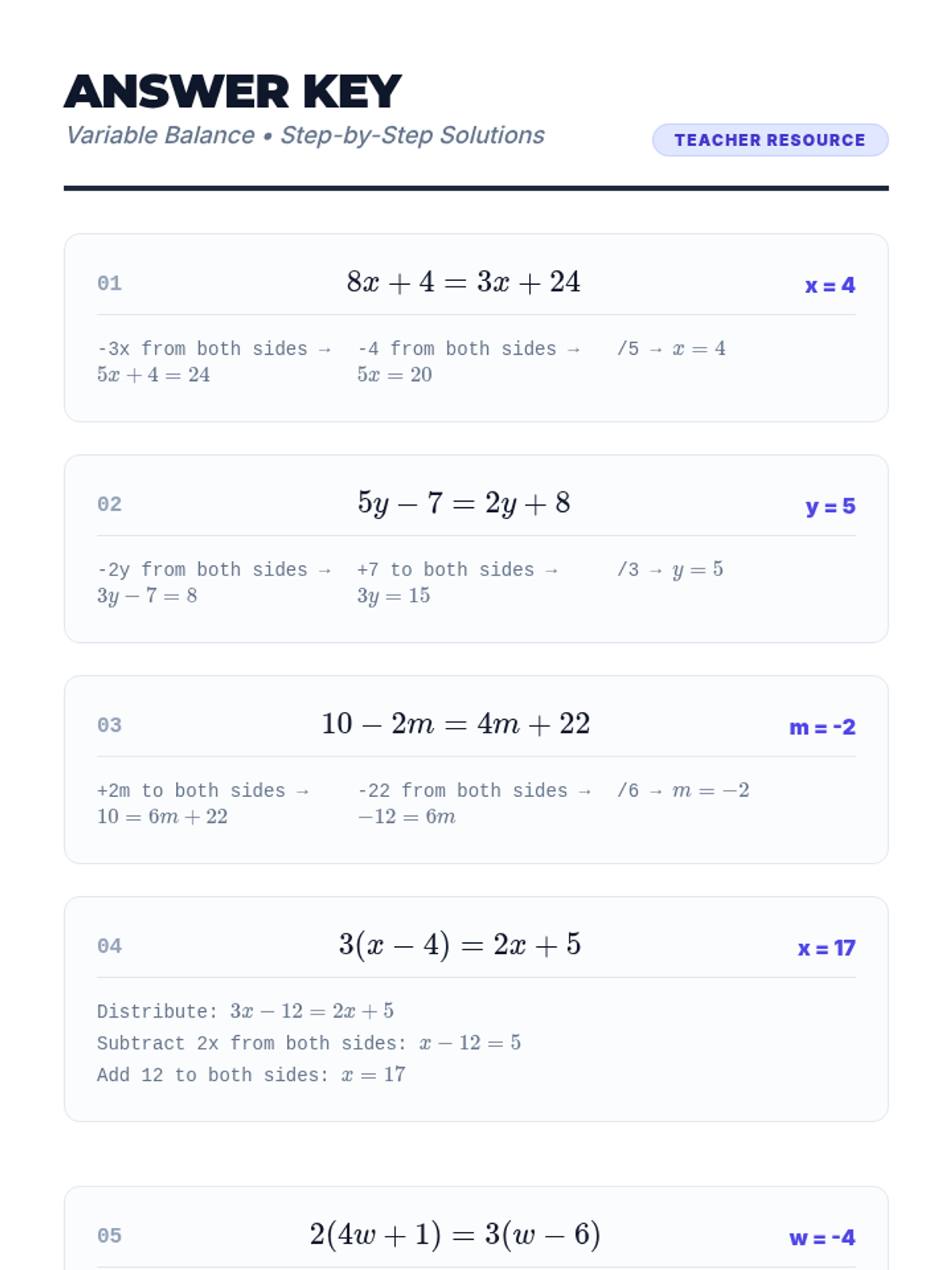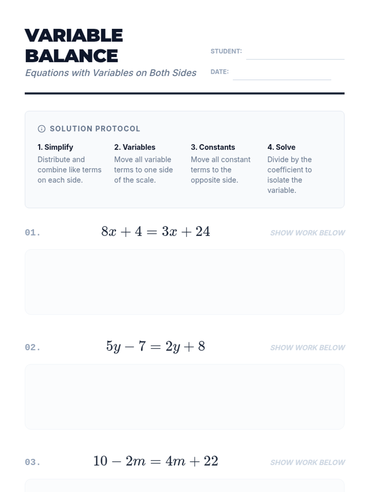Master the art of solving linear equations with variables on both sides using the balance method. Students will learn to simplify, move terms, and verify their solutions through a series of clear, structured exercises.