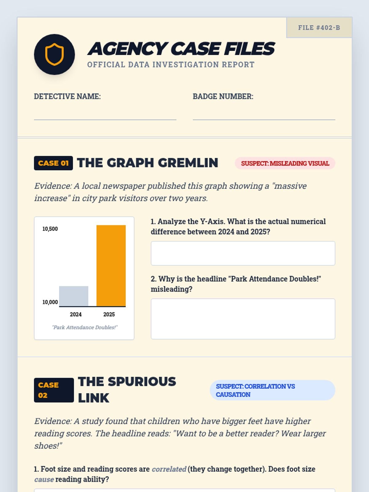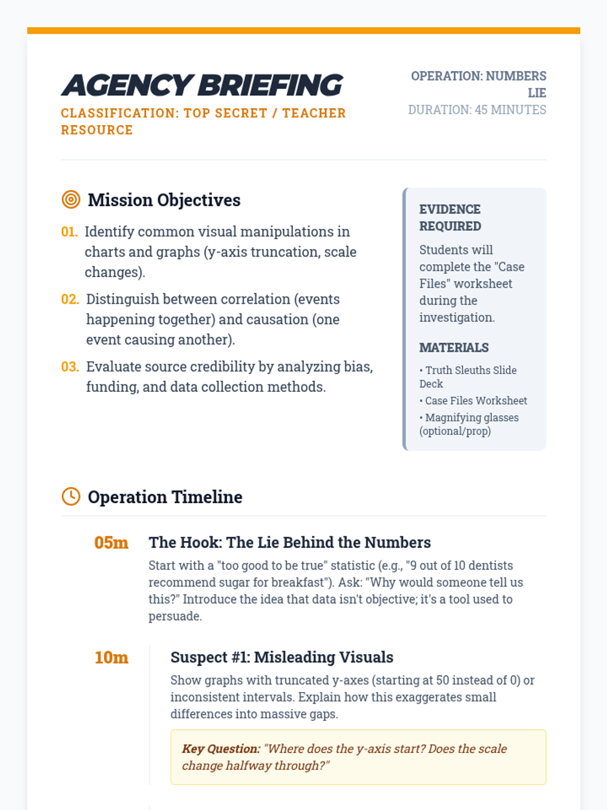 A 45-minute investigation into the world of data manipulation, covering misleading graphs, correlation vs. causation, and source credibility.