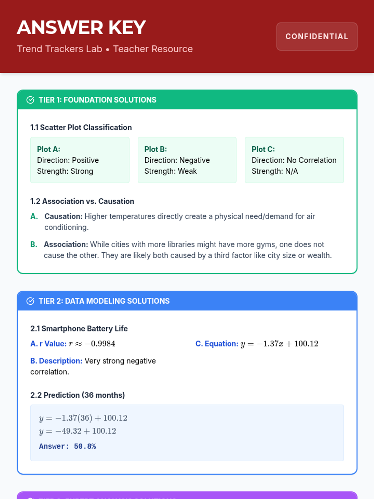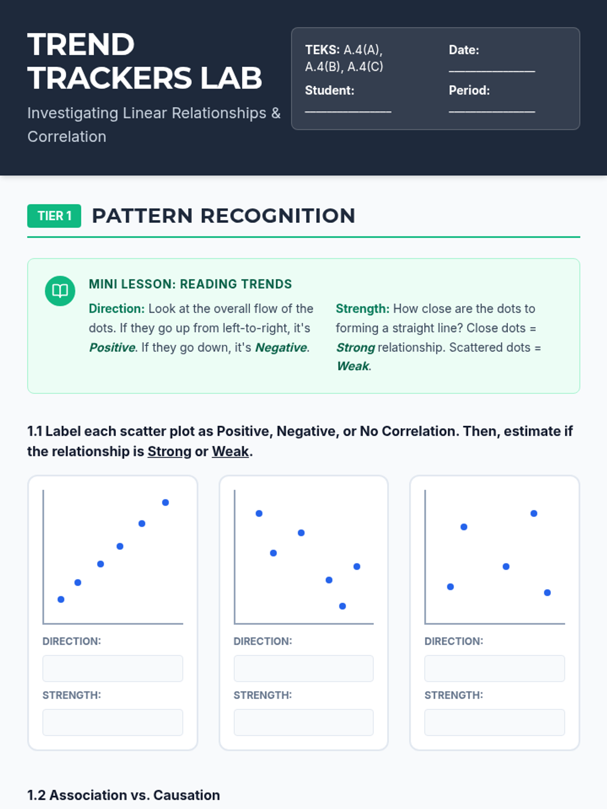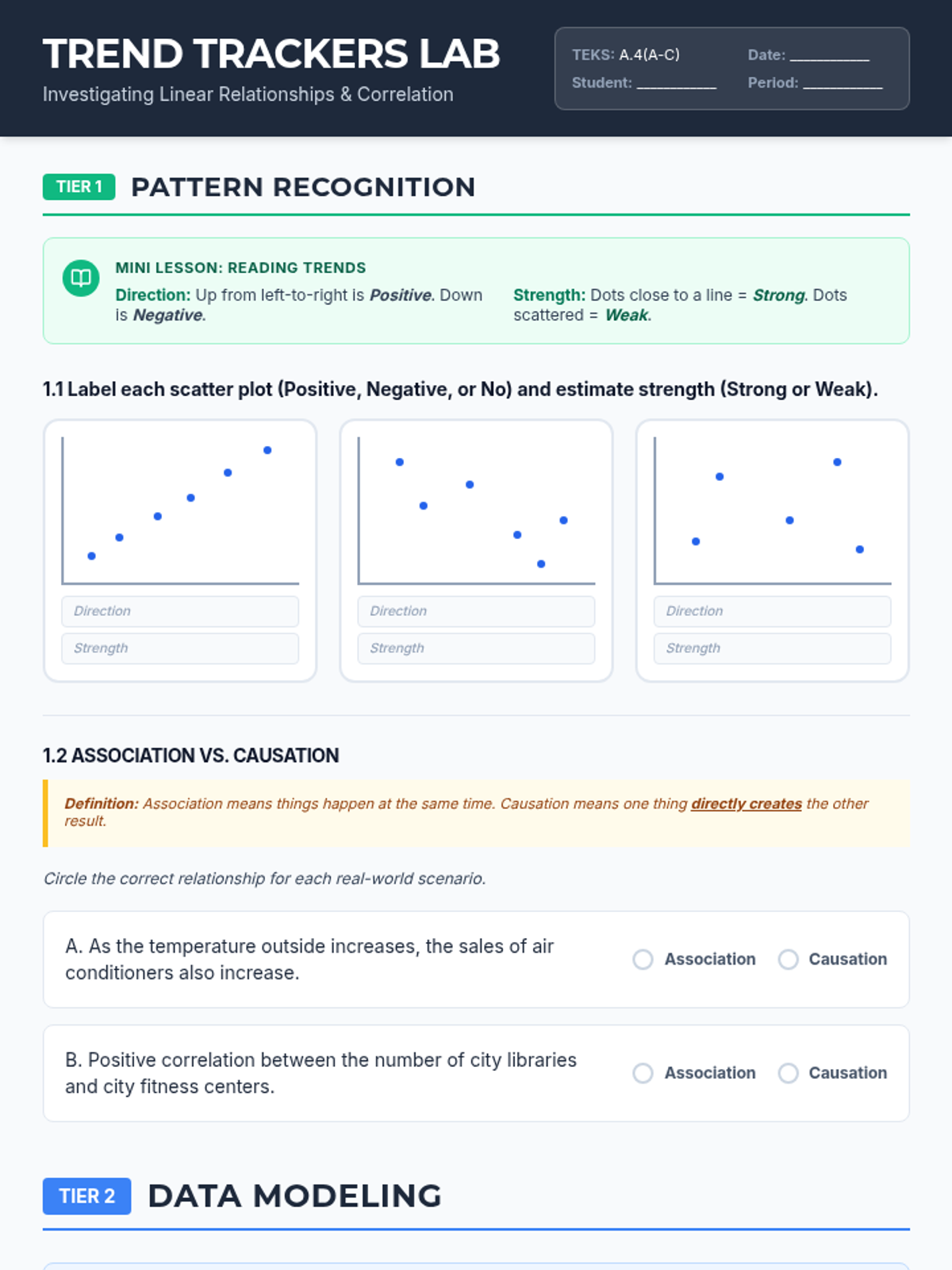 A tiered assignment covering TEKS A.4(A-C) focusing on correlation, causation, and linear regression. Students progress through three levels of complexity to master data analysis skills.