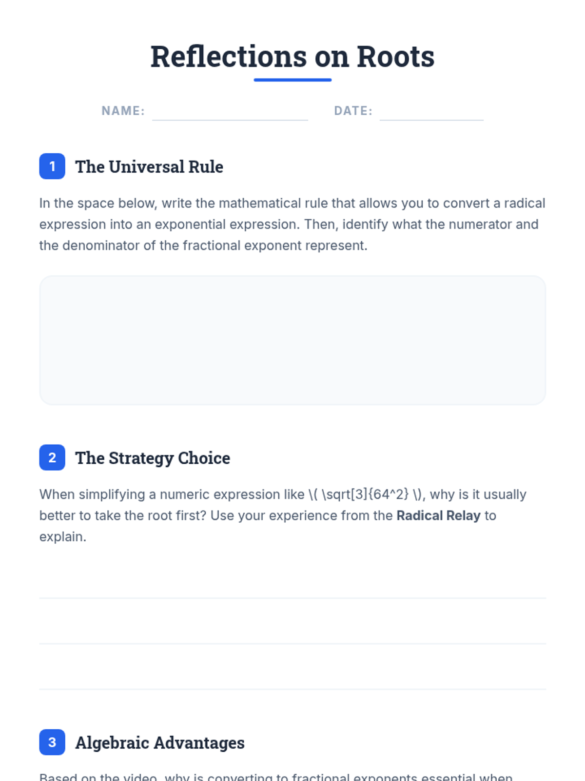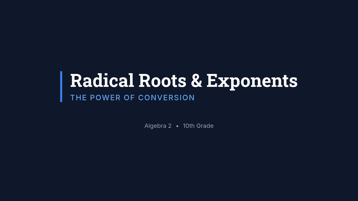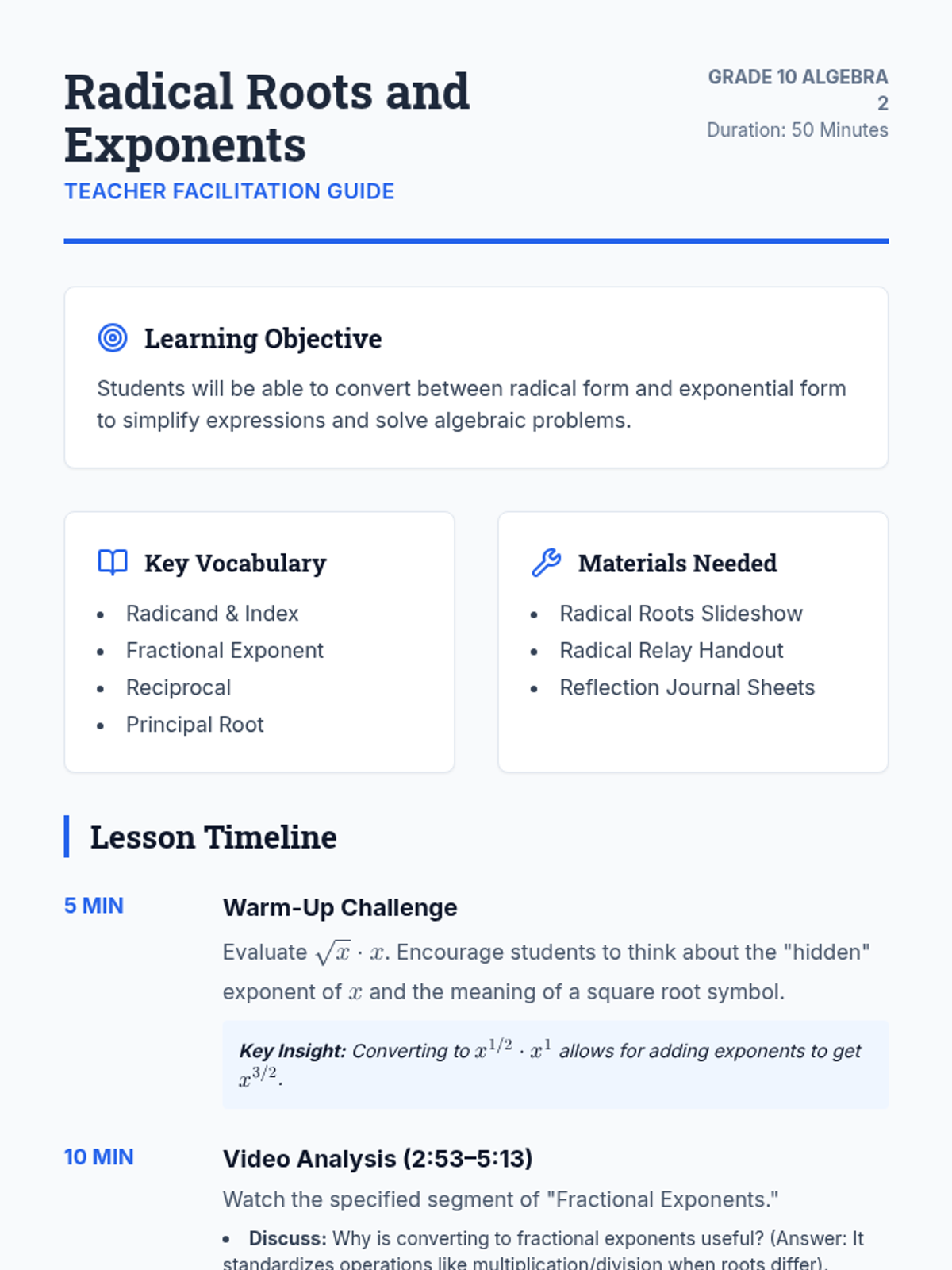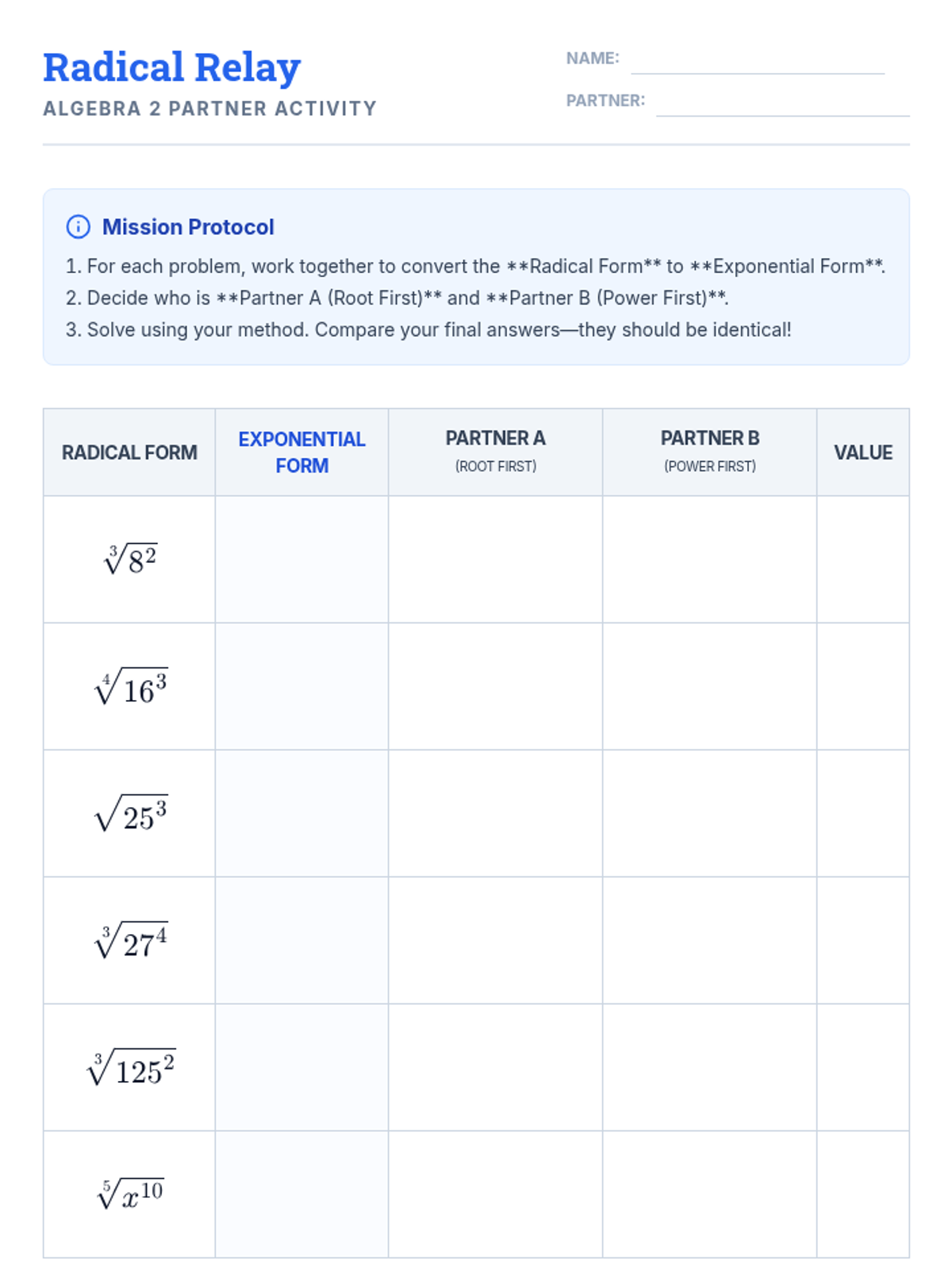 A comprehensive lesson for Algebra 2 students on converting between radical and exponential forms, featuring a 'Radical Relay' partner activity and video-based instruction.