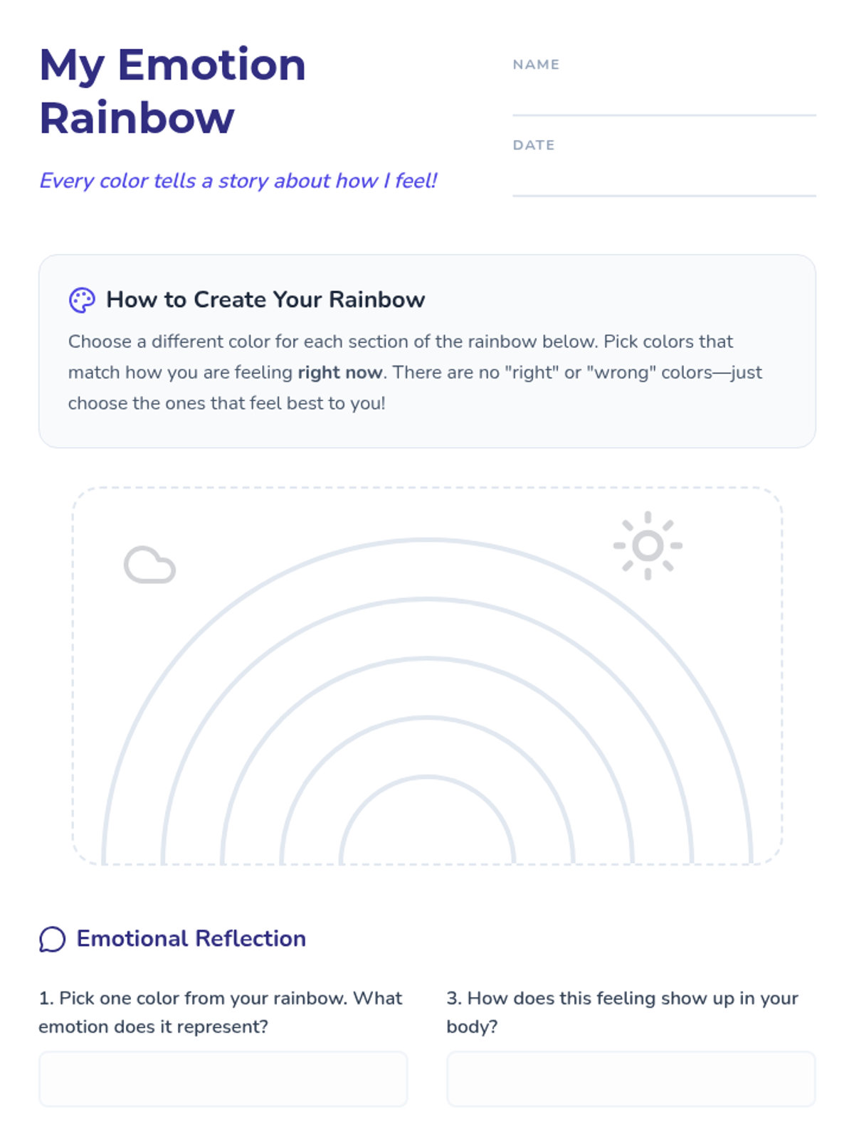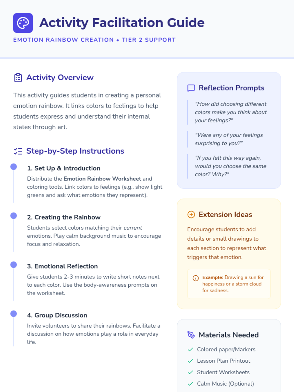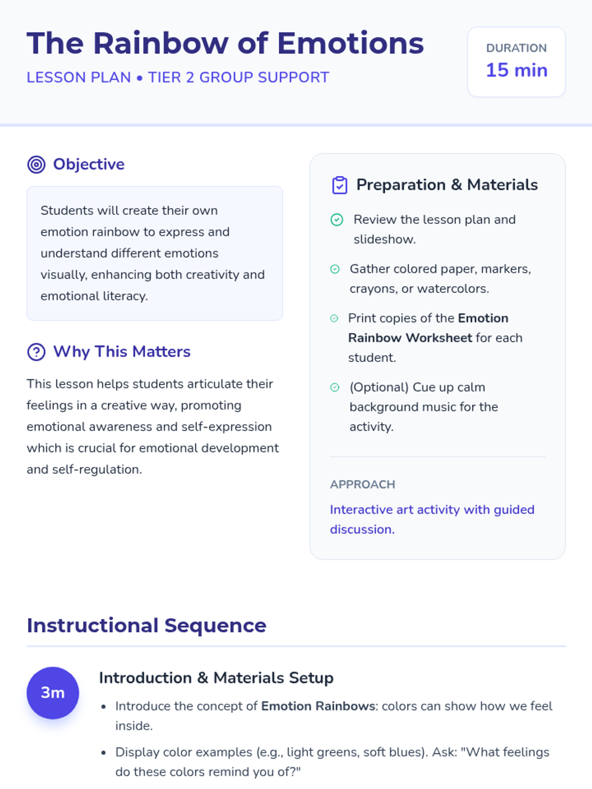 A 15-minute Tier 2 group lesson for 3rd graders to explore and express their feelings by creating a personal 'emotion rainbow.' students will map colors to emotions and reflect on their current emotional state through art.