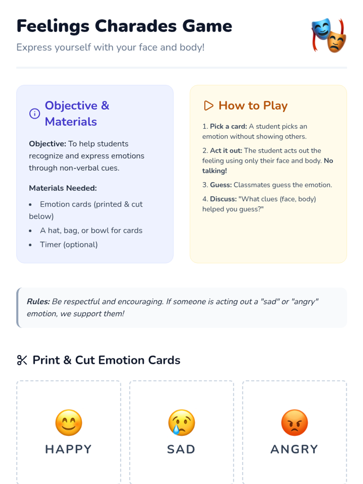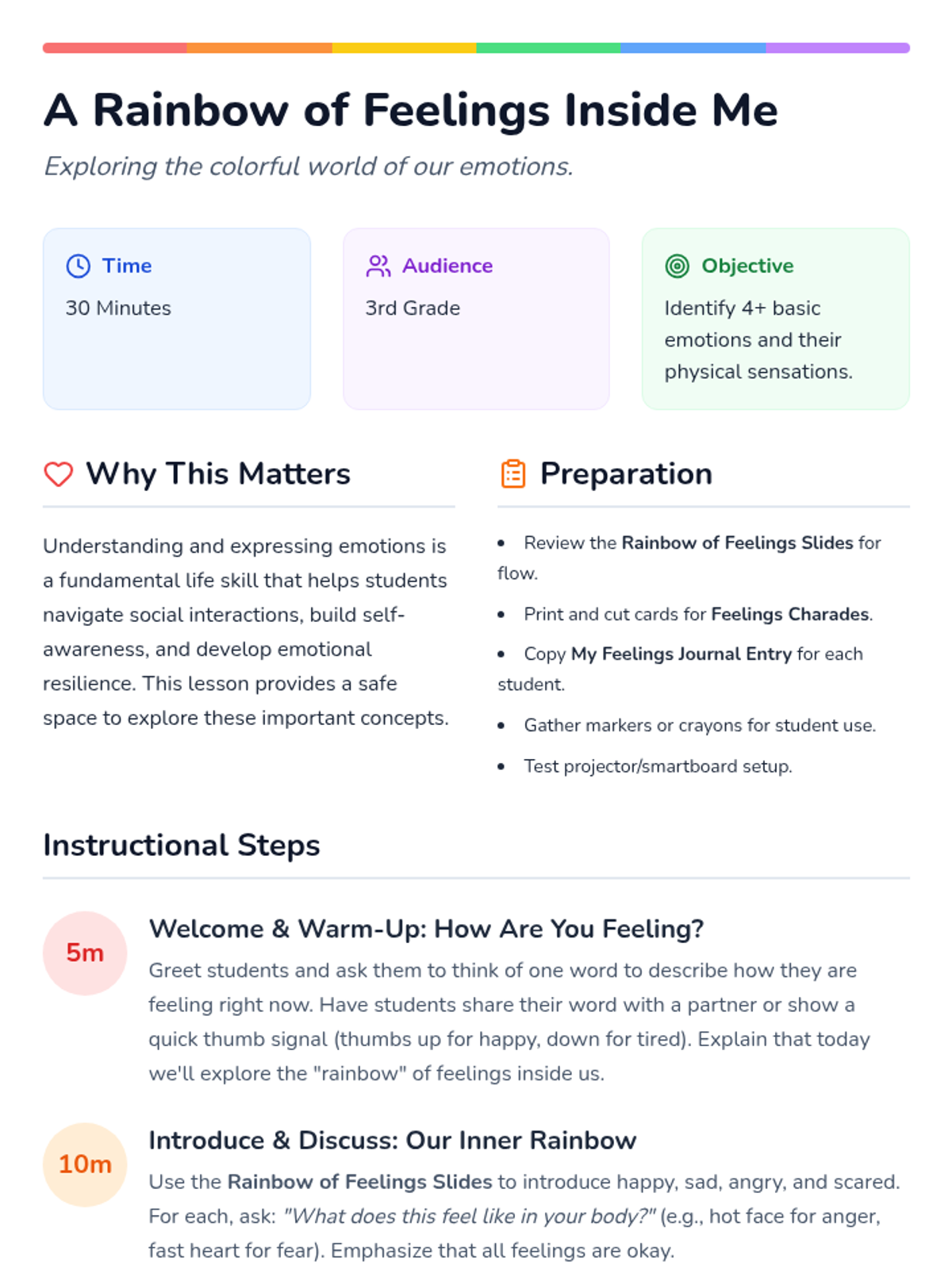 A 30-minute lesson for 3rd graders to identify emotions, understand physical sensations of feelings, and practice emotional expression through games and journaling.