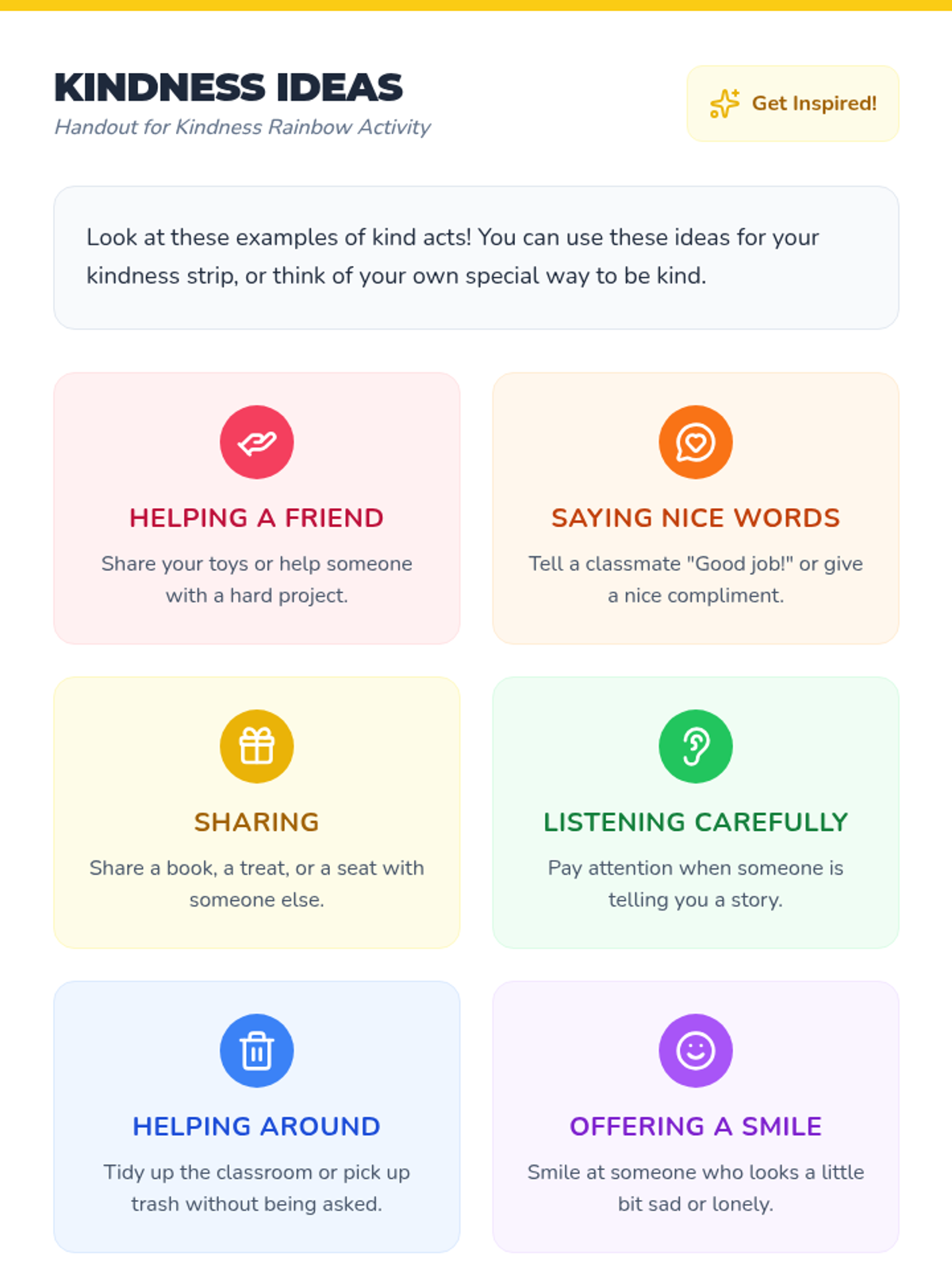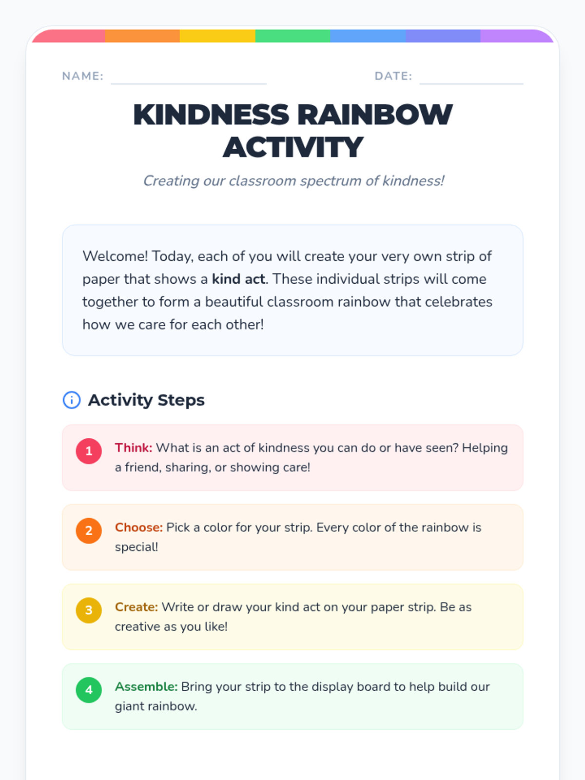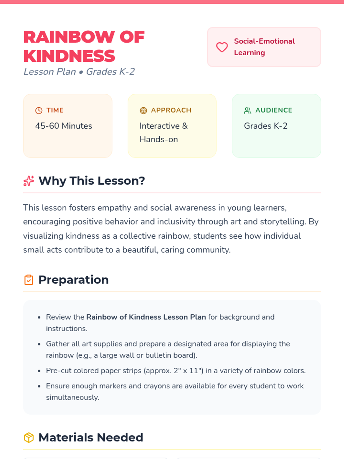 A social-emotional learning lesson for grades K-2 focused on empathy and kindness through a collaborative art project. Students will identify kind acts and contribute to a classroom-wide rainbow display.