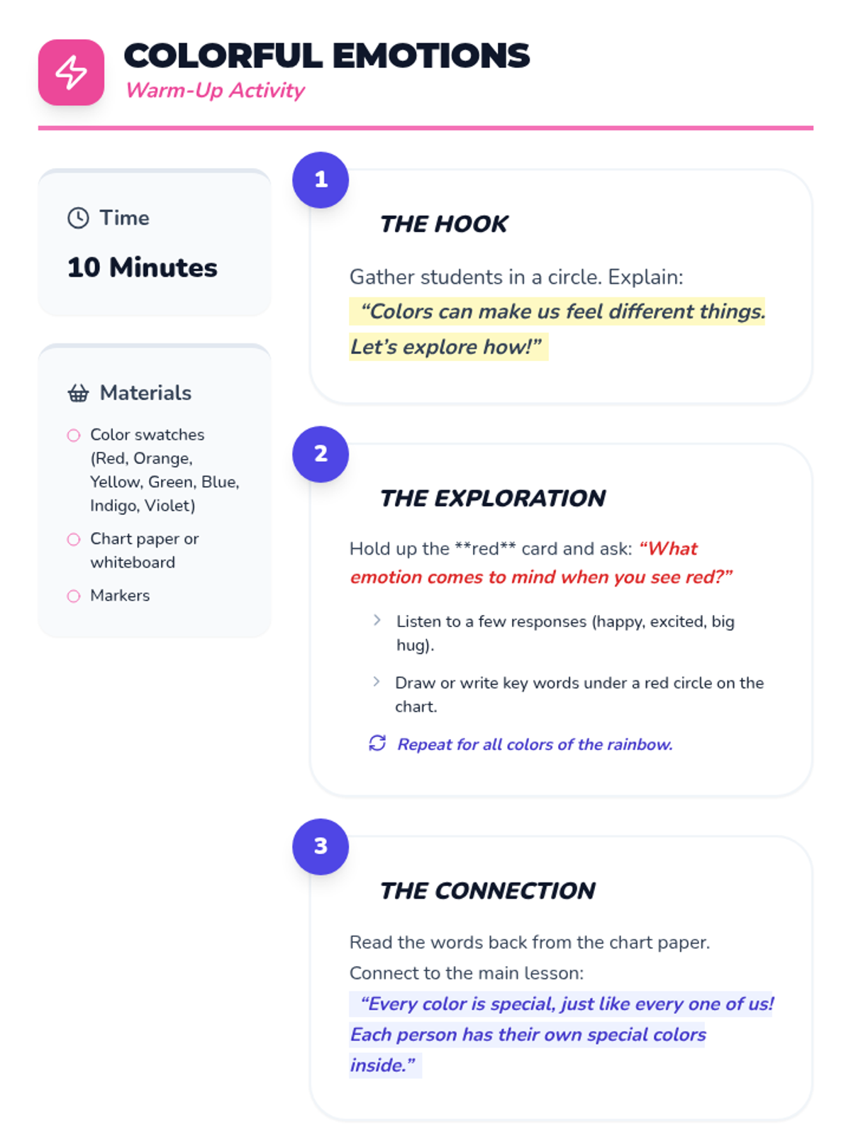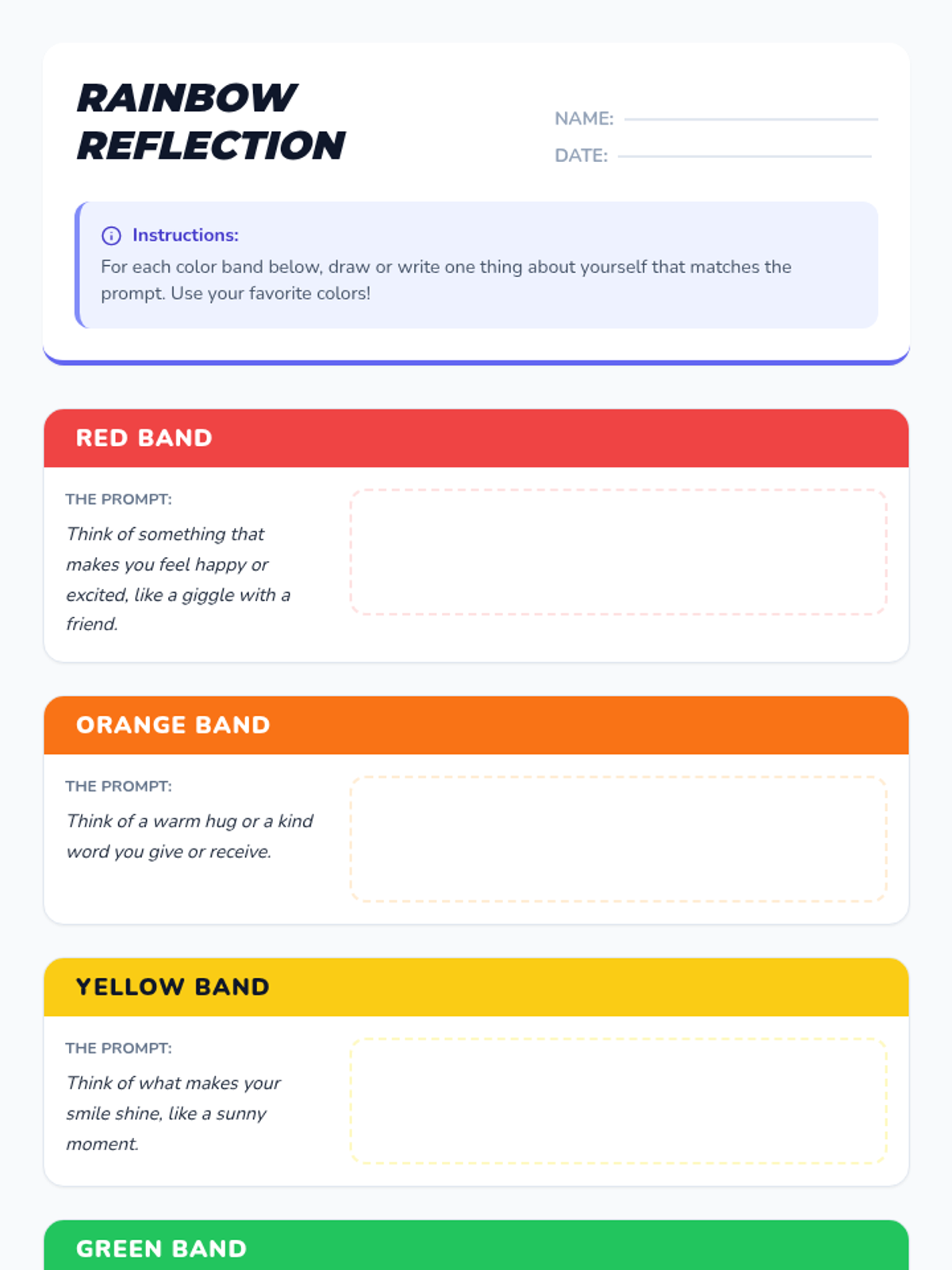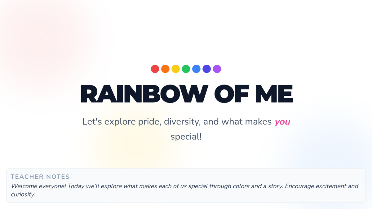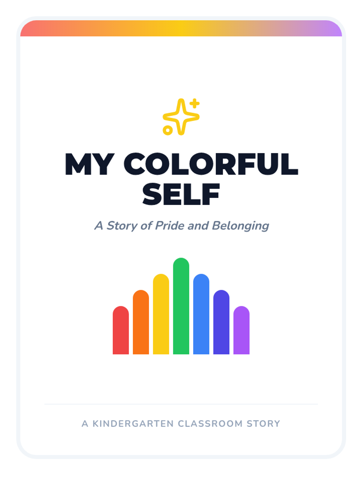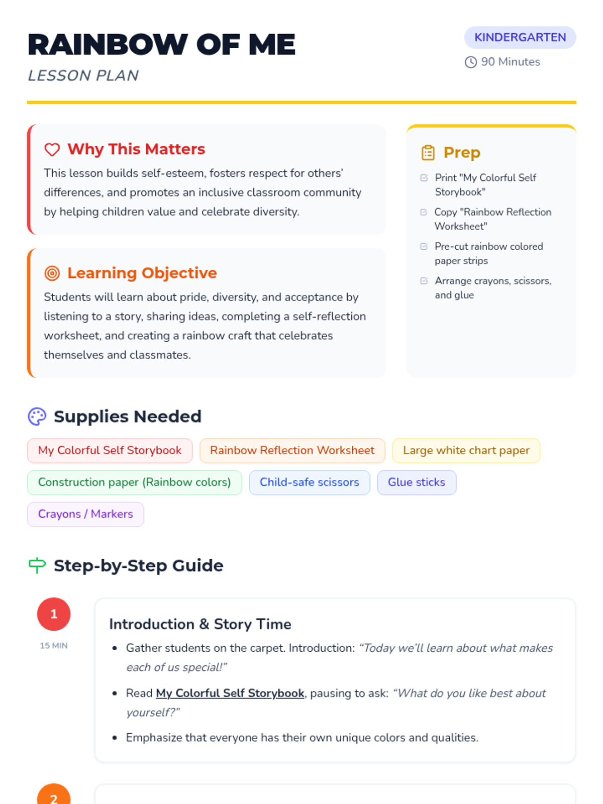 A 90-minute kindergarten lesson where students explore pride, diversity, and acceptance through a story, group discussion, a self-reflection worksheet, and a hands-on rainbow craft.