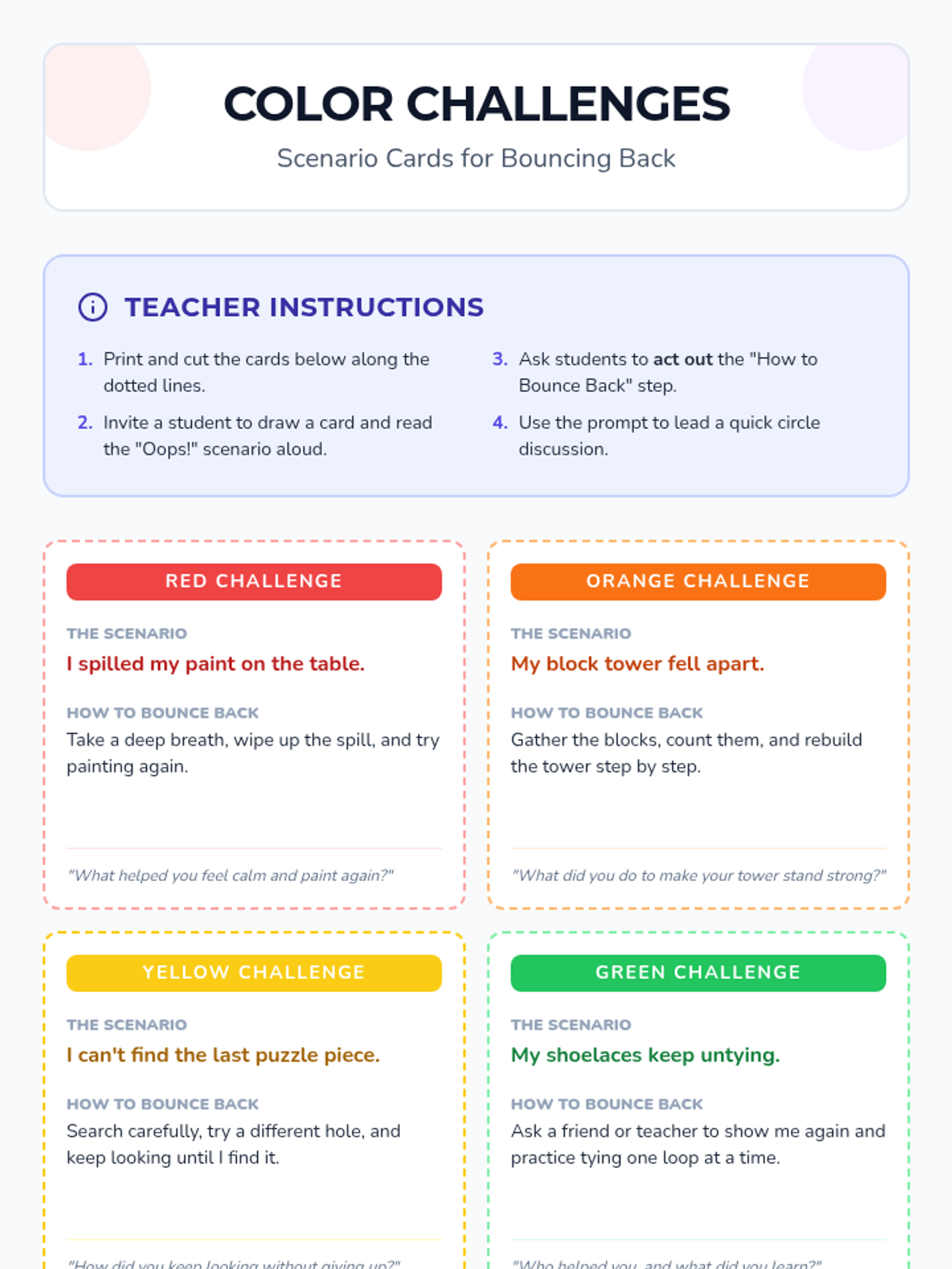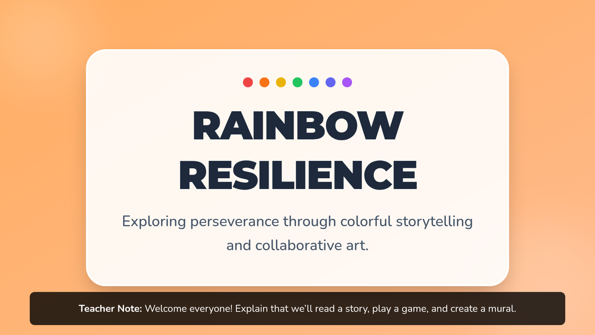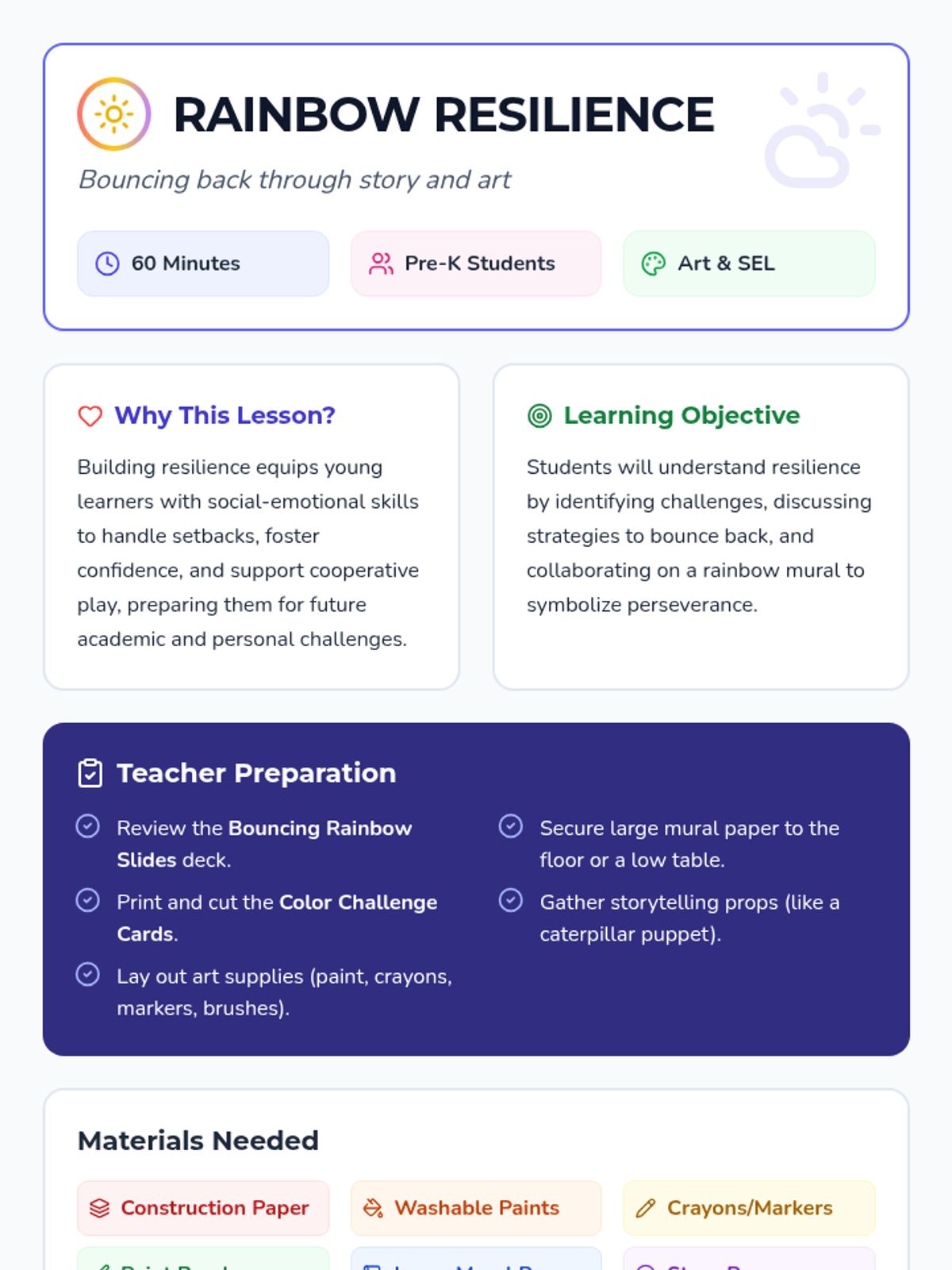 A Pre-K lesson that introduces the concept of resilience through storytelling, a "Color Challenges" game, and a collaborative rainbow mural. Students learn to recognize challenges and practice 'bouncing back' in a supportive environment.