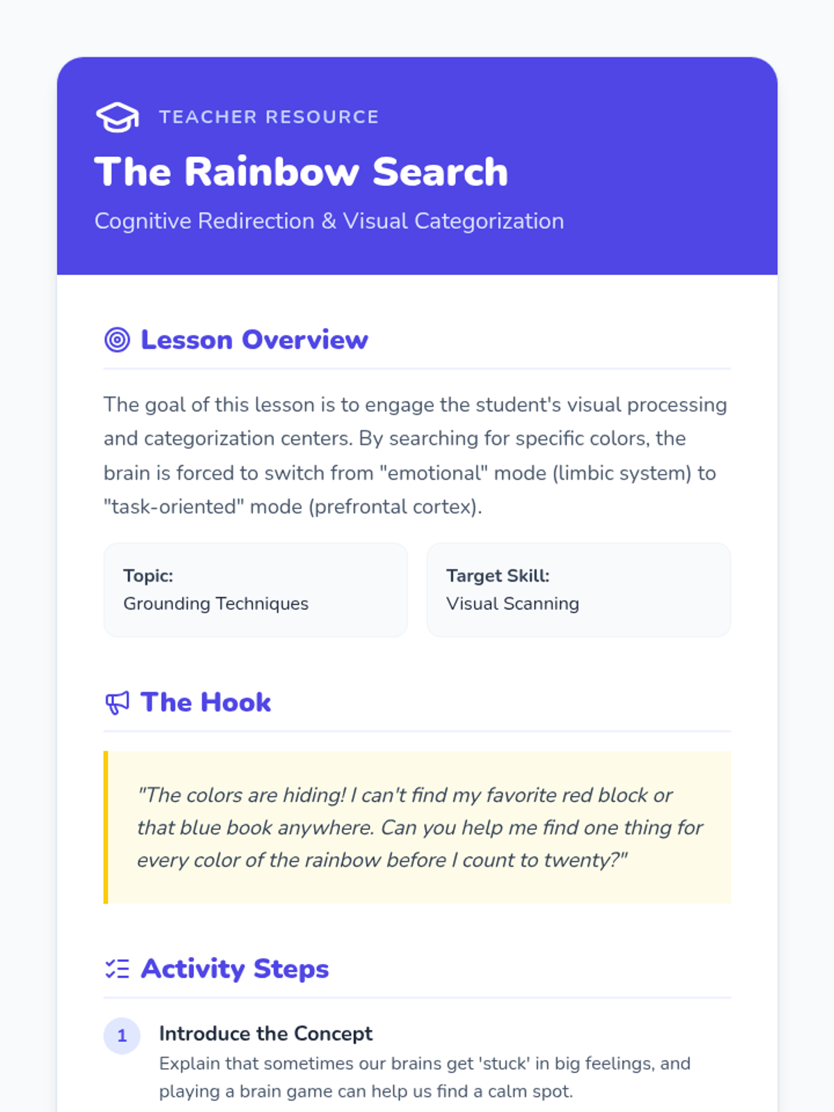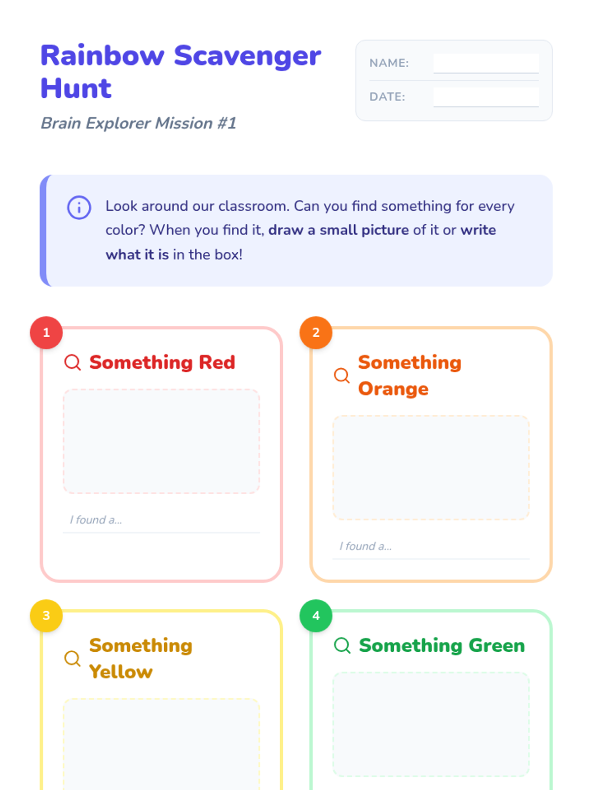 Students actively move around the room to find objects for every color of the rainbow, shifting from emotional processing to visual categorization.