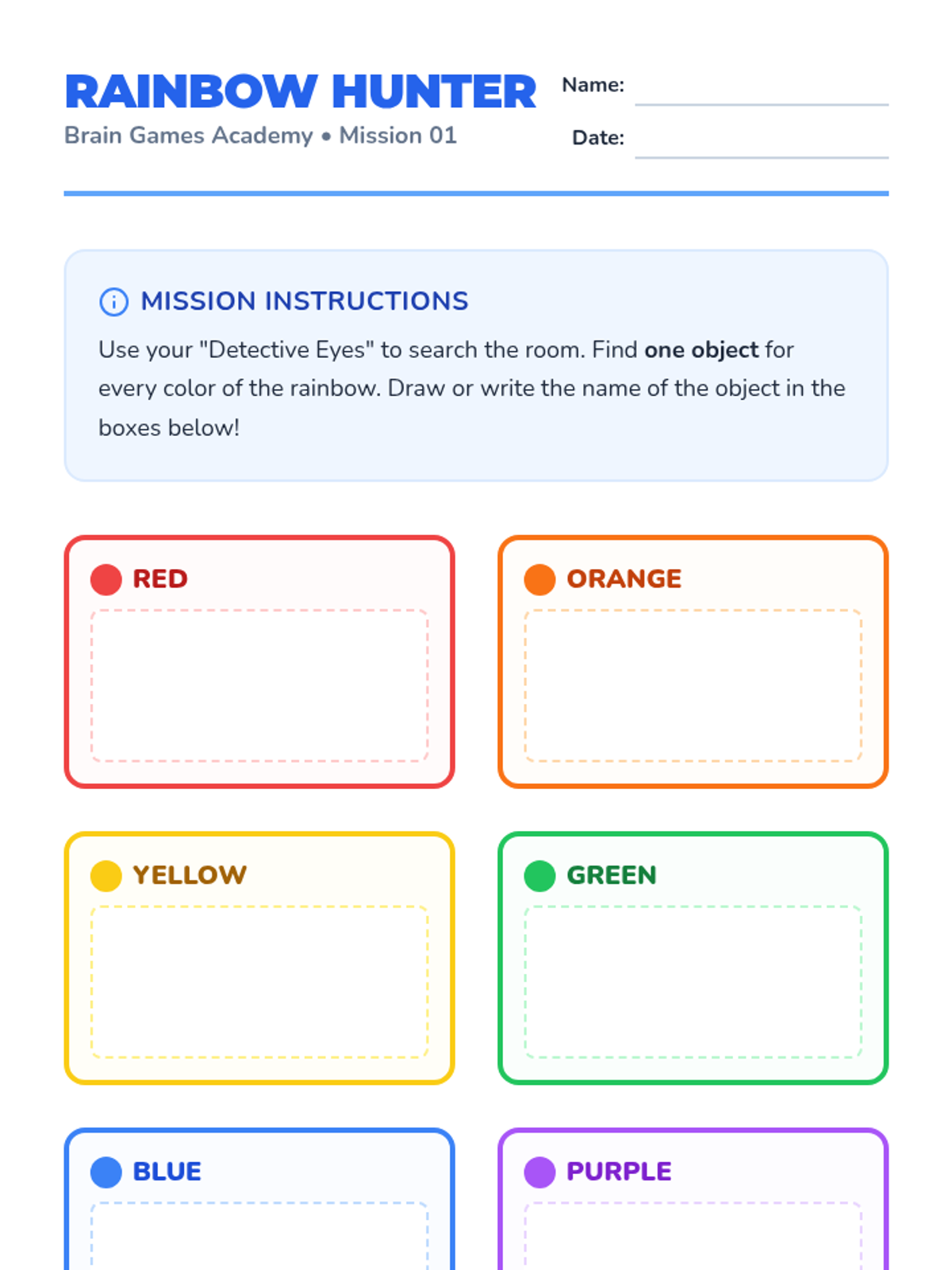 Students learn to scan their environment for specific colors in rainbow order. This simple visual search task teaches them how to voluntarily shift their attention away from internal feelings to external objects.