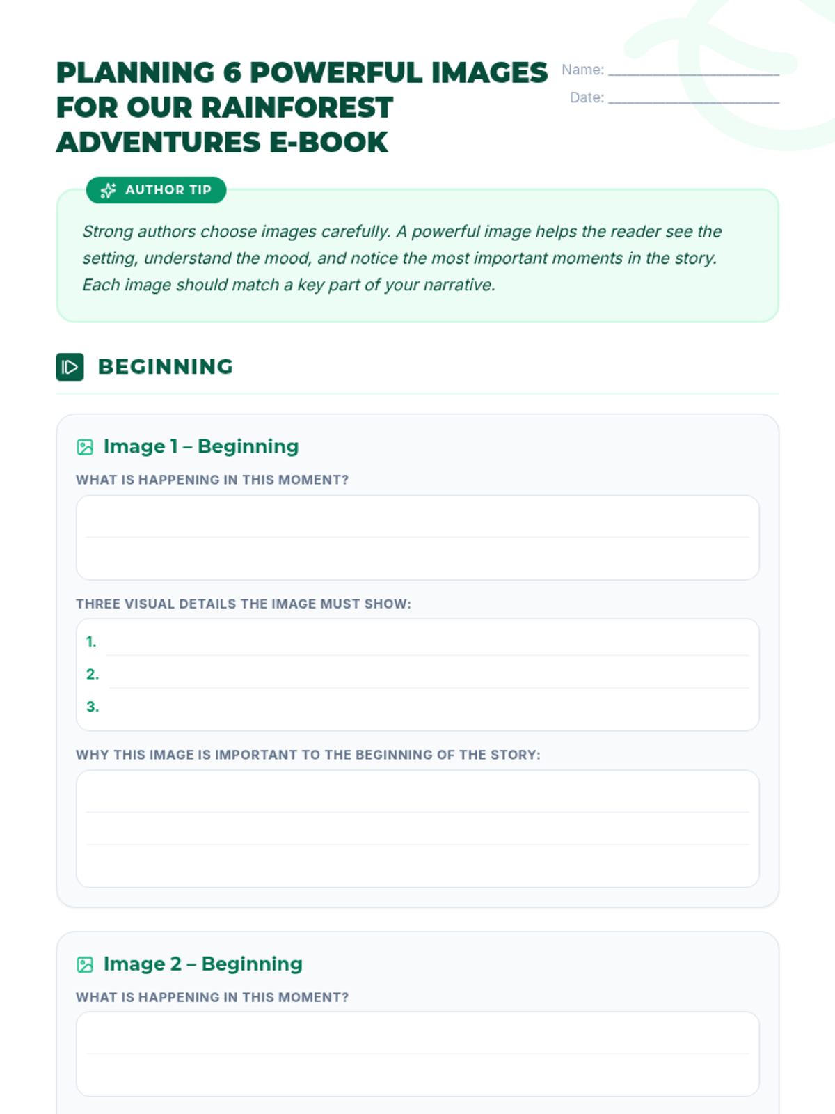 A lesson focused on planning visual elements for a digital book about rainforest adventures, helping students connect narrative moments with powerful imagery.