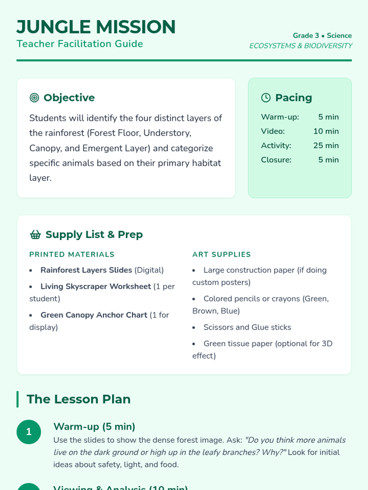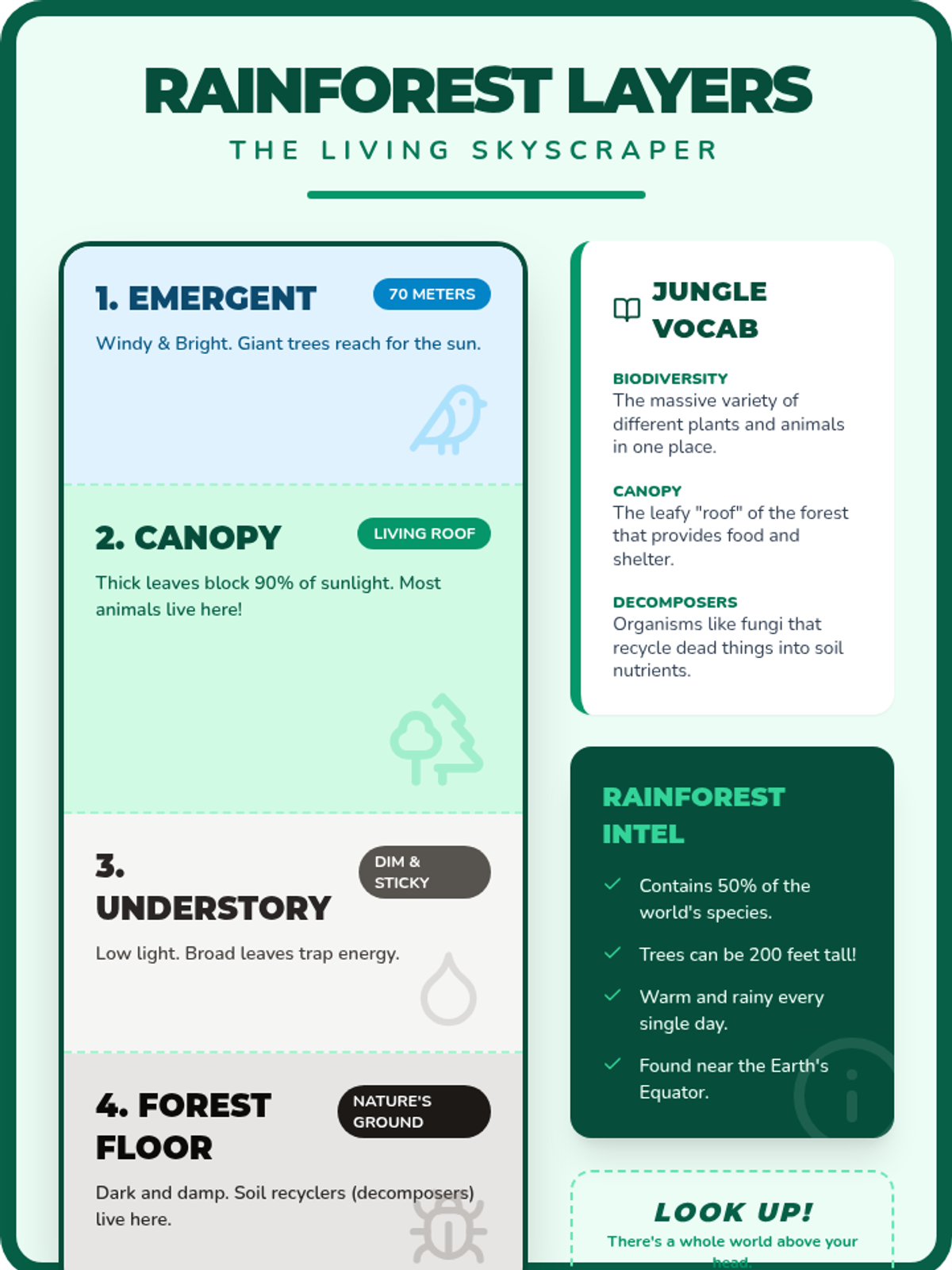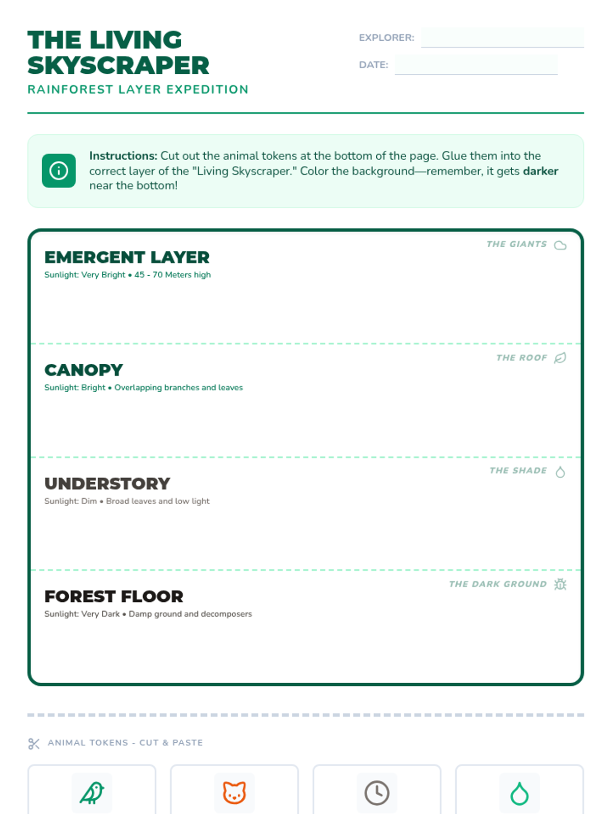 Students will explore the vertical stratification of tropical rainforests, identifying the characteristics of the Forest Floor, Understory, Canopy, and Emergent Layer while categorizing the diverse wildlife that inhabits each level.