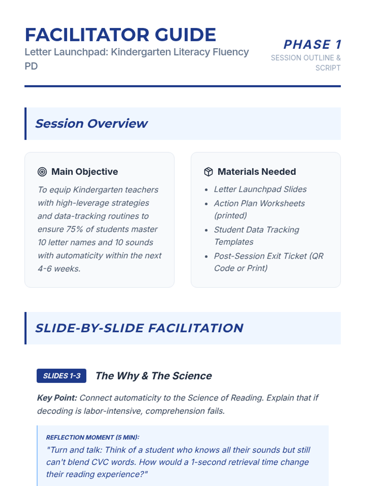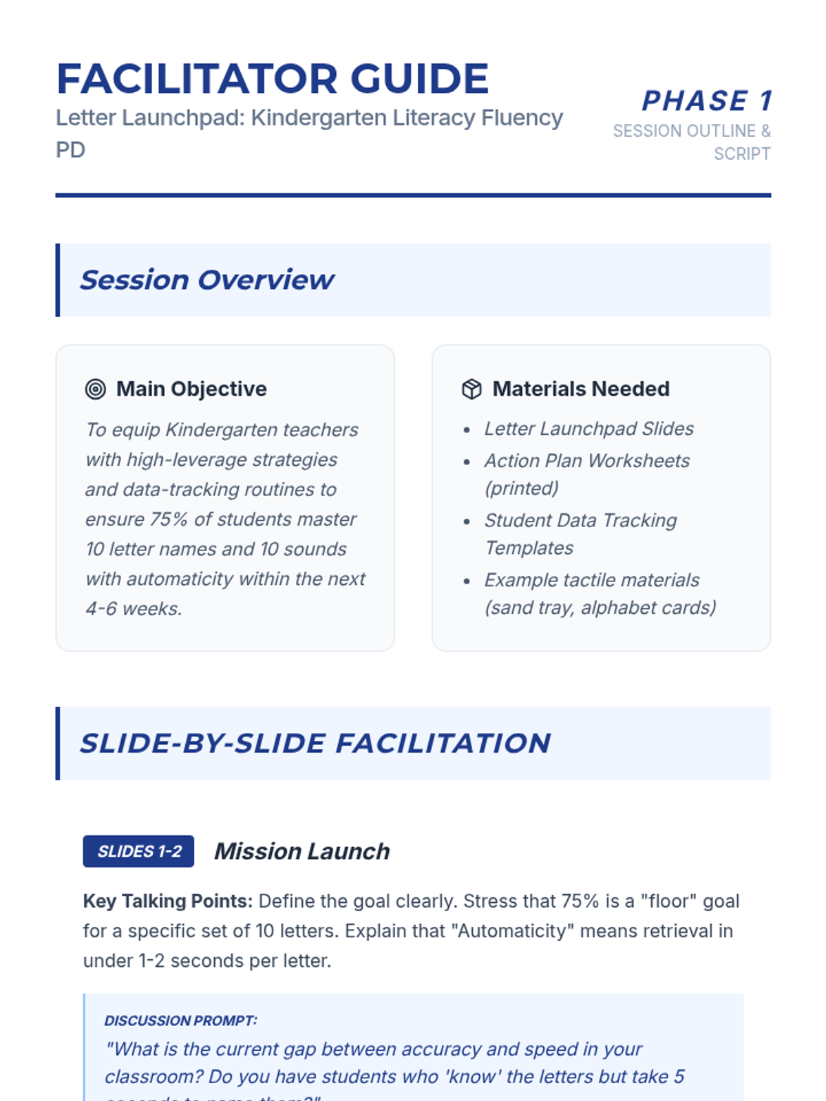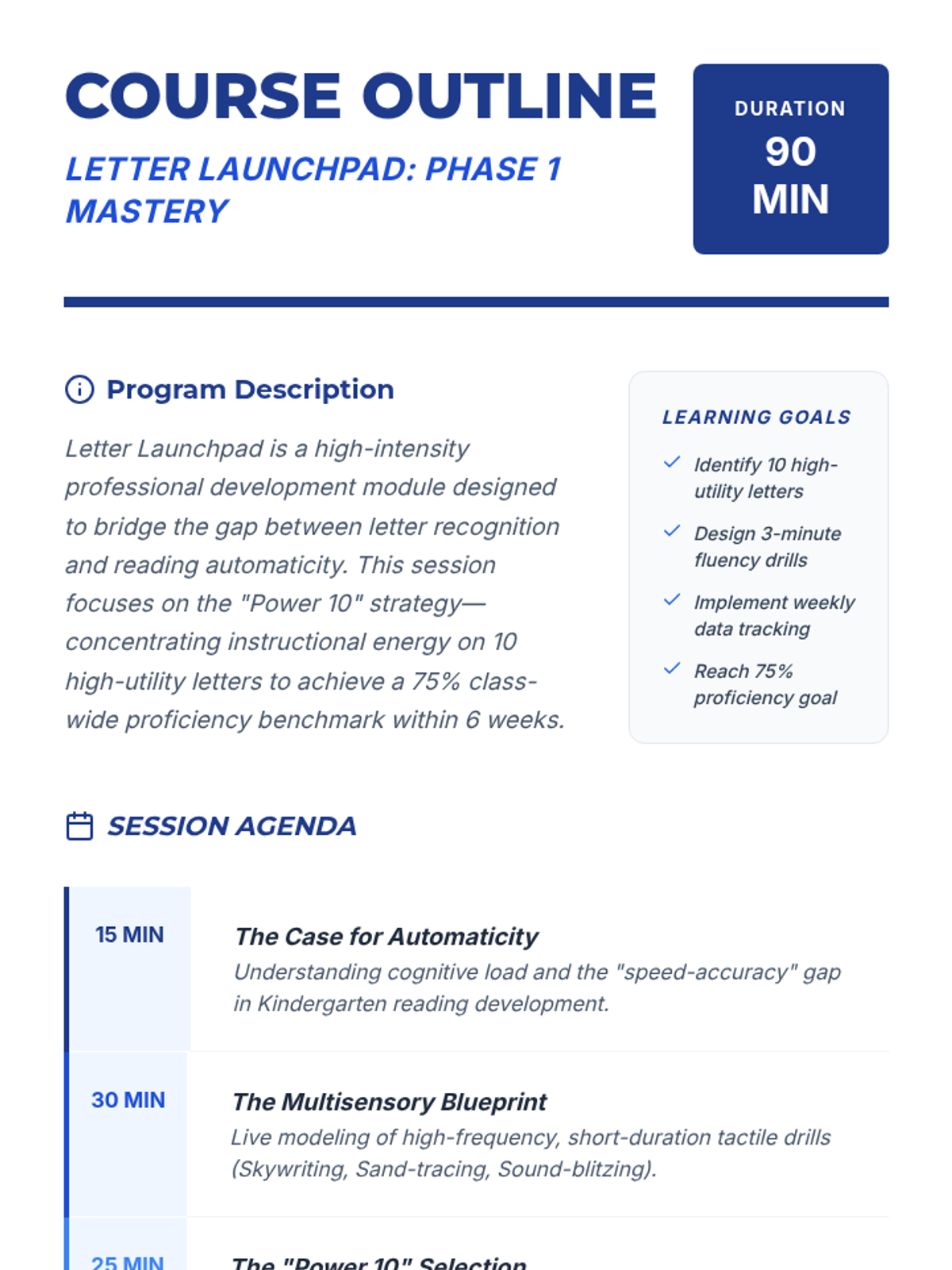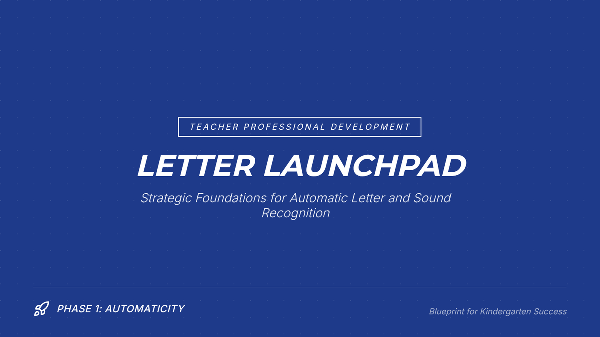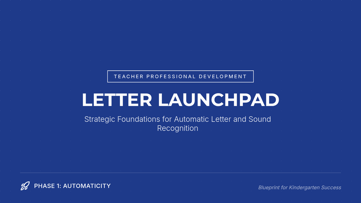 A professional development session for Kindergarten teachers focused on high-leverage strategies to achieve 75% student proficiency in identifying 10 letter names and 10 letter sounds with automaticity.