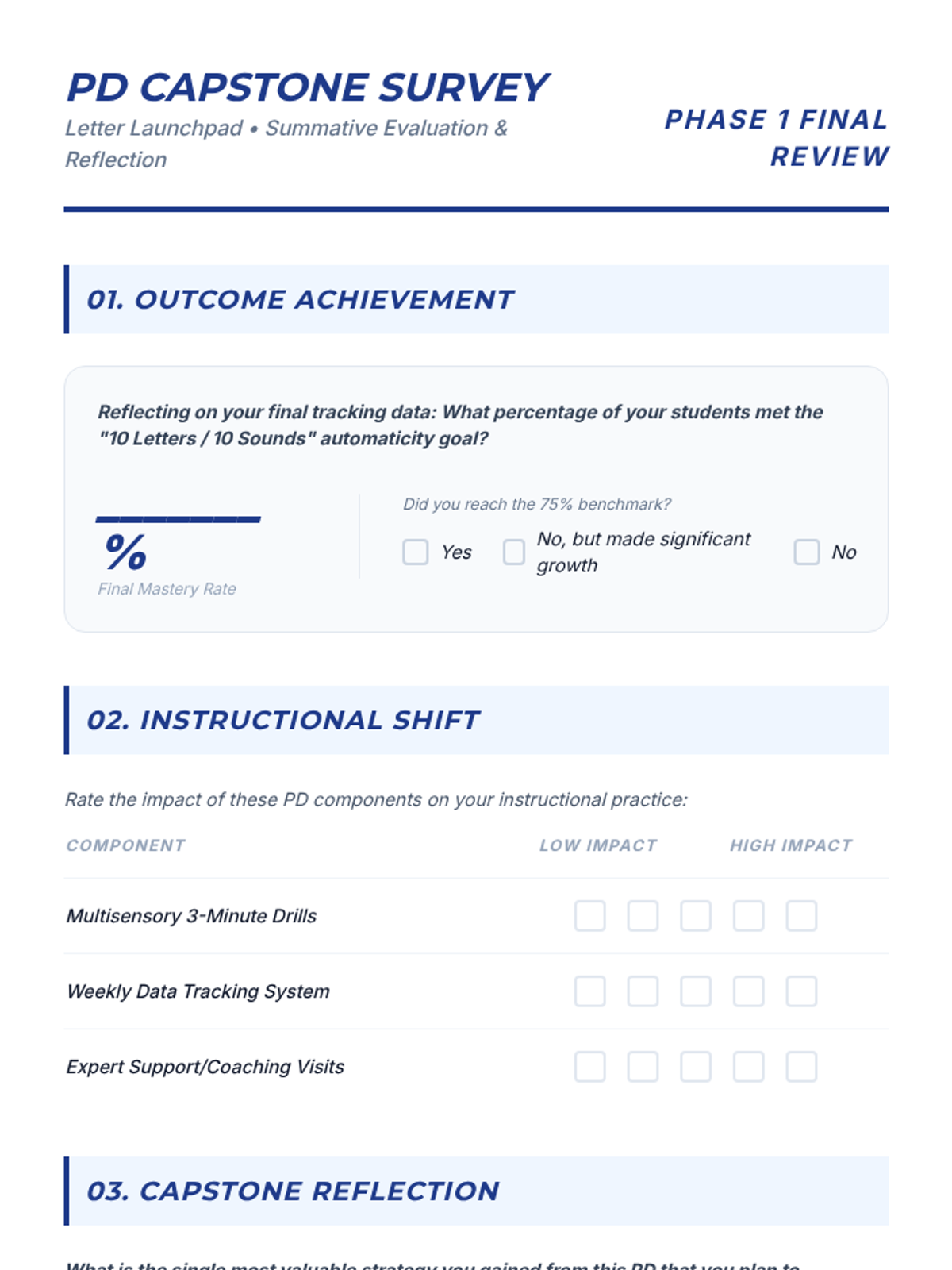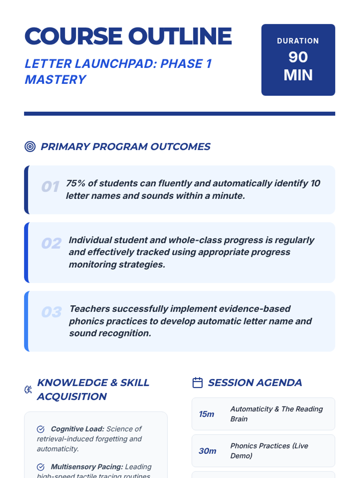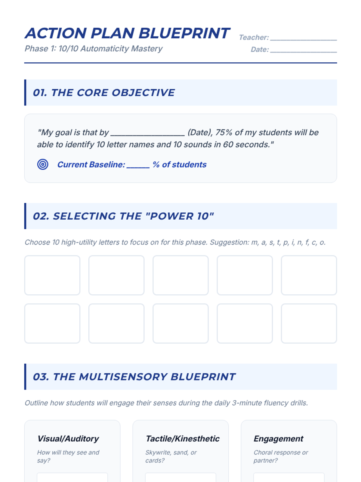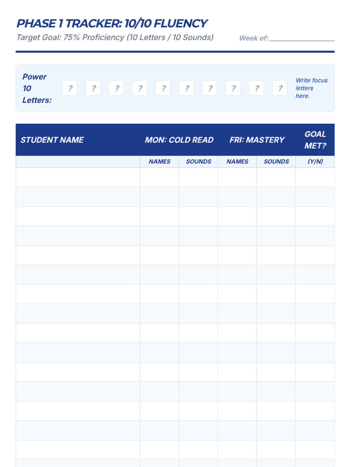 A professional development session for Kindergarten teachers focused on high-leverage strategies to achieve 75% student proficiency in identifying 10 letter names and 10 letter sounds with automaticity.